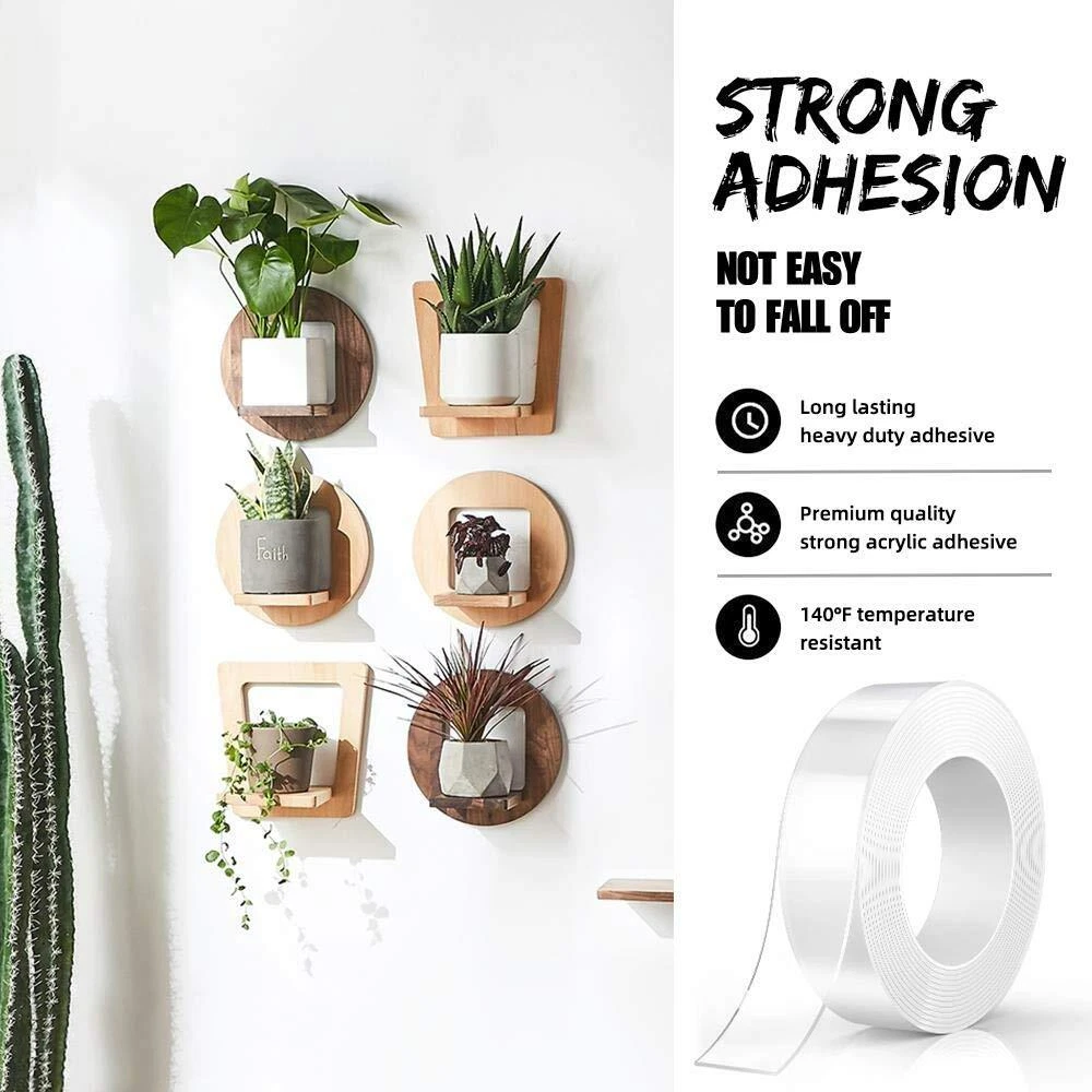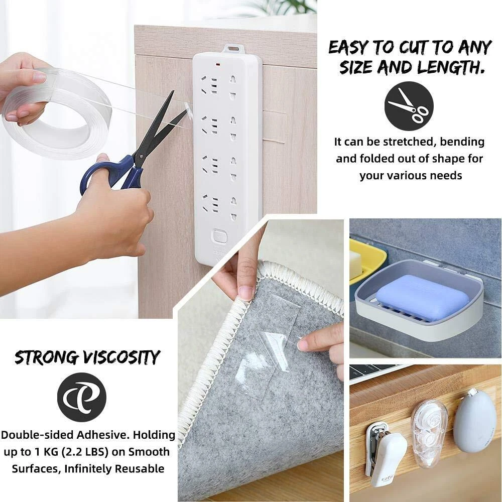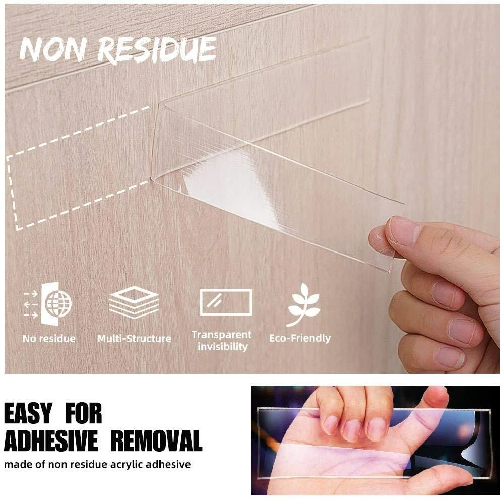Double-Sided Nano Adhesive Tapes Features: 1. Made of high quality nano-pu gel material,length 5M/16.4FT, width 30mm, thickness 1mm. Sturdy and durable, double-sided adhesives, environmentally friendly, heat resistant(-16C (0F) or above 62C (150F),transparent, washable, reusable, easy to remove, leave no traces on the wall or any surface. 2. It is easy to mount hooks, signs, numbers, pictures, car number plates etc. 3. Provides a quick and easy solution to mount and repair where traditional fasteners can't. 4. Alternative to nails, screws & glues. 5. Ideal for use on finished/painted surfaces, metal, plastic, vinyl etc. Suitable for exhibitions, home, office, kitchen, etc 6. Compare to super glue, our double-sided nano adhesive tape could offer you an option of taking it down at some point, so you may rearrange them at a later date. Useful Information: 1. Please clean the surface first before applying. Remove any residue or oil, These tapes work perfectly on most flat surface, such as dashboard(for toys), windshield, painted wood, metal surfaces, some textured tiles, etc. 2. DO NOT USE on drywalls & the surfaces that have a waxed layer, Adhesive pads can definitely rip paint! 3.When it gets dirty, you can wash it with water. DO NOT use any other wipes or detergent. You just need to wash and dry it to restore the sticky then reuse again Specification: Material: nano-pu gel Color: Clear Length: 5m Width: 30mm Thickness:1mm Package includes: 5m Double sided adhesive tape * 1pcs [Latest Upgrade Nano Double Sided Tape] This adhesive tape using the most advanced nano technology, Unique formula adhesive make this tape same stronger as the new even several use after wash. heat-resistant, longer lasting and more durable. Stronger Grip [Wide application and Versatile] double sided tapes is designed for tough applications, .It is easy to cut to any size and length you want. will join or mount paper,Carpet, card, wood, ceramics, Plastics,Glasses,Metals, car number plates and most plastics,This tape will be very useful for various household purposes. [Finding new uses daily]Industrial double sided nano tapes delivering an instant and weatherproof bond,It can be stretched, bending and folded out of shape for your various needs. These sticky tapes will last you a long time and provide many solutions, and you can forever finding new uses for it. A useful item to have in your tool box,. [Easy to Use]It is Easy-to-apply design with no mess or tools, No need for nails, screws, or glue with these Removable, washable and reusable double sided self nano adhesive tapes. length 3M/9.84FT, width 30mm, thickness 1mm. that are ideal for mounting and displays.It's compatible with a variety of clean flat surfaces and conforms easily. Super easy to peel off from the wall,will not damage your walls or surfaces and leave no residue. 【Product Features】Transparent: ✔️. UV-resistant: ✔️. Age-resistant: ✔️. Reusable:✔️. Residue-free: ✔️. Removable:✔️. Waterproof: ✔️. Oil- and grease-resistant