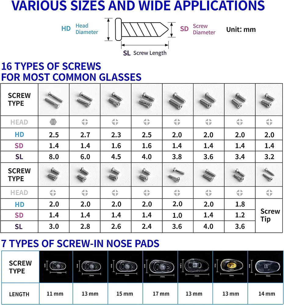 π Complete & Exquisite Eyeglass Repair Kit: Our eye glass repairing kit includes 4pcs Phillips and 4pcs Flathead magnetic screwdrivers, 16 sizes of tiny eyeglass screws, 14 pairs of eyeglass nose pads(7 different sizes), 1 curved tweezer, 1 micro screwdriver, washers, nuts, screw caps, cleaning cloth and screw box for glasses repair. With this glasses repair kit, you can repair your glasses everywhere whether you want to change nose pad or your glasses screws are aging or missing. π§‘ Useful & Comfortable Precision Magnetic Screwdriver Set: We have PH0000/1.2, PH000/1.5, PH00/2.0, PH0/3.0 Phillips screwdriver set and 1.2mm, 1.5mm, 2.0mm, 3.0mm Flathead screwdriver set in our glasses repair kit that are great for tiny screws. π Multi-functional Keychain Screwdriver: The 3 in 1 keychain screwdriver includes Phillips and Flathead screwdriver and nut holder, which is designed for eyeglasses repair, but you can also attach it to your key chain for standy applications. π Various Nose Pads & Screws : Our eyeglass repair kit is also equipped with 11/13/15/17mm different nose pads. You can choose according to your needs. Besides, 16 sizes of tiny screws can also meet your requirement. You can use the curved tweezer included in this kit to grip these tiny screws. And they are all included in our screw box, which is quite convenient to collect and carry. π Widely Applications: The Phillip and Flathead screwdriver covers a wide range of works and repairs in our daily life. This repair tool kit can used for eyeglass, sunglasses, watches, clocks and those small electronics with tiny screws. Product Description Flexible with Swivel Cap It is equipped with flexible swivel cap, which is convenient to hold in hand and freely turn with swivel cap, good for long time use. Complete Screwdriver Set Our eye glass repairing kit includes 4pcs Phillips and 4pcs Flathead screwdriver, which are PH0000/1.2, PH000/1.5, PH00/2.0, PH0/3.0 Phillips screwdriver set and 1.2mm, 1.5mm, 2.0mm, 3.0mm Flathead screwdriver set. Non-slip Handles The handle of the screwdriver set is made of plastic, which is non-slip when using. You don't need to worry about falling it down easily.