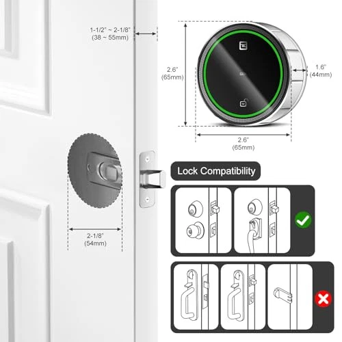 Recommended Uses For Product: Smart Retrofit Lock, Renters can easily upgrade without changing Special Feature: Rechargeable Battery Lasts 6 to 8 Months, Multiple Alarm, Easy In Batteries Included: Yes Batteries Required: Yes Manufacturer: Does Not Apply Country of Origin: China Model Name: Bluetooth Deadbolt Lock Part Number: F05-B Item Weight: 1.26 pounds Controller Type: Amazon Alexa(Gateway Sold Separately), Google Assistant(Gateway S Product Dimensions: 2.56 x 2.56 x 3.03 inches Lock Type: Deadbolt Finish Type: Brushed Brand: Does Not Apply Material: Steel Item Length: 2.56 Style: Smart Deadbolt Lock Item Height: 3.03 Date First Available: January 26, 2024 Number of Pieces: 1 Special Features: Rechargeable Battery Lasts 6 to 8 Months, Multiple Alarm, Easy In Control Method: App MPN: Does Not Apply Included Components: Mounting Adapter Bag*1, Fixed Tape*1, Installation Guide*1, Inter gtin13: Does Not Apply UPC: Does Not Apply Batteries: 1 Lithium Ion batteries required. (included) Battery Cell Type: Lithium Polymer Finish: Brushed Shape: Round EAN: Does Not Apply Item Width: 2.56 Item model number: Smart Lock-F05-B Color: Brushed Silver Connectivity Protocol: Wi-Fi(Gateway Sold Separately), Bluetooth Type: Does Not Apply Item dimensions L x W x H: 2.56 x 2.56 x 3.03 inches