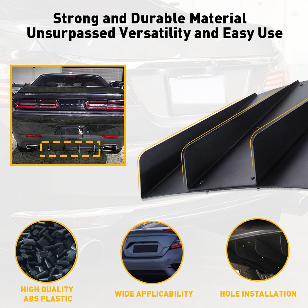 Specifications: Product size: 55*48.5cm/21.7*19.1in Product color: Black Product material: Polyurethane Placement on Vehicle: Rear Suitable model: universal 1.【Reduce Air Resistance】:This shark fin diffuser designed to increase a vehicle's aerodynamic performance and improve the stability of vehicle during fast driving. 2.【Excellent Appearance】:Shark fin and clean lines design with beautiful appearance to decorate your car,which gives your vehicle a more aggressive racing look. 3.【ABS Material】 :Made of ABS material with high-qulaity, waterproof, durable functions and will not easy to break. Car Trim Diffuser Rear Kit 4 Fins Splitter Bumper Chin Spoiler Lower Lip Black O Specifications: Product size: 55*48.5cm/21.7*19.1in Product color: Black Product material: Polyurethane Placement on Vehicle: Rear Suitable model: universal 1. 【Reduce Air Resistance】 :This shark fin diffuser designed to increase a vehicle's aerodynamic performance and improve the stability of vehicle during fast driving. 2. 【Excellent Appearance】 :Shark fin and clean lines design with beautiful appearance to decorate your car,which gives your vehicle a more aggressive racing look. 3. 【ABS Material】 :Made of ABS material with high-qulaity, waterproof, durable functions and will not easy to break. 4. 【Universal Fit】 :Universal fit for most cars , please measure the size before purchasing. Note: Please confirm the size and make sure that there is enough space to install before purchasing!!! Professional installtion is requred. Packaging include: 1x Rear Bumper 4 Fins Diffuser 6x Screws Item Specifics Country/Region of Manufacture United States Attachment Method Bolts Screws Warranty 1 Year Fitment Type Performance/Custom Surface Finish ABS Type Rear Bumper Diffuser 4 Fin Color Black Material Polyurethane Placement on Vehicle Lower Rear Manufacturer Part Number Does Not Apply Brand Unbranded Features Array Dimension Approx 22" x 19" (Check image for detail) Fitment Universal fit on Under Rear bumper Installation Not Included-Modification may be required to fit properly. Item Compatibilities Reference only OE Spec or Performance/Custom Performance/Custom Package Including Rear Bumper Diffuser Fin and Screws Custom Bundle Yes Number of Pieces 1 Number of Pieces 1 FAQ ♥ If you have a decoding problem or any other problems, please contact us first, we will help you with it. We will reply you within 24 hours in working days. I'm a new seller, thanks a lot for your trust and convince! I will serve you with all my heart. ♥ Q1: Will this bulb fit my vehicle? A: We can match almost any vehicle to one of our bulb sizes. eBay only lets us include some vehicle fitments per listing, but if your vehicle does not show up on the compatibility table at the top of our listings, welcome you to contact us for free consulation before purchasing a product. Q2: My item has not arrived, what's taking so long? A: Sometimes items take longer than expected, especially if it’s going far or to rural area. Check with your post office to see if your item has been held up. Sometimes Royal Mail will not update a tracking number until it has arrived at its destination. If your item still don't arrive after a few days, let us know so we can double check for you and help solve it asap. Q3: My bulbs won't fit, help! A: Special bulb holder may be required. See if you can take the holder from the stock bulb. If not, let us know. The bulb size may be wrong, double check the item you received with the item you ordered. Do you have an aftermarket lighting housing? These may not be perfectly fitted for aftermarket bulbs and will require some manual modifications. Q4: Neither side lighting up? Both sides flicker, hyper flash, or work inconsistantly. A:Check the light fuses, and then check the ballast plugs to insure correct installation. If this doesn't work, there may be a voltage problem with the vehicle. You probably just need a relay or capacitor. Even though some bulbs are builtin resistors, they may still need a decoder. Pay & Ship (1). We gladly accepts payment via PayPal, We will ship your item(s) within 24 hours. (2). Before payment, please keep the consistency of Paypal address and ebay address. (3). Quantity orders are welcome! Returns (1). We offer 60 days free return policy. Please contact us within 60 days from the date you receive your order if you have any issues with the product or want return. Refund will be send after we got your resend package. (2). All returned items should be in the original packaging , return tracking information should be provided . Contact Us (1).Negative feedback will not help resolve any problems you have, please contact us via eBay messages before leaving negative feedback , our customer service will make best effort to help you with the issues. (2).We maintain high standards of excellenceand strive for 100% customer satisfaction! Feedback is very important to us. We request that you contact us immediately before you give us neutral or negative feedback, so that we can satisfactorily address your concerns. About us We're professional in car and motorcycle accessories, especially in LED bulbs. We have our own factory and R&D team. Our belief is to sell top quality items that fit your car and serve you with our heart. Anything please feel free to contact us! Our customer service is very responsibility. Come and follow us! DESCRIPTION NEW ARRIVED HOT SALE CONTACT US SAVE US Store Category Store Home Other Hot Item Universal Car Bumper Spats Rear Lip Splitter Canard Diffuser Spoiler Gloss Black USD 14.99 Rear Lower Bumper Diffuser 4Fin Spoiler Lip Splitter Wing Universal USD 11.39 4pcs Carbon Fiber Car Rear Bumper Diffuser Shark Fin Spoiler Lip Wing Splitter USD 12.59 For 2014-2020 INFINITI Q50 Carbon Fiber Headlight Eyelid Trim Cover Eyebrows 2PC USD 18.99 4PC OEM Mud Flaps Splash Guards Mudguards Fender For Honda Civic Hatchback 17-21 USD 25.99 New List Item For Acura TLX Black Lower Rear Bo