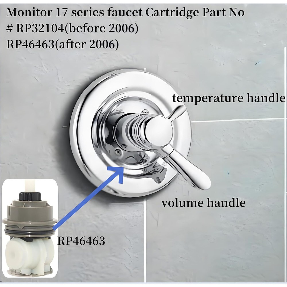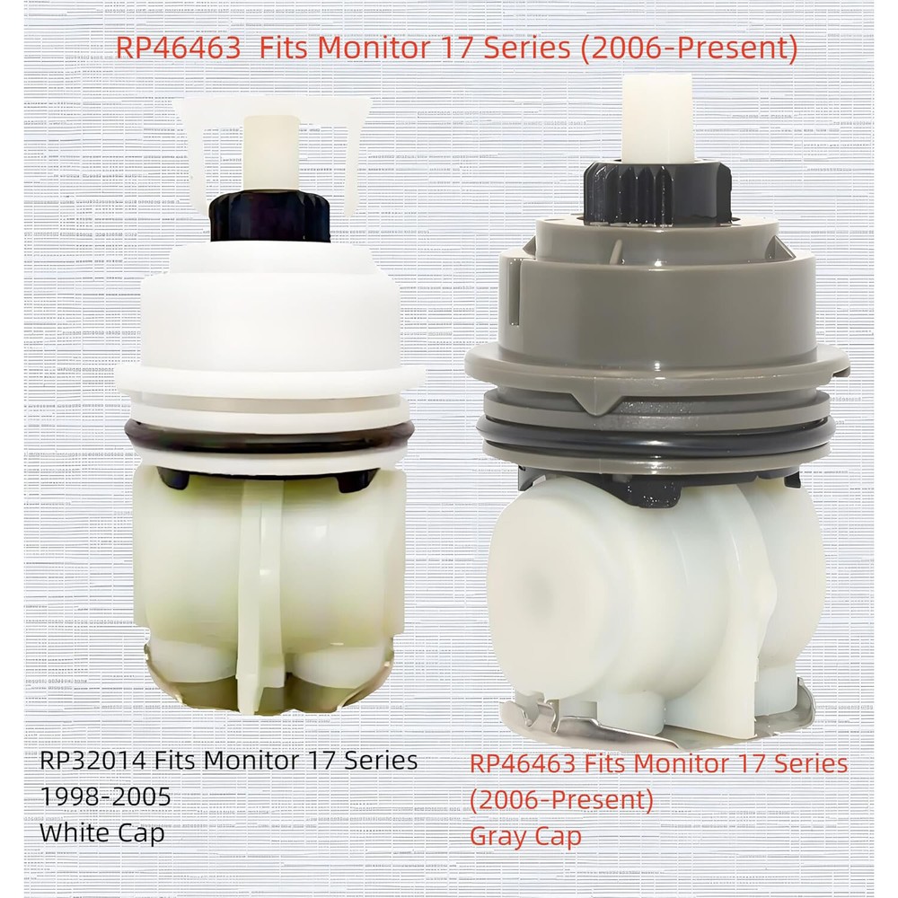 Home Payment Shipping About us Contact us Store Categories Store Categories Electronics Fashion Motors Home&Garden Others Details RP46463 Pressure Balance Cartridge Assembly,Compatible with Monitor 17 and 18 Series Showers Trim (2006 - present),Including Seat and Spring Adapter Product Description RP46463 cartridge has a GREY cap and is for Monitor 17 dual-function shower faucets made after 2006 NOT for single-function Monitor 13/14 series faucet The screw on the old adapter design is not necessary. It could cause leakage and affect the smoothness CAUTION:If your shower was made before 2006, the right part should be RP32104(WHITE Cap) Cartridge for Monitor 17 series dual-function( temperature and volume control) shower faucet. NOT for single-function Monitor 13/14 series faucet. The screw on the old adapter design is not necessary. It could cause leakage and affect the smoothness. Olny Fit Monitor 17 AND 18 Series Showers ( 2006 - present ) Monitor dual-function pressure balance cartridge Dual-function volume and pressure balance temperature control including the RP46463 Cartridge,Valve Seat,and Spring Adapter Before Ordering: check the shower faucet and valve cartridge comparison photos to ensure the correct part number This RP46463 Cartridge Adaptor boasts dual-functional volume and pressure-balance temperature control for maximum comfort. Designed for application in tubs and showers, this cartridge adaptor is compatible with Monitor universal valve body assembly 17 series and 18 series trim. Payment Method Shipping Policy Returns Policy About us Contact us Payment Method Shipping Policy Returns Policy [RETURN_POLICE] About us Contact us Home Payment Shipping About us Contact us