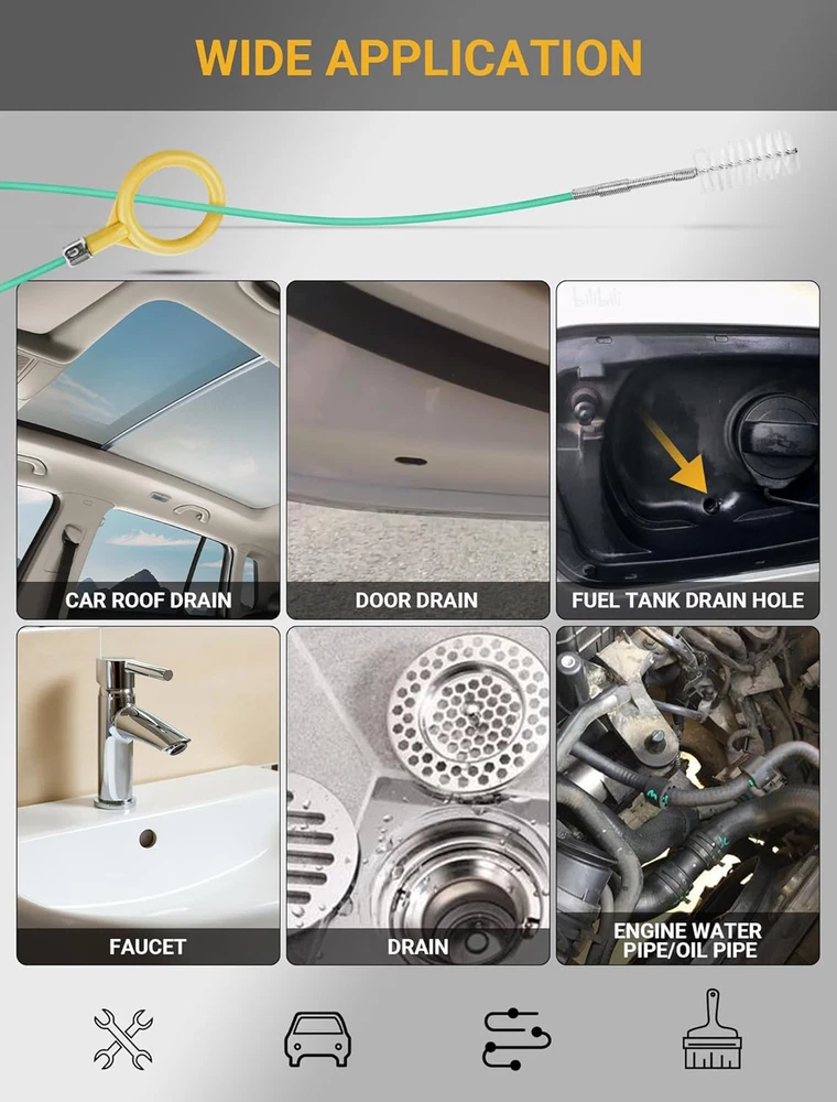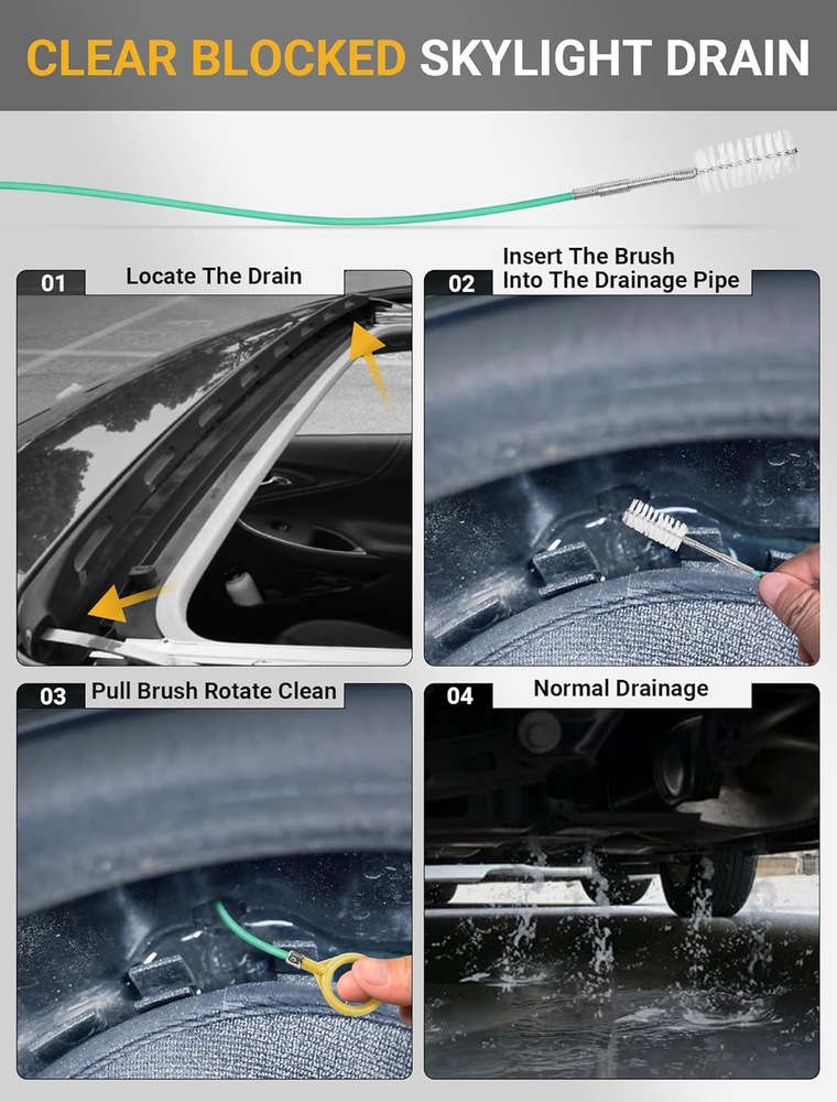【120 Inches Longer Drain Brush】Upgrade lengthened to 120 inches (300 cm), long enough to clean narrow pipes that cannot be reached by an ordinary cleaning brush. As well as flexible enough to even work with curved tubing. 【Steel Wire with PVC Pipe】This upgraded drain brush with high toughness, no damage and scratch to the soft rubber sunroof pipe. Works safer and faster on dredging obstruction in various of thin long pipelines. 【Nylon Rotating Bristles】One end of this drain cleaning brush is the tubular shaped brush, well made of nylon rotating bristles, soft and scratch free. Helps you gently remove the leaves, dirt, cobwebs and debris, can be reused for a long term. 【Practical Hand Ring Design】The other end of this hose pipe brush is a hand ring, designed for easy extraction. You don't need to worry about the pipe cleaner brush falling into the hose and not being taken out, more convenient for holding and energizing. 【Wide Application】This flexible drain brush is perfect for car sunroof, auto wiper, fuel tank drain hole, car door drain hole, skylight drain pipe and so on. Also ideal for refrigerator drain cleaning, fish tanks cleaning, hose or glass tubes cleaning, water pump accessories cleaning, filter systems cleaning, etc. Perfect solution on dripping and clogging problems. Product Description Auto Sunroof Drain Cleaning Tool Add to Cart Add to Cart Add to Cart Add to Cart Customer Reviews 4.5 out of 5 stars 906 4.5 out of 5 stars 906 4.5 out of 5 stars 906 4.5 out of 5 stars 906 Price $4.99 $ 4 . 99 $6.99 $ 6 . 99 $9.99 $ 9 . 99 $9.99 $ 9 . 99 size 78 inche-1Pack 120 Inche 78 Inche+Spray Bottle 78 Inche-2Packs Number Of Items 1 1 2 2 Material Nylon Nylon Nylon Nylon Handle Material Plastic Plastic Plastic Plastic Automotive-specific ✔ ✔ ✔ ✔