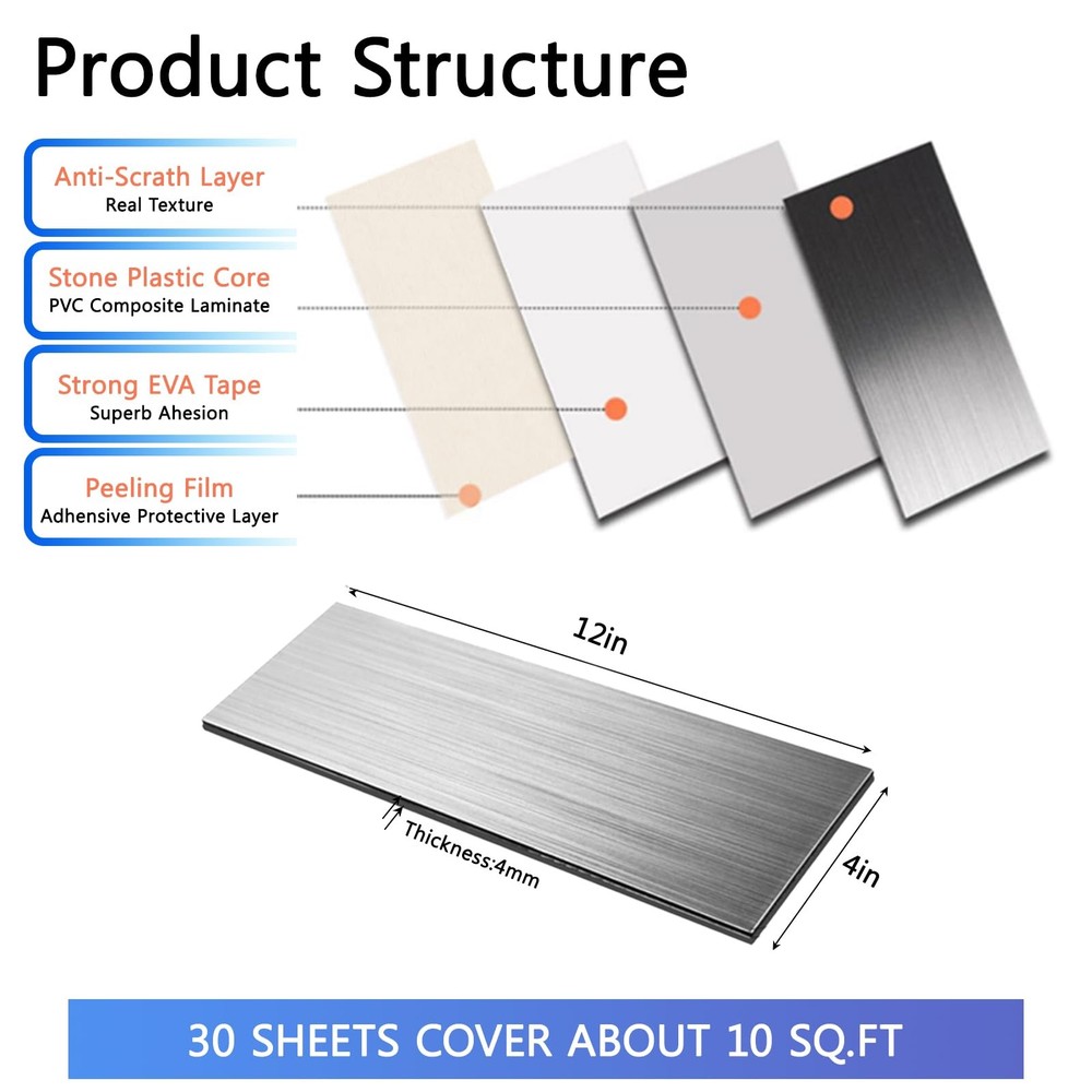 Elevate your kitchen's style with these sleek and modern porcelain tiles. Crafted from high-quality materials, these tiles offer a sophisticated linear pattern that adds depth and texture to your space. Their durable construction ensures long-lasting beauty, while the neutral gray hue complements a variety of design aesthetics. Whether you're renovating or building new, these versatile tiles are an excellent choice for backsplashes, countertops, or floors. Effortlessly blend form and function with this stylish and practical tile collection. Function: Easy to DIY self-adhesive metal tiles for kitchen tailboards, peeling and pasting installations. Dry-installation:No thin backing or decorative cement paste, no dirt or disorder. Widely used:Subway Backsplash, Kitchen, Bathroom, Laundry Room, Camper, Fireplace, RV,kitchen tailboards, decorative walls, and decorative purposes. Size: 4'' x 12'' x 0.15'' , with 30 metal tailboards per pack (occupying 10 square feet). Note:The tile is not magnetic, the tiles should not directly contact with flames or submerse in water. If cutting tiles, one of the following tools is required: jigsaw or cutting saw (recommended), steel saw, hole saw or top saw (only used for circular cutting or power socket cutting). 【4mm Thick & Cuttable Design】Upgraded stone-composite tiles (3x thicker than vinyl) withstand daily wear. Easily cut with scissors/utility knife for precise fitting around outlets or edges 【10 Sq.Ft Strong Adhesive Coverage】30 self-adhesive sheets (4”x12” each) cover 10 sq.ft. Industrial-grade glue bonds instantly on ceramic, PVC, glass, or painted walls—no grout or thin-set required 【Waterproof & Heat-Resistant】Moisture-proof polymer core prevents warping in kitchens/bathrooms. Withstands splashes, grease, and moderate heat (not for direct flames). Wipe clean effortlessly 【Multi-Surface Versatility】Install over existing tiles or smooth surfaces (wood, cement, metal) for subway-style accents. Ideal for kitchens, laundry rooms, campers, and decorative walls 【DIY-Friendly & Durable】Peel-protected adhesive ensures bubble-free application. 0.15" rigid design resists dents. Note: Non-magnetic surface; avoid submersion or extreme heat exposure