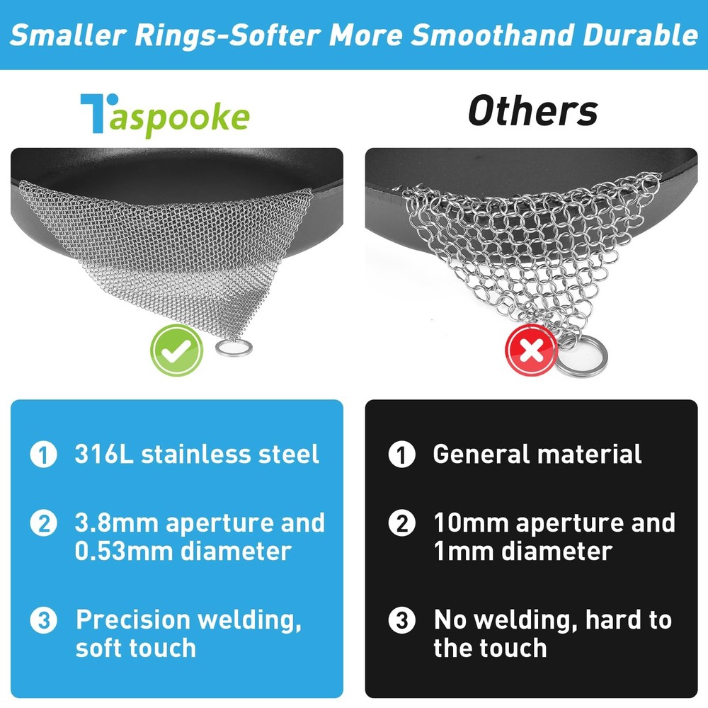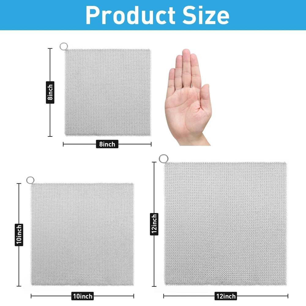 Clean your cookware with ease with our upgraded premium cast iron cleaner! Made from high-quality 316L stainless steel, this durable chainmail brush features finer and smaller circles with a hole diameter of 3.8mm and a wire diameter of 0.5mm, meeting all your needs for cast iron, stainless steel, and glassware. Its unique design allows for effective cleaning without damaging your pots and pans, ensuring your favorite cookware stays in top condition. Dishwasher-safe and easy to store, this versatile brush is perfect for indoor and outdoor cooking. Enjoy a lifetime satisfaction guarantee and experience the magic of worry-free cleaning now! 【Our Advantages】Our chainmail is made with Finer and Smaller Circles with a Hole Diameter of 3.8mm and a Wire Diameter of 0.5mm, which is an Upgraded product. In addition, we offer more and larger size options, and the oversized chainmail can even be used as a pet cage net, fireplace fence, screen or door curtain. 【High-quality Materials】Made of food-grade 316L stainless steel, this cast iron cleaner is durable and rust-resistant, with a smooth ring that effectively removes residue without scratching your cookware. 【Easy to Use】The round mesh design allows for efficient cleaning, minimizing debris from getting stuck. This brush comes with a convenient hanging loop for easy storage and access in any kitchen. 【Sturdy and Durable】Designed to withstand frequent use, this chainmail brush has reinforced edges to protect the seasoning of your cookware for a long life. 【Widely Used】Perfect for cleaning Cast Iron Skillets, Dutch Ovens, Griddles, Pans, Woks and even Glassware, this versatile brush is a must-have tool for home chefs and outdoor enthusiasts.