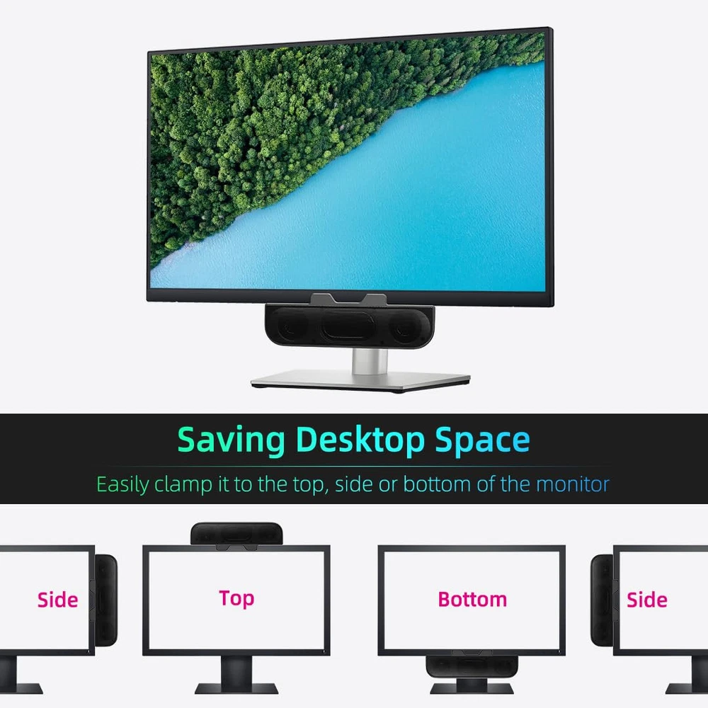 INCREDIBLE LOUD SOUND WITH DEEP BASS: The desktop computer speaker features dual super-magnetic drivers and a passive radiator, ensuring the delivery of hi-quality stereo sound with loud volume and deep bass from such a small body. EASILY CLIP-ON, SAVING DESKTOP SPACE: The monitor speakers can be quickly and easily clamped to the top, side or bottom of the monitors ranging from 0.1-inch to 1-inch in thickness, which effectively saves your desktop space. And of course, the patented clamp also allows the speaker to be placed smoothly on your desktop. USB PLUG-N-PLAY, VERY EASY TO USE: No need for 3.5mm headphone cable and driver software, only the single USB cable can feed both audio and electric power to the PC speakers, which greatly help avoid messy cables. FULL COMPATIBILITY: Proven by millions of users of our USB speakers, this enhanced computer sound bar would be a great external speaker for Windows/macOS/Chrome OS/Linux PC, laptop and desktop computers. NO EXTRA BUTTONS NEEDED: This USB plug-in speakers do not have any volume control buttons, you can simply adjust the volume on your computer system without needing to adjust both system volume and speaker volume like other computer speakers.