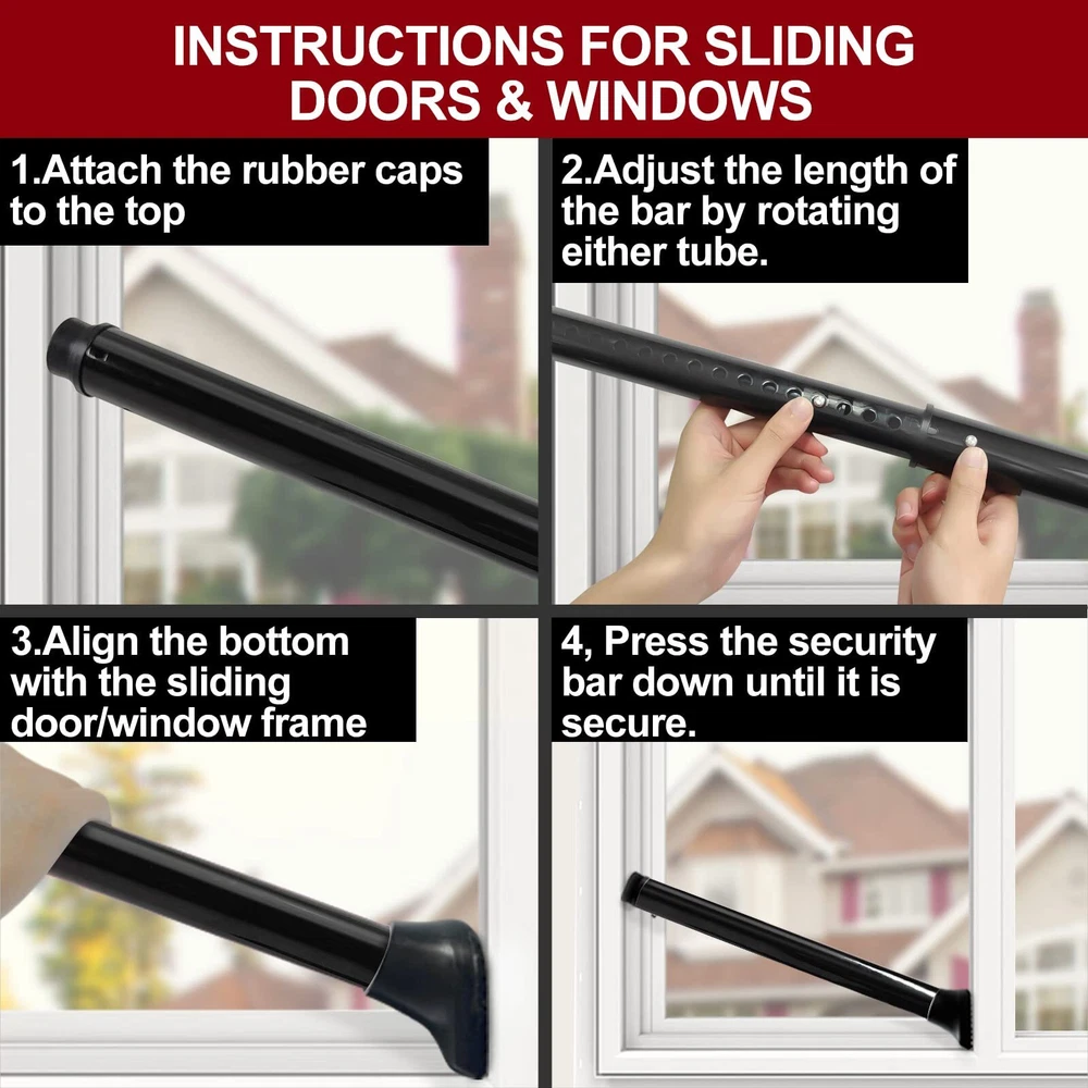 Bar for Security: If you are concerned that your windows and doors aren't sturdy enough or you feel it is unsafe when travelling alone, 's door stick security will offer you a complete sense of security with only one easy-to-use but distinctive lever which is also easy to install 2-in-1 Door and Sliding Door Security Bar: Use our adjustable security door bar to deter burglars from breaking into your house, apartment, or even hotel room; The length of the door barricade security bar can be adjusted from 21 to 46inch, and the full product weighs only 2.2 pounds, making it easy to carry during travel or store at home Easy to Use: According to our product manual or the installation instructions on the detail page, the door brace security bar is very simple to use, has a three-stage structure, and can be quickly deployed; This allows you to quickly strengthen your defense; However, while using it, you must be careful to ensure that there are no gaps between the rubber head and the ground Versatile and Enhanced Design: The bar is equipped with enhanced high-strength alloy connections to extend the service life; It also features thickened 1.57inch pipe diameter design, high-quality material upgrades and plastic components made of high-strength fiberglass material making it stable and sturdy; Since the security bar on an door stopper can endure 350 pounds of force, an invader would have to be as strong as a heavy weight boxer to open the door Customer Service: provides 20 months customer services; If you run across any issues or face any problem with the security bar for front door, please get in touch with us; Bring extra security for your loved one’s home without delay