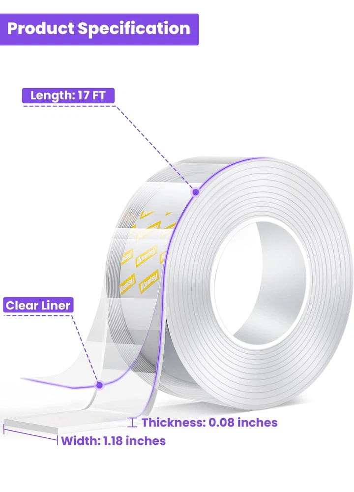 Double Sided Mounting Tape Removable 1.18" x 198”, Clear & Tough Nano Double Sided Tape Heavy Duty, Multipurpose Tape Picture Hanging Strip Adhesive Poster Carpet Tape 【Strong Adhesion】IKeelsy heavy duty double sided tape is made from premium acrylic gel via advanced nano tech. Getting your mounting activities done fast and securely without drilling and nails. Holds up to 18 pounds on smooth surfaces. 【REMOVABLE & TRACELESS】The removable adhesive tape can be easily removed from smooth surfaces without any damage. The wall tape can replace traditional methods of mounting items such as screw fixing and help keep your walls looking great. 【Easy Storage】Our strong viscosity double-sided tape won't stick to any other things when lying down, making it easier for storage. It can be easily cut to any size and mounted on wall for convenient hanging. 【MULTI-PURPOSE】Heavy duty double sided tape is widely used for smooth and clean surfaces such as glass, metal, plastic, tile, wood, marble, and more! You can use nano tape to mount small photo frames, pictures, posters, power strips, LED strips, mobile phone stands, fixing vases, and DIY decorations. 【Must-Have in Your Household.】It can replace many tools to achieve the purpose of paste, greatly improve the convenience of operation.Get one for your household and stick items easily without damaging them. Please keep the mounting surface dry, clean when mounting to make instant and permanent bond and get great water and moisture resistance ability.