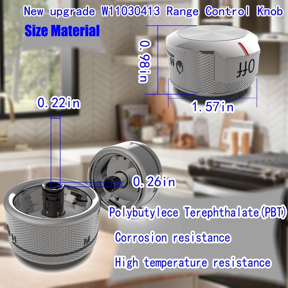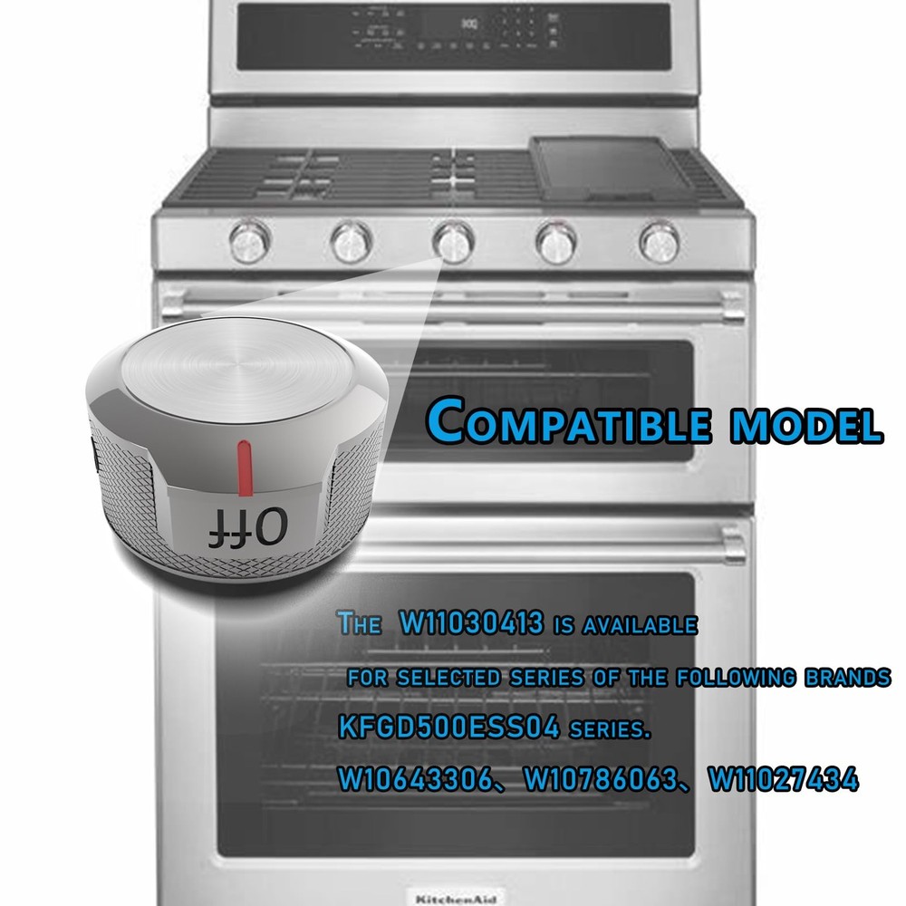 plastic 【Product Overview】Upgrades W11030413 stove knob,kitchenaid stove knobs replacements, kitchenaid knob replacement, compatible with Whirlpool KitchenAid lets you control the heat of the surface accessories on the range. Replaces W11027434, 4461624, PS11770322, W10643306, W10786063. 【Note】 W11030413 burner control safety knobs, the installation hole diameter (D shaft size) is 0.25 inch/ 6.35 mm in length, 0.21 inch/5.2 mm in width, (please refer to size picture) and measure your knobs control insert size to make sure this knob fits before purchasing. 【High quality】Stove knob has a plastic surface and a metal inside. The surface is made of high-resistance ABS plastic with the advantage of corrosion resistance, high temperature resistance and strong reinforcement. The D shape is alloy sheathed. No tools required - Easy to install and Remove the knob by pulling it straight off its post. 【After Sales Guarantee】If you have any questions about this please contact us, you are not only buying a product, but also our complete after-sales service. Any problem, just an email, we will solve you within 12 hours. 【Compatible Models】:Universal electric appliance KFGD500ESS02,KFGD500EWH03,KFDD500ESS00 KFDD500ESS01 KFDD500ESS02 ,KFGD500EBL00 KFGD500EBL01 KFGD500EBL02 KFGD500EBL03 KFGD500EBL04 KFGD500EBS00 ,KFGD500ESS00 KFGD500ESS01 KFGD500ESS02 KFGD500ESS03 KFGD500ESS04,KFGD500EWH00 KFGD500EWH01 KFGD500EWH02, KFGD500EWH03 KFGD500EWH04, KFGG500EBL0 KFGG500EBL1 KFGG500EBL2 KFGG500EBS2 KFGG500EBS3,KFGG500ESS0 KFGG500ESS1 KFGG500ESS2,KFGG500EWH0 KFGG500EWH1 KFGG500EWH2 KFGG500EWH3,KFGG504KPS0,KFGS530ESS0 KFGS53