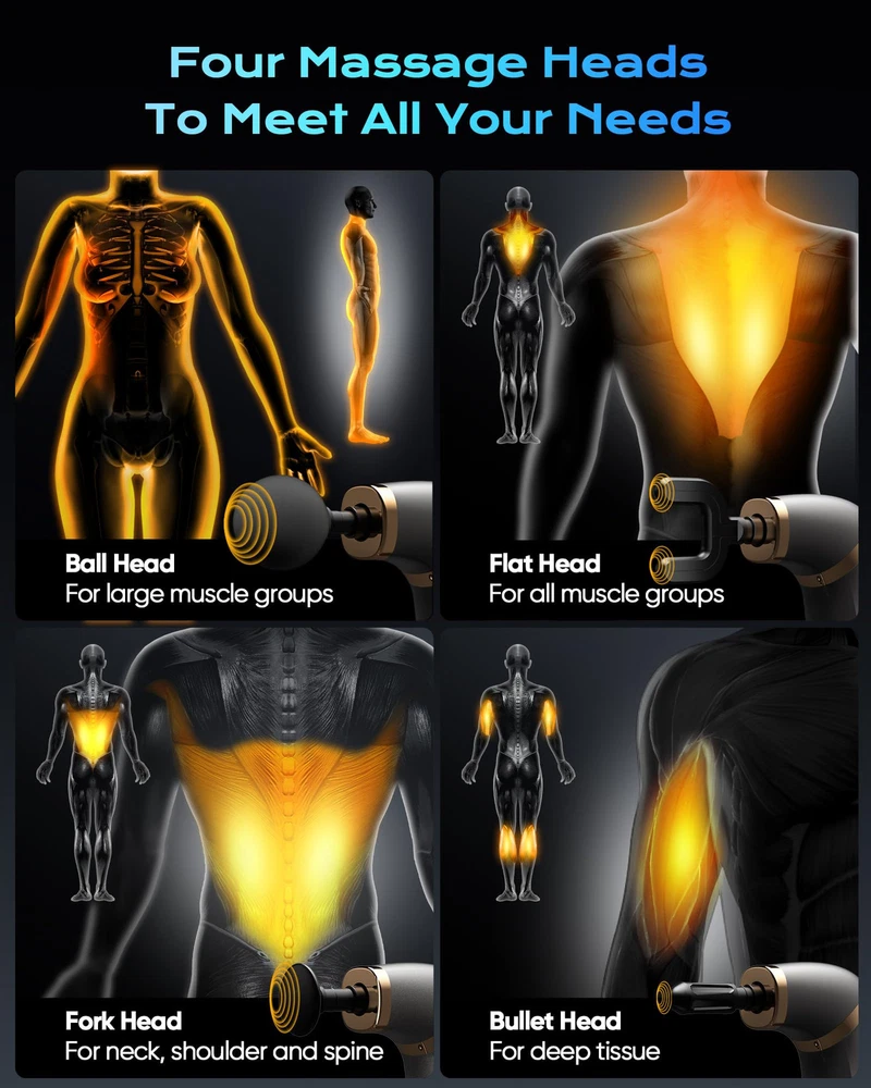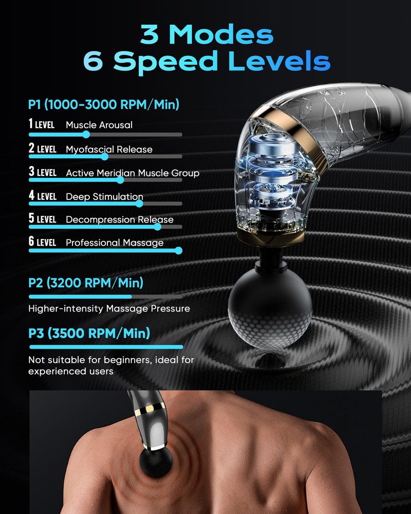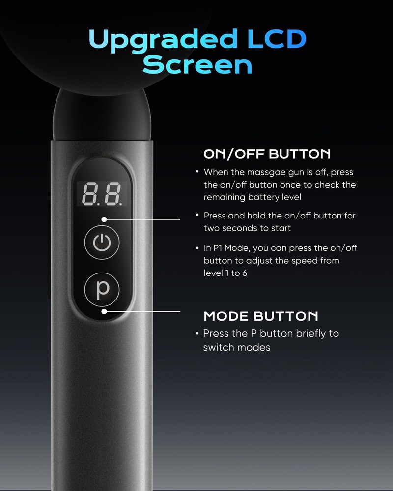 【Upgraded Extended Handle & Quick Pain Relieve】Our massage gun deep tissue is designed with an easy-to-grip extended handle and an ergonomic 120° curve that perfectly aligns with the natural curvature of your spine. Unlike regular massage guns, our massage gun deep tissue allows you to effortlessly reach and relax your back, neck, shoulders, arms, legs, and other hard-to-reach areas. Suitable for pain relief and speeding up recovery from sports injuries, it is a must-have for anyone seeking effective muscle relaxation and rejuvenation 【Smart LCD Screen & 4 Massage Heads】Our massage gun features an intuitive LCD screen that shows mode, speed level, and battery life. It comes with 4 massage heads to meet your various needs. When the massage gun is powered off, press the On/Off Switch once to check the battery level. Press and hold the On/Off Switch for 2 seconds to turn on the massage gun 【3 Modes & 6 Levels】Customize the massage gun with 3 modes and 6 speed levels. P1 Mode features 6 adjustable speed levels (1000-3000 RPM). P2 Mode (3200 RPM) and P3 Mode (3500 RPM) have a fixed speed setting. In P1 Mode, press the on/off Switch to adjust the speed from level 1 to 6. You can switch between modes by pressing the P key 【Long Battery Life】Recharge quickly in just 90 minutes with a USB-C cable. Enjoy a 15-minute massage session daily, and our massage gun will keep you relaxed for up to 15 days on a single charge. When the battery level shows 99, it indicates a full charge. Do not use the massage gun while it is charging 【Lightweight Holiday Gift Idea】Our massage gun is ergonomically designed for ease of use and portability. It's lightweight and comes with a user manual, this massage gun offers the best massage experience at home, in the gym, or at the office. This makes it the perfect present for Mother's Day, Father's Day, or any special occasion for your family, loved ones, and friends