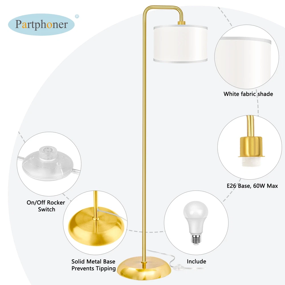 💡【3 Color Temperature LED Bulbs Included】Our Modern Floor Lamp includes a 9 W LED E26 bulb.The bulb has 3 color temperatures that can be adjusted 2700K/4000K/5000K, and creates 810LM sufficient brightness for your life.The standing lamp suit for all room style, such as the softness of warm light brings you a warm feeling,and the brightness of cold light brings you a good reading environment and protects your eyes. 💡【Convenient pedal foot switch】 The living room floor lamp build with pedal switch and a 6 feet power cord. It allows you to tap the lamp on or off with your foot and Spare our hands to do something else. Long power cord allows you to place the beautiful light to the right position with minimal limitations. 💡【Stylish and modern design】 partphoner gold modern floor lamp is suitable for modern architecture and decoration, fits any room style, its drum creamy-white linen lampshade perfect matched with the golden plated metal lamp pole looks gorgeous and modern in the living room, bedroom, study room, etc in your home or office. Also, the floor lamp for bedrooms is very easy to assemble. 💡【Perfect for all occasion 】 whether you read books in a recliner or work at a desk, this classic floor lamp fits easily beside your furniture. Its slender design allows it to position well near sofas, armchairs, side tables etc. The bedside standing lamp can be meet your basic lighting needs. 💡【Easy use and no Worry】 everything came with the package, just screw a few tubes together and then you can enjoy the led floor lamp immediately. Besides, we provide a 1-year warranty, if you have any questions, please feel free to contact us,we will respond within 24 hours to provide the most satisfactory solutions and services.