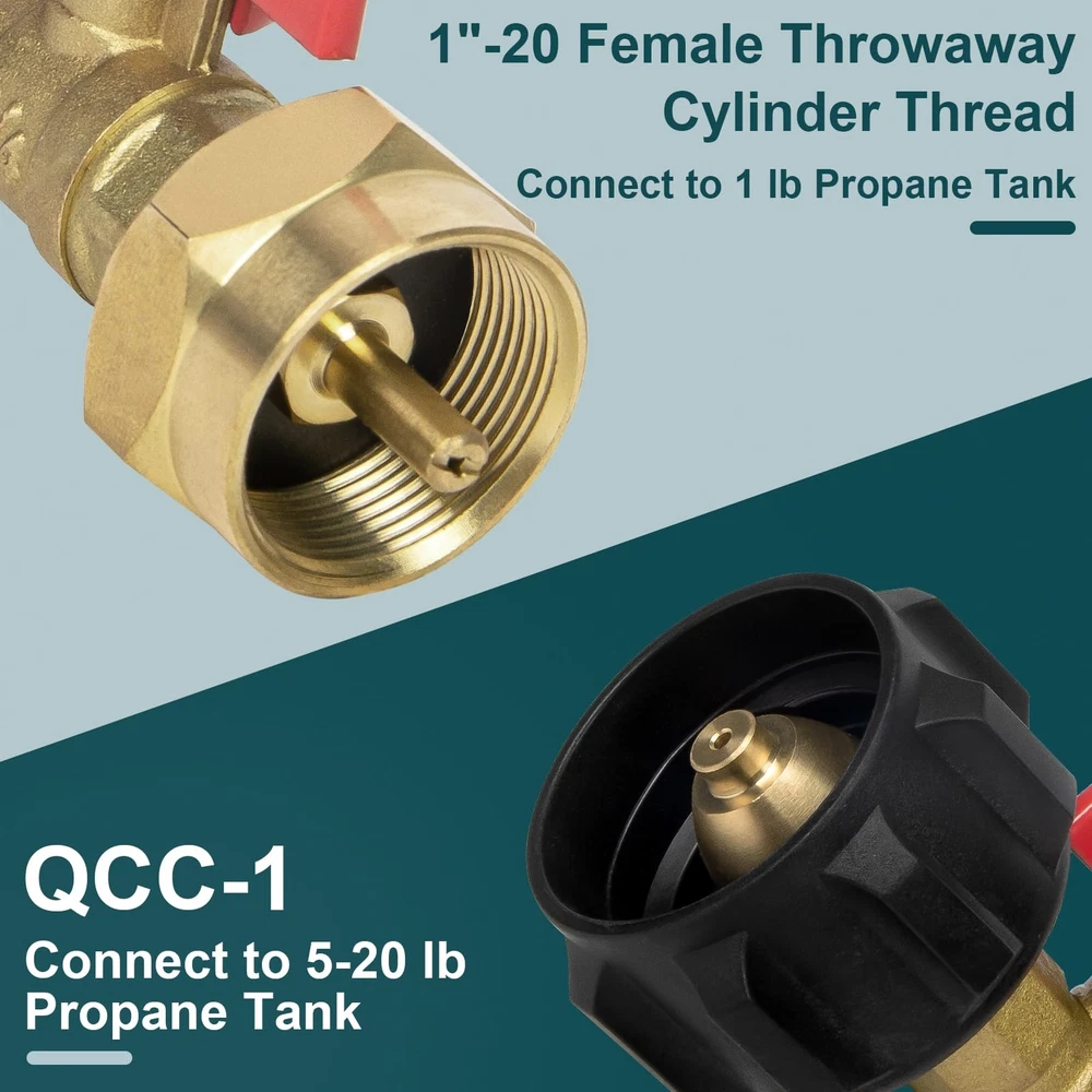 Easy Filling: The 90-degree elbow design makes it easier for gas to flow to the small cylinders. Simply attach to your large tank and your 16 oz tanks for refilling in 1 minute Upgraded Design: Featured with a propane ON-Off control valve, prevents gas leaks when connecting gas cylinders. You can easily control the refilling process with safe Safe Structure: Corrosion-resistant solid brass provides a better sealing effect. Additionally, the built-in safety features effectively prevent the danger of overfilling the gas cylinder Standard Fitting: QCC-1 x 1"-20 Female Throwaway Cylinder Thread, ensure the propane bottle adapter fits your propane tanks Use with Ease: Easily refills your 1 pound bottles multiple times without tools. Helping you save on the cost of buying new green propane gas cylinders