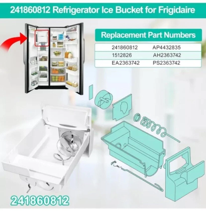 Product Dimensions 19.87"D x 10"W x 12.12"H Capacity 2.4 Gallons Manufacturer Luckman Compatible Refrigerator Models Frigidaire FGUS2647LF0, Frigidaire FGHS2655KE0, Frigidaire FGUS2635LE0, Frigidaire FGUS2637LP0, Frigidaire FGUS2666LE0, Frigidaire FGHS2355KP1, Frigidaire LGHS2655KE0Frigidaire FGUS2647LF0, Frigidaire FGHS2655KE0, Frigidaire FGUS2635LE0, Frigidaire FGUS2637LP0, Fr… See more Material UPGRADED Food Grade Material 【241860812 Ice Maker for Frigidaire Refrigerator】 Upgraded frigidaire ice bucket assembly 241860812 ice container fixes symptoms: A: Ice maker not making ice; B: Ice maker dispenses too little ice C: No ice at all; D: ice buckets are cracks; E: Auger break; F: Ice Makers Freezing up .Note: If the part does not crush ice, the spring under the ice bucket may be too stiff for your model. Please replace the spring from the old ice bucket and it will fix the issue. Size: 19.87"L X 10"W X 12.12"H. 【UPGRADED Food Grade Material-More Strengthen】Upgraded 241860812 Ice Bucket Refrigerator for Frigidaire ice make parts made of environmentally friendly premium thickened food grade materials which is durability, strengthen, pollution-free, safe and exact fit. Our ice maker for frigidaire refrigerator meet OEM standard,high quality Replacement for frigidaire ice maker assembly have good stronger and tougher, let your ice bin bucket works better,each of them has been strictly tested. 【Ice Container And Auger Assembly Easy to Install】241860812 frigidaire ice bin replacement is easy to remove and replace,search for "241860812" on the YouTube to get the installation video and it shows you exactly how to installation. frigidaire ice container and auger assembly. It is located in the ice maker's freezer,The auger arm is made of heavy-duty Stainless steel that rotates