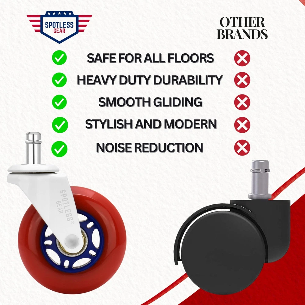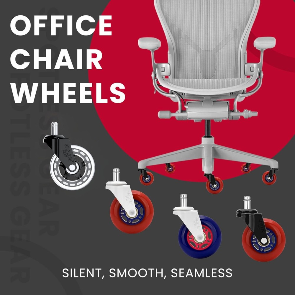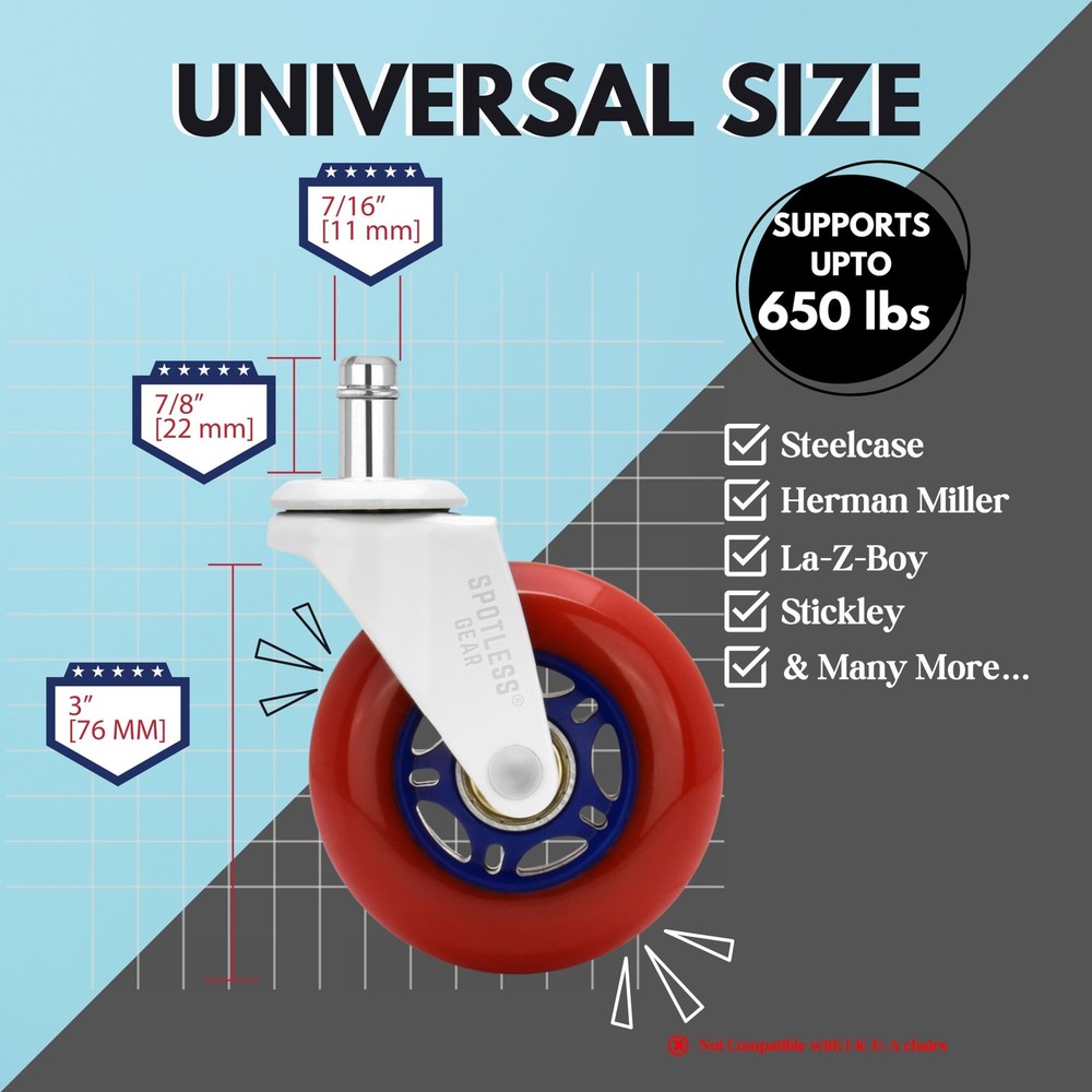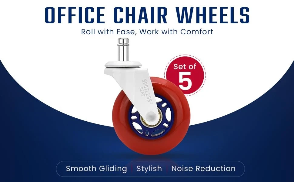 Transform your office experience with Desk Chair Wheels Replacement set. Designed with care, our rubber wheels for office chairs offer an unparalleled smooth glide, eliminating the frustrations of stuck or squeaky wheels. Whether you're working at your desk, gaming, or simply moving from one workstation to another, our office chair caster wheels promise a seamless experience. Our chair casters fit universally with almost all office chairs and are perfect replacements for your old, worn-out computer chair wheels. Made from high-quality, durable rubber/Polyurethane , these rolling chair wheels replacements are designed to protect your floors from scratches and scuffs. Be it hardwood floors or carpet, our office chair wheel replacements glide effortlessly, ensuring your office space remains pristine. ’s wheels for office chairs are not just about functionality but also about comfort. The precision ball bearings in the swivel and axel provide a quiet, smooth glide every time you move. Say goodbye to the jarring sounds of traditional plastic wheels and hello to the silent, soft roll of rubber casters for office chairs. Our chair roller wheels are incredibly easy to install, requiring no tools. Simply pull out your old, worn-out wheels and push in the new ones. Within minutes, your chair will feel brand new, ready to roll with ease and efficiency. These ruedas para sillas de oficina are perfect for those who value both style and practicality. Designed to support heavy weights, our office chair wheels are robust and long-lasting. They're not just for the office; they make an excellent addition to gaming chairs too, offering the same smooth, quiet operation that enhances your gaming experience. These chair wheels are compatible with all office furniture casters, providing a versatile solution for all your chair needs. Upgrade your office setup with the office chair casters wheels-set of 5. Whether you need office chair wheels for hardwood floors or office chair wheels for carpet, our set has you covered. These stealtho office chair wheels not only perform exceptionally but also add a sleek, modern look to your office chair. Perfect for anyone in need of replacement wheels for office chairs, our product ensures durability, style, and functionality. Don't let inferior chair wheels slow you down. Choose office chair wheels replacement and enjoy the perfect blend of performance and protection. Whether you're looking for chair wheels for hardwood floors or carpet, our product guarantees a smooth, uninterrupted glide, making your work or gaming sessions more enjoyable and productive. SMOOTH ROLLING: Upgrade your seating experience with our wheels for office chair, offering a smooth and silent glide across hardwood floors and carpets alike. Say goodbye to noisy and rough movements with these premium desk chair wheels. UNIVERSAL FIT: Our roller wheels office chairs are designed to fit most chairs, making them the perfect chair wheels replacement. Enjoy effortless installation and a secure fit with these versatile office chair casters. QUICK AND EASY INSTALLATION - No tools required! Easily remove and replace the wheels in your desk chair in less than 60 seconds. Simply pull out your old caster wheels and pop these in. ALL FLOOR TYPES: Protect your floors with our Roller wheels for office chairs, specifically engineered to prevent scratches on hardwood floors and avoid damage on carpets. These office chair wheels for all floor types including hardwood floors are a must-have for any workspace. RELIABLE HEAVY-DUTY CONSTRUCTION - Built to last, our chair wheels feature an entire support bracket and internal parts made of high-grade steel. This sturdy design ensures years of effortless rolling and durability, supporting up to 650 lbs as a set of 5. EXCLUSIVE COLOR OPTIONS: Elevate your workspace with our unique color editions — choose from the sleek Clear, vibrant Web SuperHero, patriotic USA Flag Theme, or bold Red Blaze to perfectly match your style and décor.