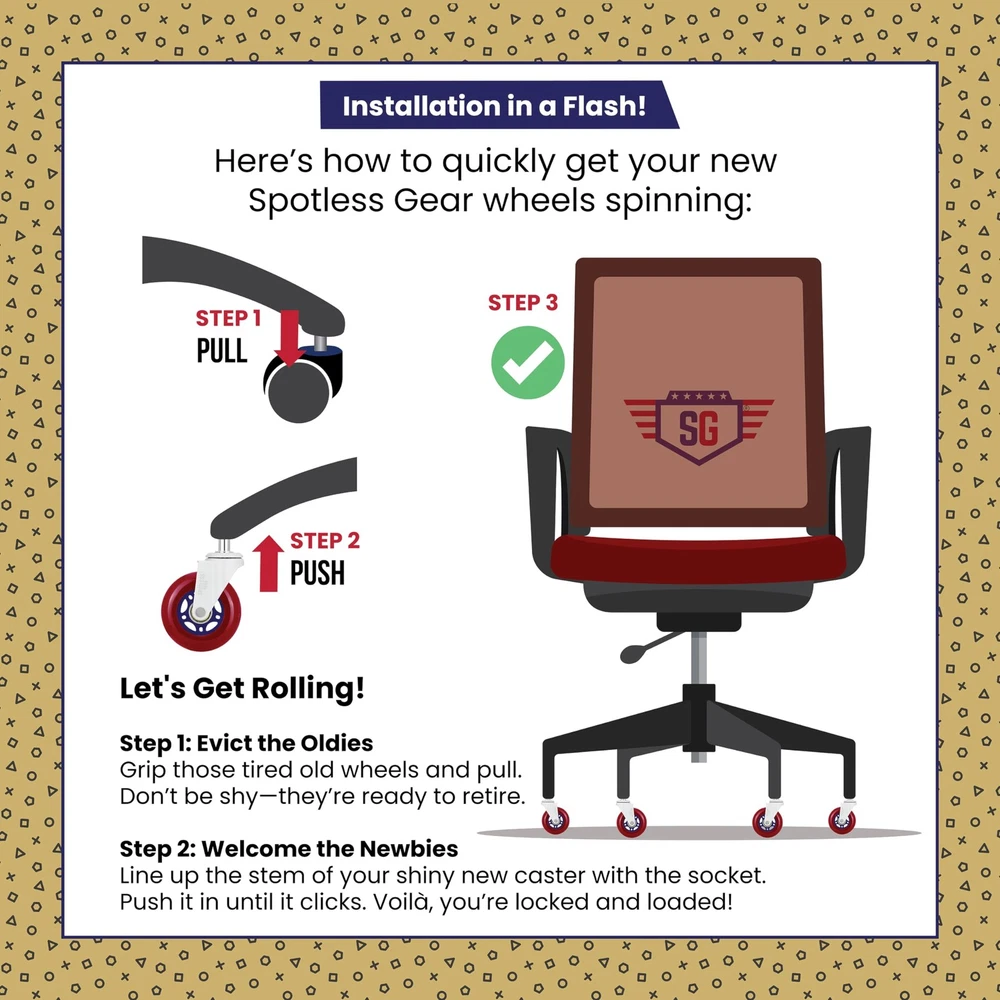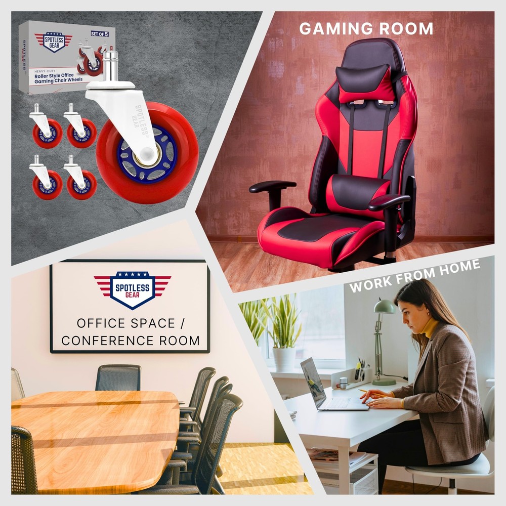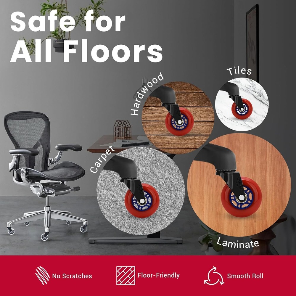 Transform your office experience with Desk Chair Wheels Replacement set. Designed with care, our rubber wheels for office chairs offer an unparalleled smooth glide, eliminating the frustrations of stuck or squeaky wheels. Whether you're working at your desk, gaming, or simply moving from one workstation to another, our office chair caster wheels promise a seamless experience. Our chair casters fit universally with almost all office chairs and are perfect replacements for your old, worn-out computer chair wheels. Made from high-quality, durable rubber/Polyurethane , these rolling chair wheels replacements are designed to protect your floors from scratches and scuffs. Be it hardwood floors or carpet, our office chair wheel replacements glide effortlessly, ensuring your office space remains pristine. ’s wheels for office chairs are not just about functionality but also about comfort. The precision ball bearings in the swivel and axel provide a quiet, smooth glide every time you move. Say goodbye to the jarring sounds of traditional plastic wheels and hello to the silent, soft roll of rubber casters for office chairs. Our chair roller wheels are incredibly easy to install, requiring no tools. Simply pull out your old, worn-out wheels and push in the new ones. Within minutes, your chair will feel brand new, ready to roll with ease and efficiency. These ruedas para sillas de oficina are perfect for those who value both style and practicality. Designed to support heavy weights, our office chair wheels are robust and long-lasting. They're not just for the office; they make an excellent addition to gaming chairs too, offering the same smooth, quiet operation that enhances your gaming experience. These chair wheels are compatible with all office furniture casters, providing a versatile solution for all your chair needs. Upgrade your office setup with the office chair casters wheels-set of 5. Whether you need office chair wheels for hardwood floors or office chair wheels for carpet, our set has you covered. These stealtho office chair wheels not only perform exceptionally but also add a sleek, modern look to your office chair. Perfect for anyone in need of replacement wheels for office chairs, our product ensures durability, style, and functionality. Don't let inferior chair wheels slow you down. Choose office chair wheels replacement and enjoy the perfect blend of performance and protection. Whether you're looking for chair wheels for hardwood floors or carpet, our product guarantees a smooth, uninterrupted glide, making your work or gaming sessions more enjoyable and productive. SMOOTH ROLLING: Upgrade your seating experience with our wheels for office chair, offering a smooth and silent glide across hardwood floors and carpets alike. Say goodbye to noisy and rough movements with these premium desk chair wheels. UNIVERSAL FIT: Our roller wheels office chairs are designed to fit most chairs, making them the perfect chair wheels replacement. Enjoy effortless installation and a secure fit with these versatile office chair casters. QUICK AND EASY INSTALLATION - No tools required! Easily remove and replace the wheels in your desk chair in less than 60 seconds. Simply pull out your old caster wheels and pop these in. ALL FLOOR TYPES: Protect your floors with our Roller wheels for office chairs, specifically engineered to prevent scratches on hardwood floors and avoid damage on carpets. These office chair wheels for all floor types including hardwood floors are a must-have for any workspace. RELIABLE HEAVY-DUTY CONSTRUCTION - Built to last, our chair wheels feature an entire support bracket and internal parts made of high-grade steel. This sturdy design ensures years of effortless rolling and durability, supporting up to 650 lbs as a set of 5. EXCLUSIVE COLOR OPTIONS: Elevate your workspace with our unique color editions — choose from the sleek Clear, vibrant Web SuperHero, patriotic USA Flag Theme, or bold Red Blaze to perfectly match your style and décor.