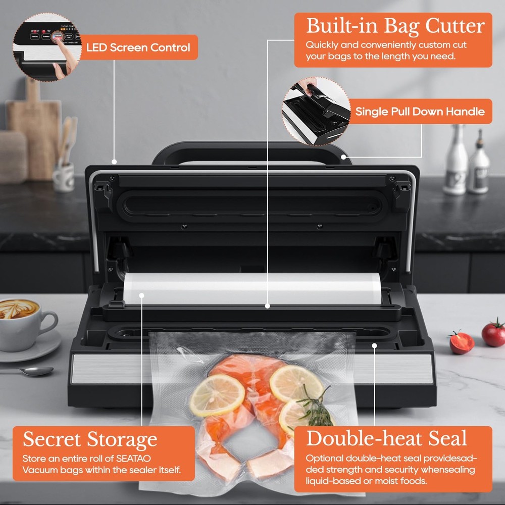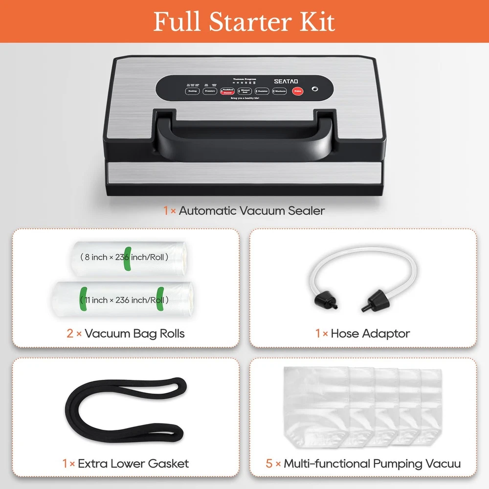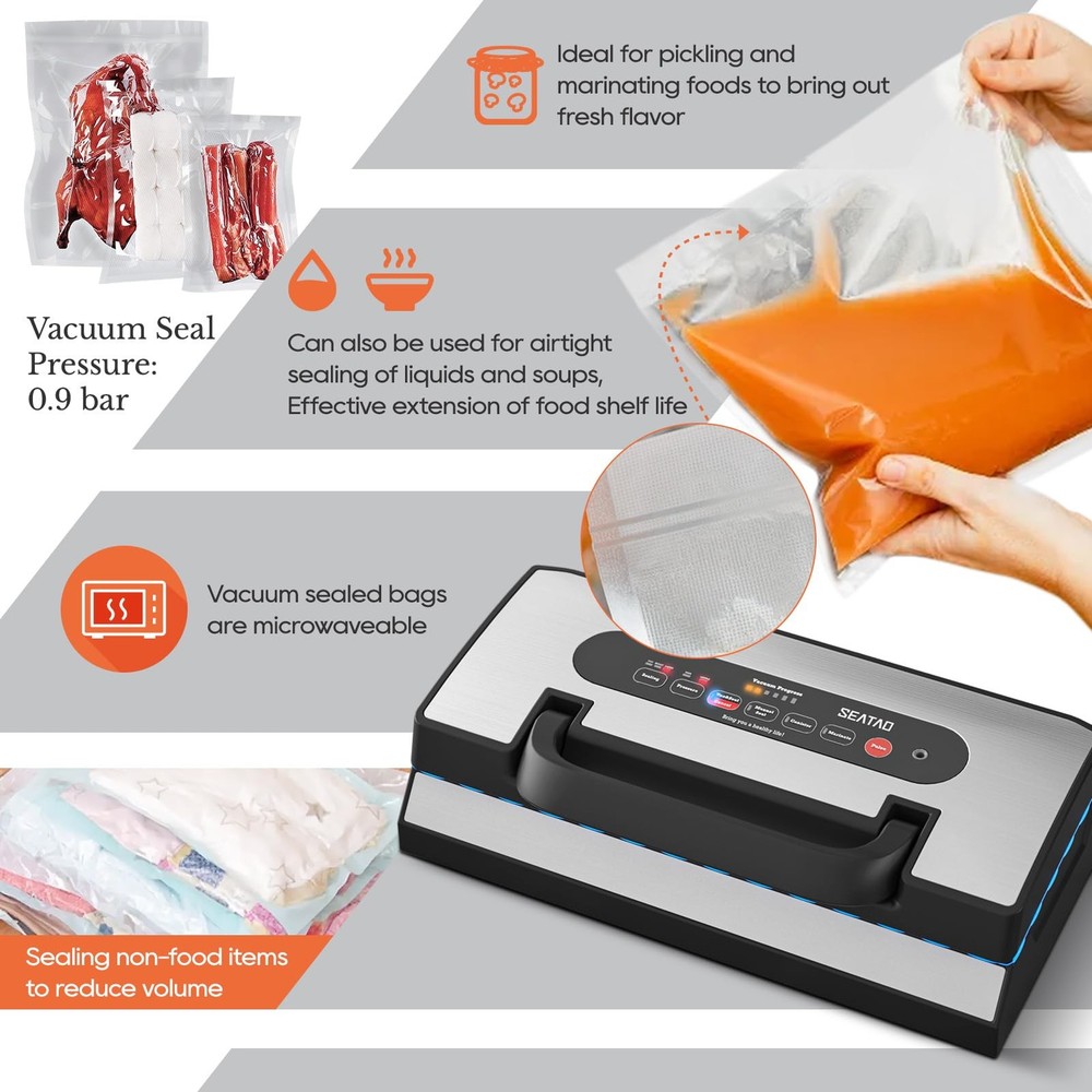 vacuum food vacuum sealer machine vacuum sealer machine seal a meal vacuum sealer machine food vacuum sealer machine vacuum food vacuum sealer Commercial vacuum sealer vacuum sealer machine with bags commercial vacuum sealer machine vacuum sealer bags commercial vacuum sealer machine food vacuum sealer machine vacuum food machine meat sealers vacuum packing machine vacuum sealer commercial food vacuum machines vacuum seal commercial grade food vacuum sealer machine freezer bag vacuum sealer machine bag sealer heat seal with cutter food vacuum sealer machine with cutter seal and save vacuum food seal vacuum machine vacuum sealer for food vacuum seal machine commercial food vacuum sealer commercial grade vacuum sealer commercial vacuum sealer heavy duty food vaccine sealer machine meat freezer sealer machine vacuum packer vacuum sealing food sealers vacuum packing machine with cutter food savers vacuum machines vacuum packers vacuum sealers for food storage vacuum sealer machine with bags vacuum sealer for liquids vacuum sealer for liquid food vacuum sealer for liquid vacuum sealer liquid Multiple Modes & Variable Modes- Unique liquid sealing mode, perfect for liquid sealing of soup, juice, wine and so on. Not only with special liquid sealing mode, but also multiple modes such as (Dry/Moist /Liquid), vacuum pressure (Strong/Soft), vacuum sealing, manual sealing, container, marinade, pulse, to meet the sealing needs of different kinds of food for optimal freshness. Strong & Efficient & Continuous Work- SEATAO Vacuum sealer for liquids is equipped with 90kPa powerful vacuum pump, which can quickly complete the food vacuum sealing in only 6-12 seconds, with built-in LED touch screen to display the process. Unique patented cooling system allows the sealer to work continuously for more than 200 times without overheating, avoiding bag melting and sealing quality is guaranteed. Double Heat Sealing & Higher Quality & More Convenient- The 90Kpa vacuum sealer for liquids is equipped with double-layer heat sealing strips to ensure your safe sealing experience. Sealing liquid or moist food will be safer. Featuring a patented handle system, the lid can be easily locked by pressing it with one hand instead of two, ensuring a tight and consistent seal. Provides users with a high quality and convenient experience. ETL Test Quality & Design for Manufacturing Quality- Food vacuum sealer for liquid is ETL certified by a nationally recognized testing laboratory and meets strict safety standards. This vacuum sealer machine has a sleek and compact design that is perfect for the countertop. and it's made of stainless steel, which is sturdy and well-made, and comes with a removable drip tray for catching spills, making cleanup a breeze. What To Get & 5 Years Warranty- This vacuum food machine comes with 1* Vacuum Sealer Machine , 1* Extra Foam Gasket , 1* External Vacuum Tube, 2* Vacuum Roll, 5* pcs Multi-functional pumping vacuum bags 1* User Manual. And we offer the vacuum sealer 5 years warranty; if you have any problem, please give us a chance to help you.