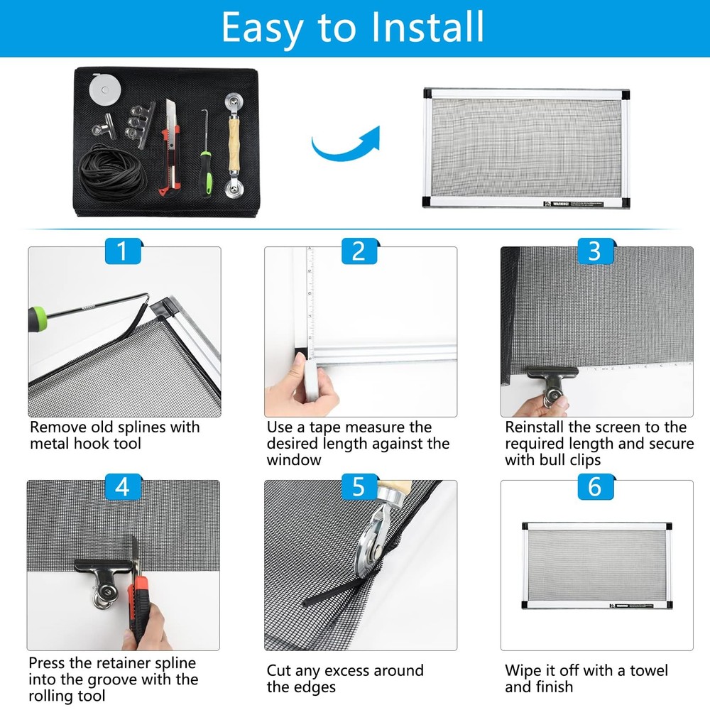 【Screen Repair Kit】Our package includes: Thickened Pet Proof Window Screen, Wood Handled Spline Tool, 2 x 14.5ft Screen Retention Splines , knife, spline removal hook, tape measure, 4 bull clamps and an expandable window cleaning brush 【Screen Repair Kit】Our package includes: Thickened Pet Proof Window Screen, Wood Handled Spline Tool, 2 x 14.5ft Screen Retention Splines , knife, spline removal hook, tape measure, 4 bull clamps and an expandable window cleaning brush 【Heavy Duty Pet screen】The upgraded pet proof screen is designed specifically for pets and made of reinforced PVC coated polyester. Different others, pet-proof screen is more thick and durable, can prevent animals from destroying your screen 【Multiple Functions】Pet proof window screen is in size 15x11(apertures/sq.in.), allowing for natural circulation of fresh air while providing high visibility and keeping pets safe indoor. The perfect balance between protection, shade and visibility 【Widely Used】Window screen replacement has extremely high thickness and is suitable for a variety of applications: screen repair, screen doors, car screens, cat and dog sliding doors and other DIY screen applications 【Easy to Install】Available in a variety of sizes :36 "/48 "/60 "x100", suitable for all sizes of DIY design requirements. This is enough to make some storm Windows/doors or repair some screen doors with material left over, saving costly repairs