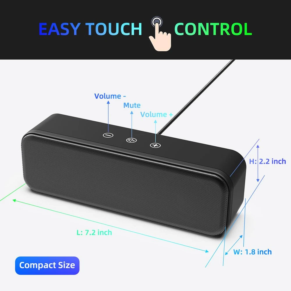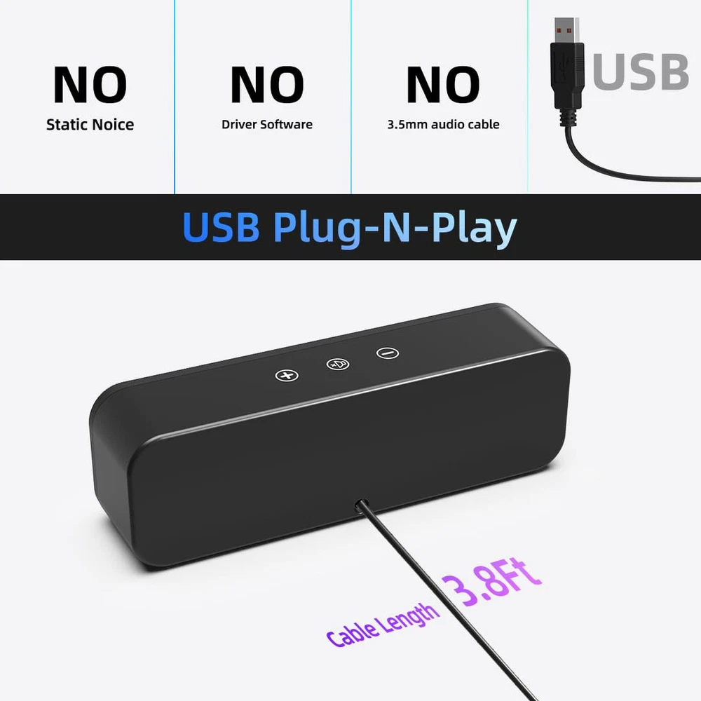 SIMPLE AND STYLISH: This speaker features a rectangular body with the perfect golden ratio, complemented by its matte black color, making it an ideal addition beneath any monitor. HiFi SOUND EXPERIENCE: The enhanced speaker features dual larger speaker drivers and a passive radiator, ensuring the delivery of surprisingly robust audio and punchy bass from such a compact size. EASY TOUCH CONTROL: There are 3 convenient touch buttons on the top, allowing you to effortlessly mute the speaker and adjust the sound volume with ease. USB PLUG-N-PLAY: With no 3.5mm headphone jack, static noise, or driver software required, simply plug in the USB cable and enjoy high-quality crystal-clear loud sound. FULL COMPATIBILITY: Compatible with Windows, macOS, Chrome OS, Linux - for any use on PCs, laptops, and desktop computers. NOTE: Please avoid connecting it to a TV/TV-Box/Projector/Monitor/Xbox/PStation for usage, as the USB ports on these devices may not provide sufficient power to drive our speaker, resulting in a potentially lower maximum volume.