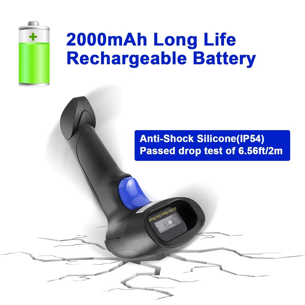 Prominent Decoding Ability (1D/2D) - Barcode reader is equiped with advanced CMOS sensor, which can easily capture 1D/ 2D(QR/ PDF417/ Data Matrix,etc) bar codes from paper and screen, such as computer monitor, smartphone or . Three Trigger Modes - Manual Scan & Auto-sensing Scan & Continuous Scan. 1800mAh battery ensures 20 hours of continuous handsfree scanning, no pressing the button for efficiency. Working Mode - Instant upload mode / storage mode. Scan and barcode when far away from the receiver,and then update the data to your device when you come back entering the wireless transmission range. Hands-Free Stand - Includes an adjustable stand that’s very easy to install. Very convenient to use in environments like warehouses, supermarkets, libraries, etc. with Windows, Mac, and Linux; works with Quickbook, Word, Excel, Novell, and all common software.
