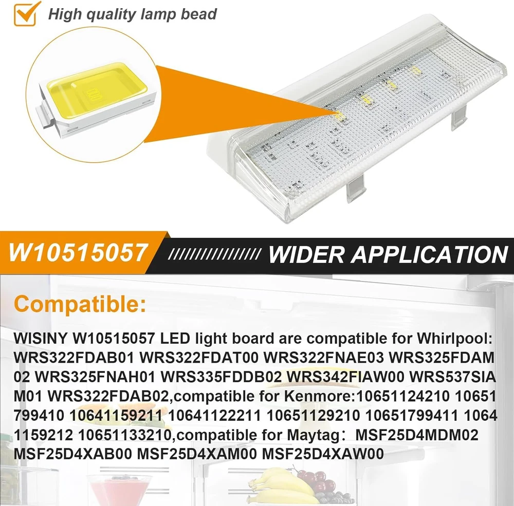 Upgraded W10515057 Refrigerator LED Light Board 1PCS Product Details Color: 1PCS W10515057 LED Light Shape: Rectangular Material: Polyvinyl Chloride (PVC) Light Source Type: Light Emitting Diode Brand: Popbee W10515057 Freezer LED Light : It is for Whirlpool/Kenmore/Maytag/Kitchen aid/ikea refrigerators replaces WPW10515057 AP6022533 W10515057 PS11755866 W10398007 refrigerator LED light Premium Quality: W10515057 Refrigerator LED Lights with tapered lens cover can ensure long life with PVC cover, and it's made of waterproof material for greater durability. This whirlpool refrigerator light replacement led will YOUR last w10515057 refrigerator LED light (w150515057, wpw10515057) Widely Compatible: W10515057 freezer light Fits for Whirlpool: WRS322FDAB01 WRS322FDAT00 WRS322FNAE03 WRS325FDAM02 WRS325FNAH01 WRS335FDDB02 WRS342FIAW00 WRS537SIAM01 WRS322FDAB02, Fits for Kenmore: 10651124210 10651799410 10641159211 10641122211 10651129210 10651799411 10641159212 10651133210, Fits for Maytag: MSF25D4MDM02 MSF25D4XAB00 MSF25D4XAM00 MSF25D4XAW00, and fits for Kenmore 1065,1064 series Confident Purchases: if you have any questions after receiving the package, we are always at your service