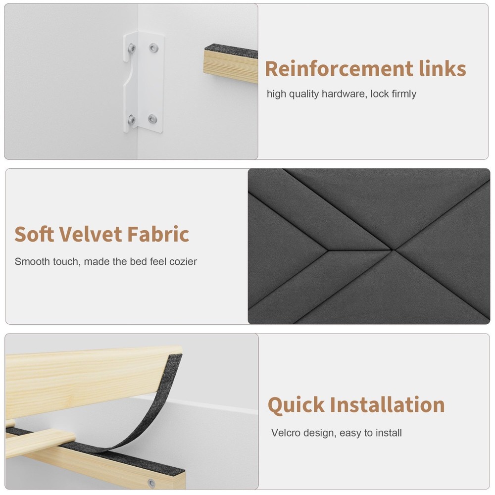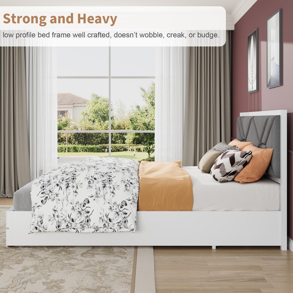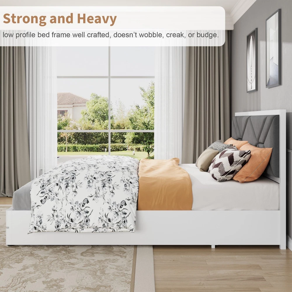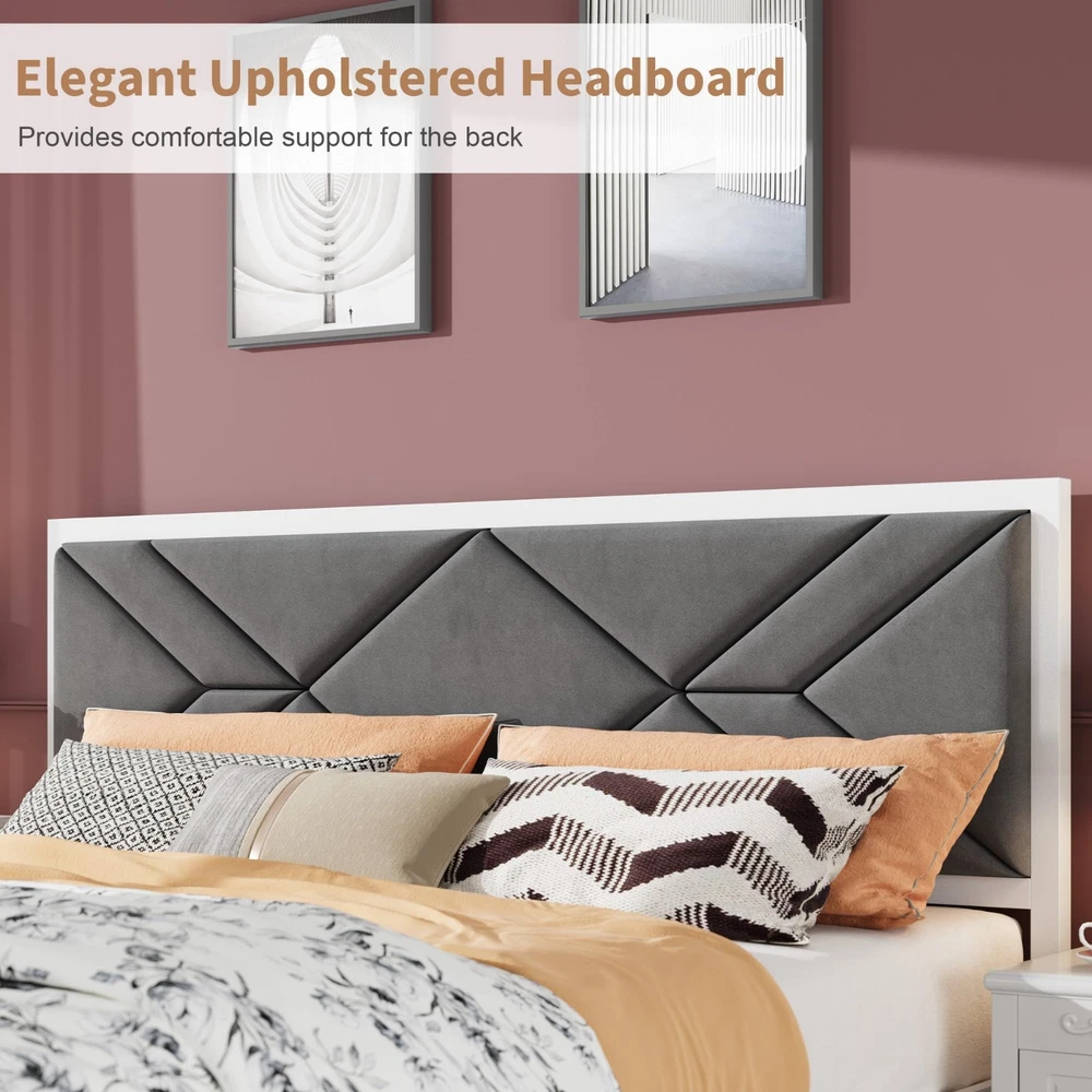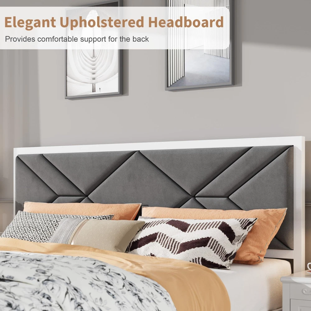 Modern Upholstered Headboard for Added Comfort This stylish bed frame features a soft fabric-upholstered headboard with plush padding, offering the perfect backrest for reading, relaxing, or watching TV in bed. The clean, modern design complements a variety of bedroom décor styles—from minimalist to contemporary and classic. Quiet, Stable & Noise-Free Design Enjoy uninterrupted sleep with the bed’s reinforced metal and wooden support system. Securely positioned slats reduce mattress movement, eliminate squeaks, and ensure a stable and noise-free sleeping environment throughout the night. Compatible with 8–12 Inch Mattresses Designed to support most mattress types—including memory foam, hybrid, latex, and innerspring—this platform bed performs best with 8–12 inch mattresses. No box spring is required, providing a cleaner and more streamlined setup. Durable Wood & Metal Construction Crafted with solid wood slats and a strong metal frame, the bed delivers reliable long-term support and structural durability. The sturdy slatted base replaces bulky box springs, offering better ventilation and extended mattress lifespan. Fast & Easy Assembly All components, tools, and instructions are neatly packed for quick and simple assembly. Its versatile upholstered design blends beautifully into apartments, master bedrooms, guest rooms, and modern home interiors.