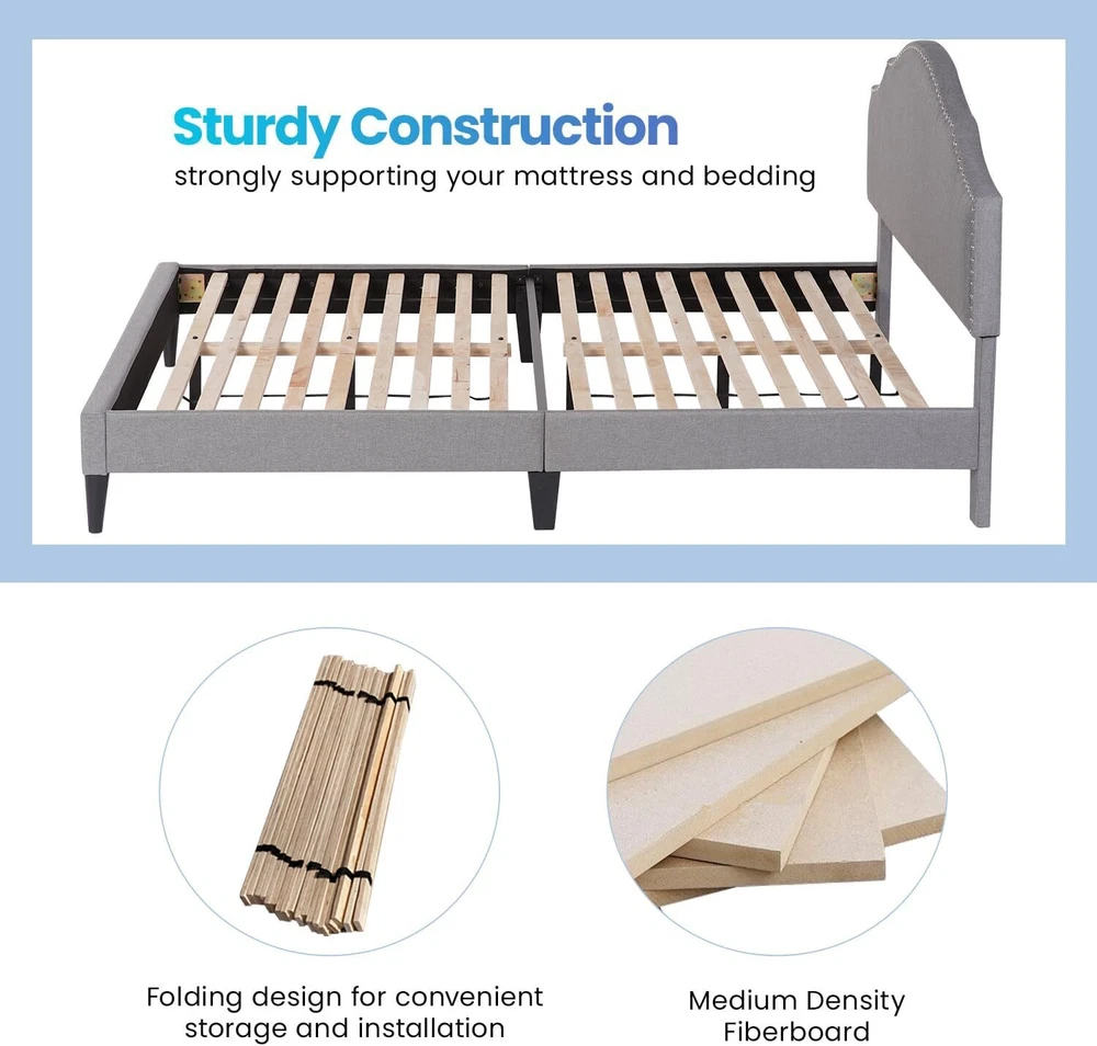 Upholstered Platform Bed Frame with Fabric Headboard and Wooden Slats Support