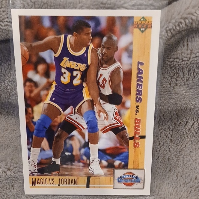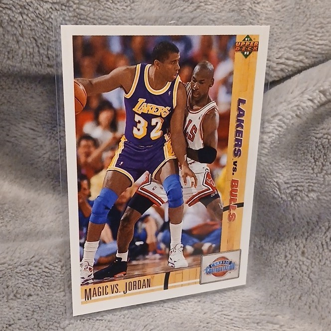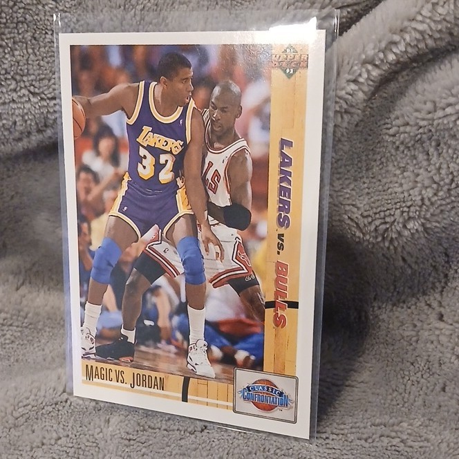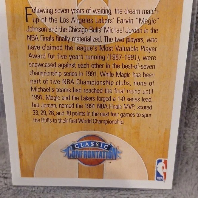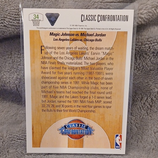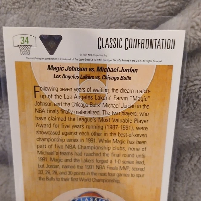 Player/Athlete:Magic Johnson, Michael JordanEvent/Tournament:NBA FinalsSport:BasketballInsert Set:Classic ConfrontationCard Number:34Material:Card StockCard Name:Magic vs. JordanLeague:National Basketball Association (NBA)Year Manufactured:1991Card Condition:Near mint or betterOriginal/Licensed Reprint:OriginalSeason:1991Card Size:StandardType:Sports Trading CardVintage:YesSet:1991 Upper DeckManufacturer:Upper DeckLanguage:EnglishFeatures:Classic ConfrontationTeam:Los Angeles Lakers, Chicago Bulls