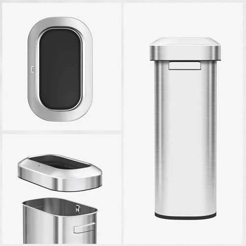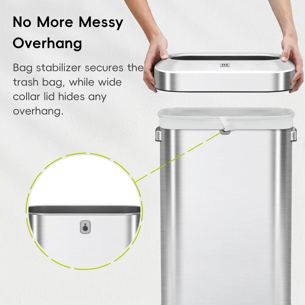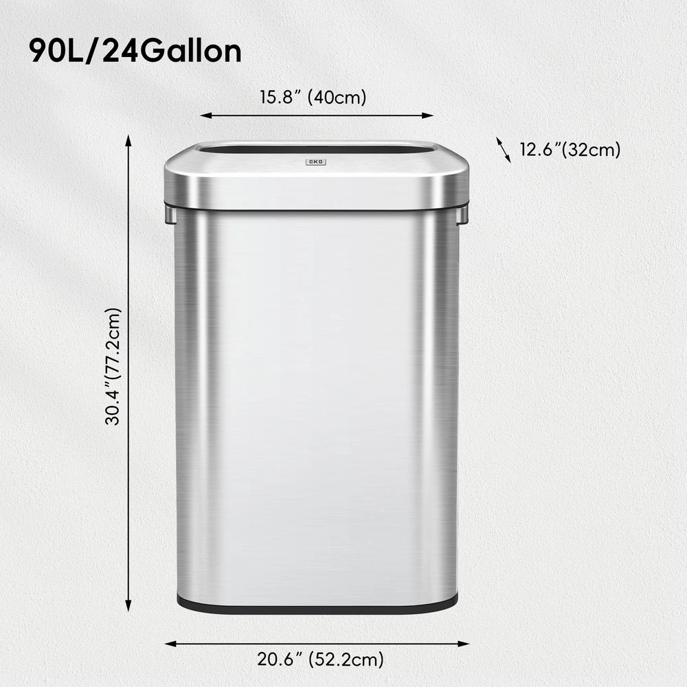 [Large Capacity] At 24Gal/90L, this stainless steel trash can suits both home and business environments, catering to diverse disposal requirements. [Effortless Trash Disposal and Cleanup] The wide open top trash can allows for easy trash disposal, while the detachable lid simplifies cleaning and bag changes, making the entire process a breeze. [Slim Space-Saver] This kitchen trash can features a sleek vertical design, allowing it to fit snugly against the wall and save space. [No More Messy Overhangs] The built-in plastic bag fixer keeps your trash bag securely in place, while the wide lid hides bags from sight, providing a cleaner, more organized visual appeal for your trash bin. [Easy Mobility] Equipped with practical side handles, moving this large trash can becomes effortless, facilitating hassle-free repositioning. [Secure Placement] The skid-resistant base provides stability, preventing the garbage can from slipping or moving unintentionally.