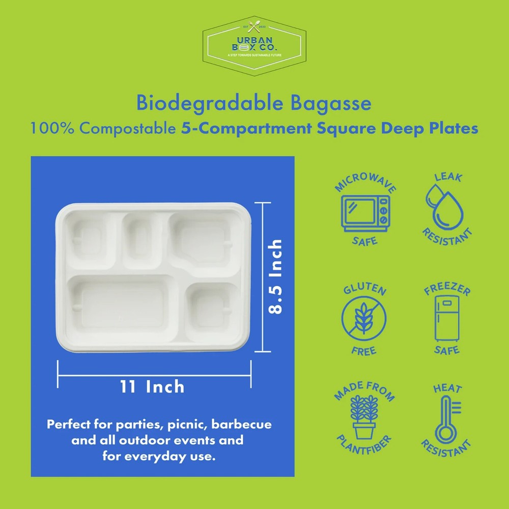 Urban Box Co 100% Compostable Extra Strong Heavy-Duty 5-Compartment Rectangle Deep Paper Plates - 50-Pack Elevate your dining experience with our 100% Compostable Extra Strong Heavy-Duty 5-Compartment Deep Paper Plates. Crafted from eco-friendly bagasse, these plates are designed for durability and convenience, making them perfect for any occasion—from school lunches to catering events. Choose our Extra Strong Heavy-Duty 5-Compartment Deep Paper Plates for a sustainable, stylish, and practical dining solution. Order your 50-pack today and redefine your dining experience while making a positive impact on the environment! 5-Compartment Design: Features five deep compartments for serving a variety of dishes without mixing flavors, perfect for balanced meals and snacks. Extra Strong & Heavy-Duty: Crafted from sturdy materials to hold hot and cold foods securely, ensuring no leaks or messes during your events. 100% Compostable & Eco-Friendly: Made from natural bagasse, these plates are fully compostable, helping to reduce environmental impact while promoting sustainability. Versatile for Every Occasion: Ideal for school lunches, catering events, parties, and everyday dining, offering a stylish and convenient solution for any gathering. Convenient 50-Pack: Comes with 50 large disposable plates, making it easy to stock up for large gatherings, picnics, and regular use. Urban Box Co sturdy sectional compostable dinner plates are perfect for everyday use. Eco-friendly & biodegradable disposable plates.