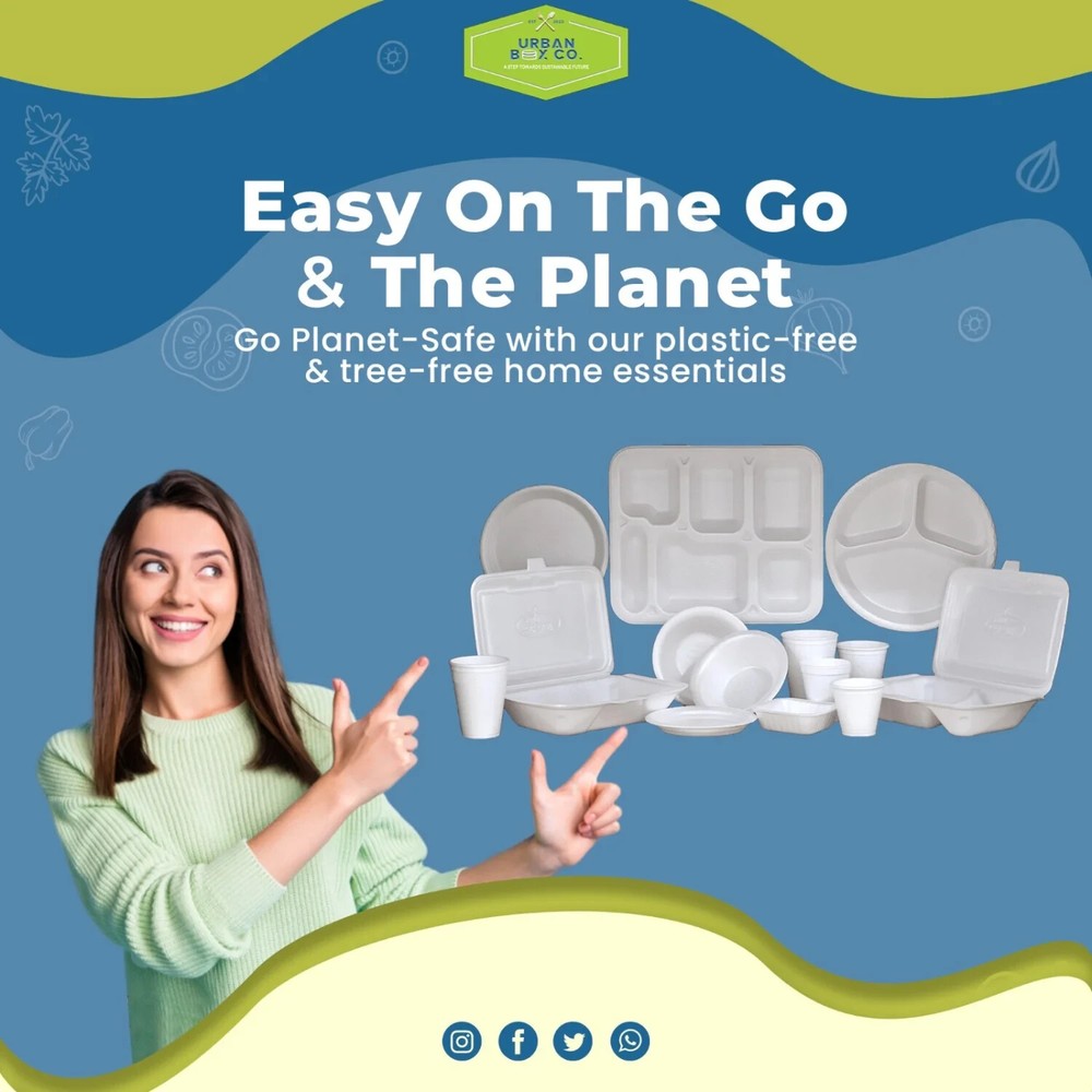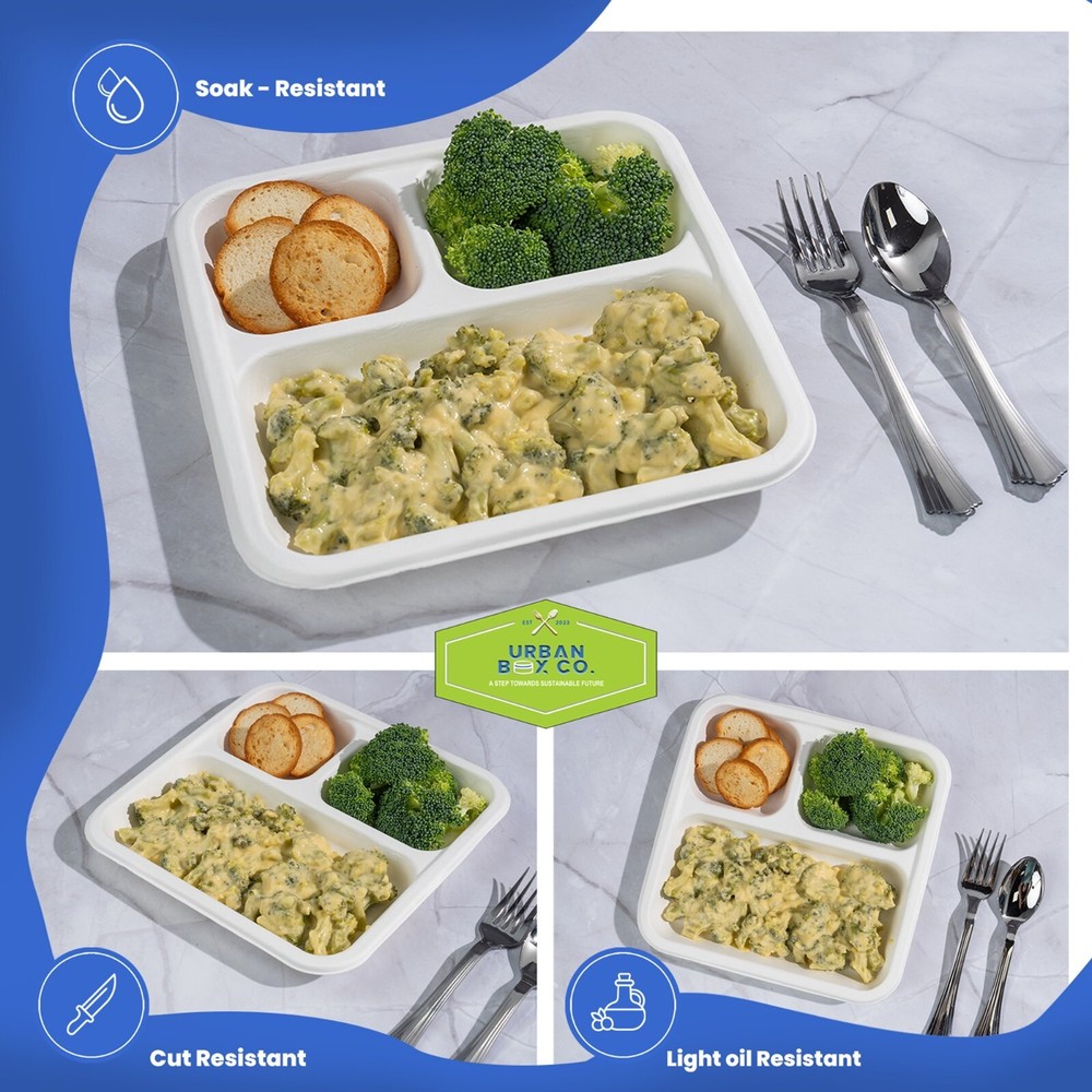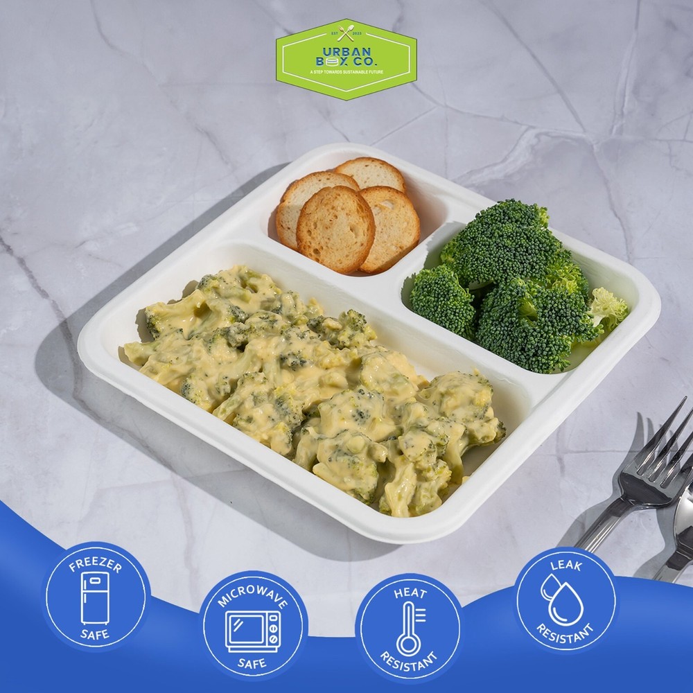 Serve up eco-friendly convenience with these 100% Compostable 6 Compartment School Rectangle Meal Trays. This 50-pack of heavy-duty, sugarcane bagasse paper plates is perfect for schools, cafeterias, parties, and family gatherings. Made from renewable sugarcane fiber, each tray offers six compartments, ideal for portion control and keeping foods separate. Safe for the microwave, these trays are sturdy enough to hold hot, cold, and heavy foods without bending or leaking. Upgrade your mealtime setup with these eco-friendly, compostable, and disposable school meal trays that prioritize both functionality and sustainability. Perfect for green-conscious consumers looking for high-quality, biodegradable lunch trays that are gentle on the environment. Eco-Friendly & 100% Compostable: Made from renewable sugarcane bagasse, these trays are fully compostable, providing a sustainable alternative to plastic and foam plates. 6 Compartment Design: Ideal for keeping food separated, each compartment is perfectly sized for main dishes, sides, and sauces, making it ideal for school lunches, cafeterias, and events. Heavy-Duty & Sturdy: Crafted from high-quality sugarcane fibers, these plates are built to hold heavy meals without bending, soaking, or leaking, even with hot or cold foods. Microwave Safe: Designed for convenience, these trays are microwaveable, allowing you to heat food directly on the plate without worry. 50 Pack Value: Includes 50 compostable plates, offering an ample supply for events, gatherings, or daily use in schools and homes. Safe & Non-Toxic: Free from harmful chemicals, these disposable trays are safe for use with any type of food, offering peace of mind for you and the environment. Urban Box Co sturdy sectional compostable dinner plates are perfect for everyday use. Eco-friendly & biodegradable disposable plates.