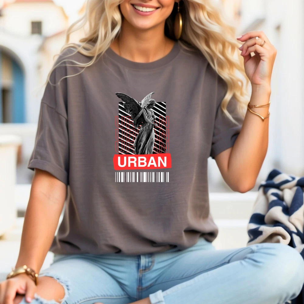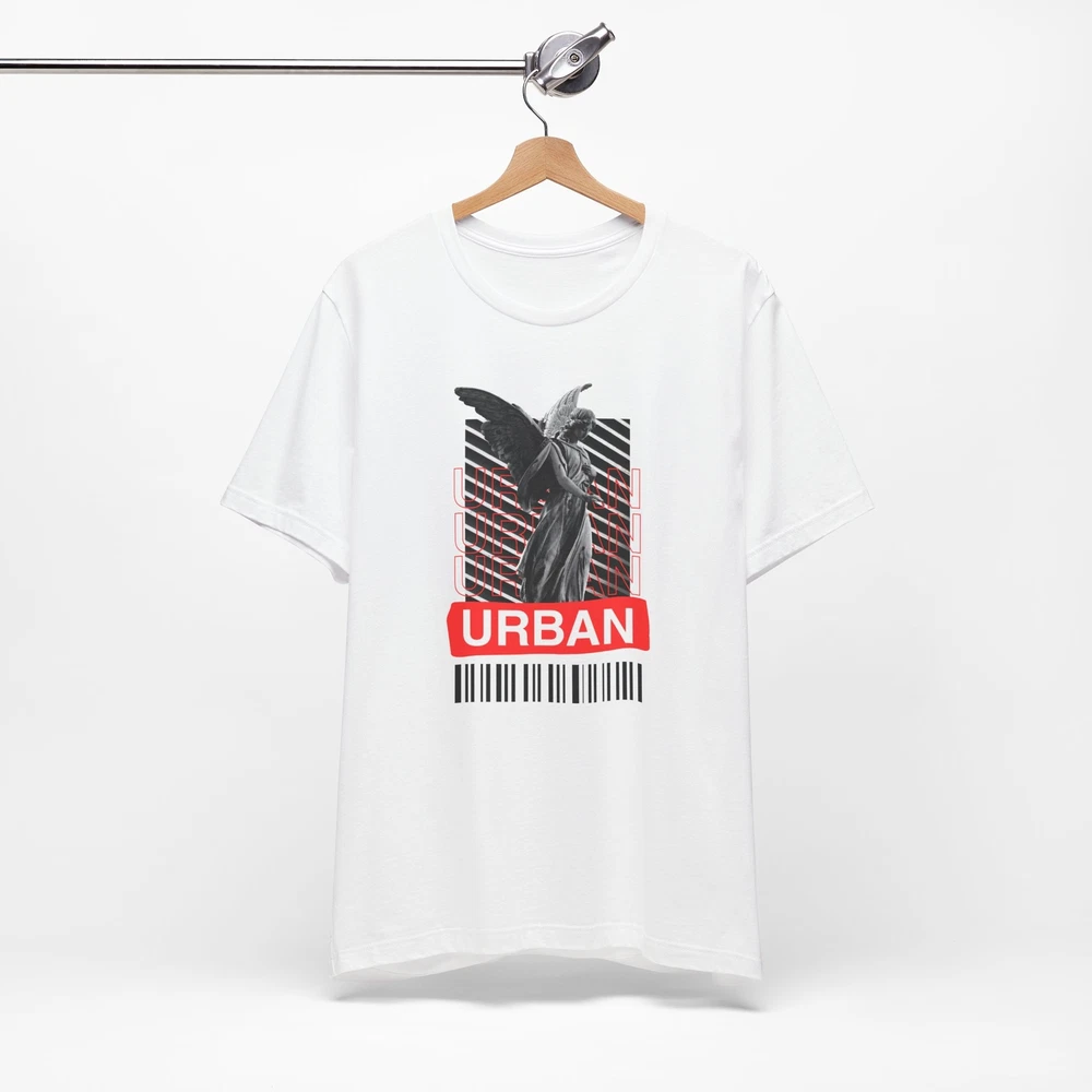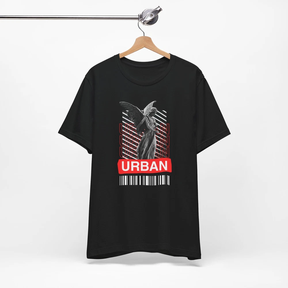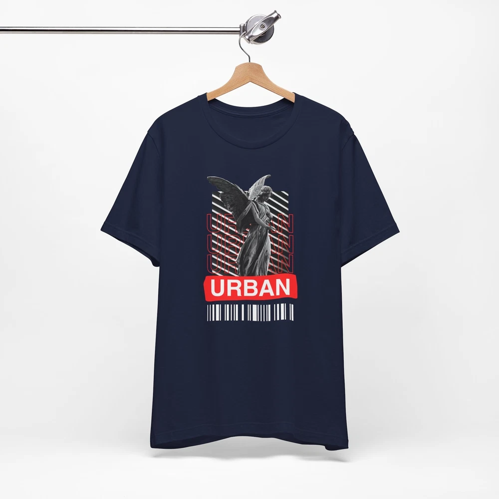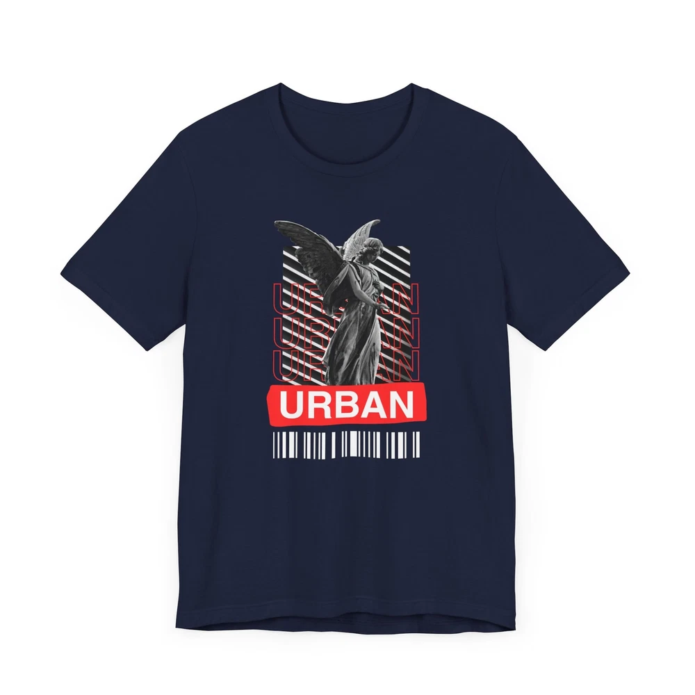 "Embrace urban elegance with our 'Urban' T-shirt, featuring a captivating image of an angel with wings. This tee merges the gritty charm of city life with the ethereal beauty of heavenly imagery, creating a unique and eye-catching design. Crafted from premium materials, it offers both comfort and style for your everyday adventures in the concrete jungle. Whether you're strolling through the streets or making a statement with your fashion, let this shirt be your urban-inspired wardrobe essential. Elevate your streetwear game with our 'Urban' tee, available in a range of sizes and colors to suit your urban style." This classic unisex jersey short sleeve tee fits like a well-loved favorite. Soft cotton and quality print make users fall in love with it over and over again. These t-shirts have-ribbed knit collars to bolster shaping. The shoulders are tapered for a better fit over time. Dual side seams hold the garment's shape for longer. .: Made with 100% Airlume combed and ring-spun cotton, a lightweight fabric (4.2 oz/yd² (142 g/m²)) that is easy to layer, breathable. Perfect for active and leisure wear. .: The retail fit that is perfect for casual and semi-formal settings. The crew neckline adds a classic, neat style that's perfect for accessorizing. .: Bella+Canvas manufactures all its products in the US and internationally in humane, no-sweat-shop, sustainable way and is part of the Fair Labor Association as well as Platinum WRAP certified. .: The tear-away label minimizes skin irritations. .: Fabric blends: Ash and Heather Prism colors - 99% Airlume combed and ring-spun cotton, 1% polyester; Heather and Solid Blend colors - 52% cotton, 48% polyester; Athletic Heather and Black Heather - 90% cotton, 10% polyester.