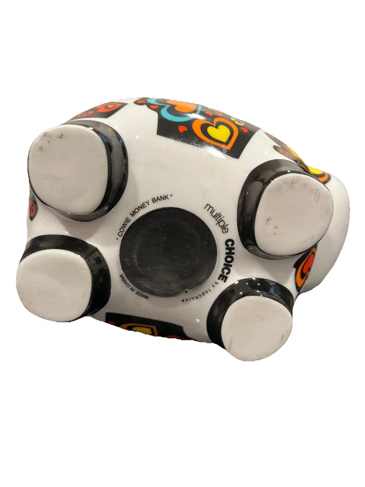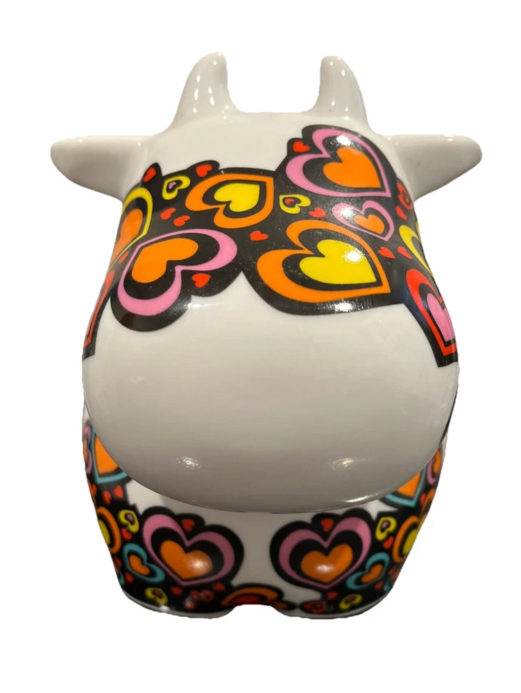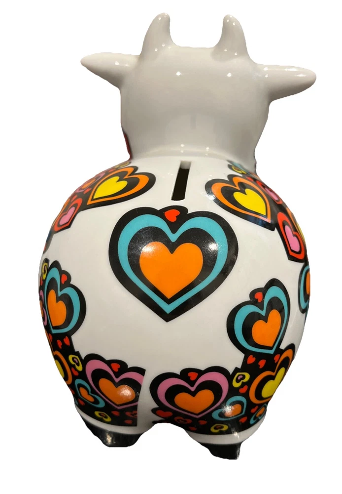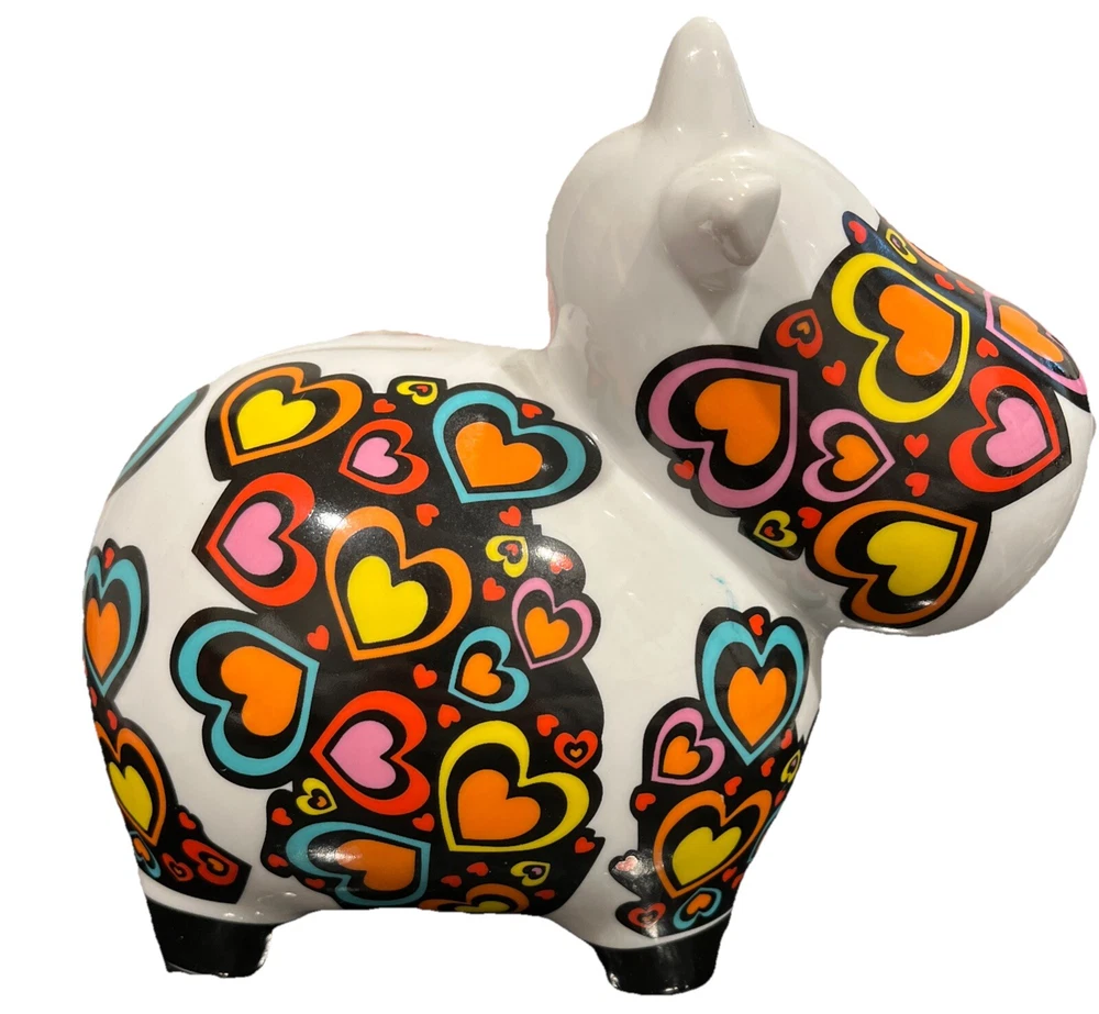 Urban Outfitters Cow Covered In Multi Coloured Hearts Piggy Bank Valentine Love approx 8” long 7” high