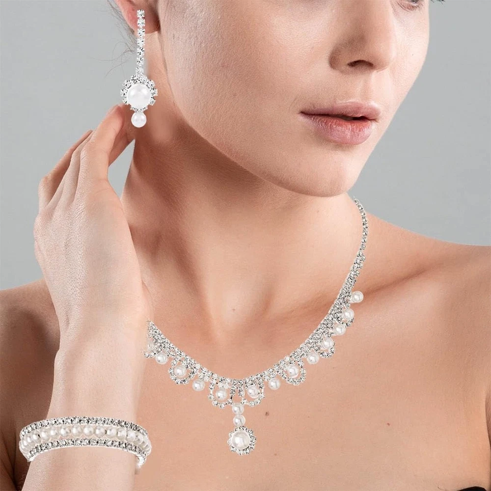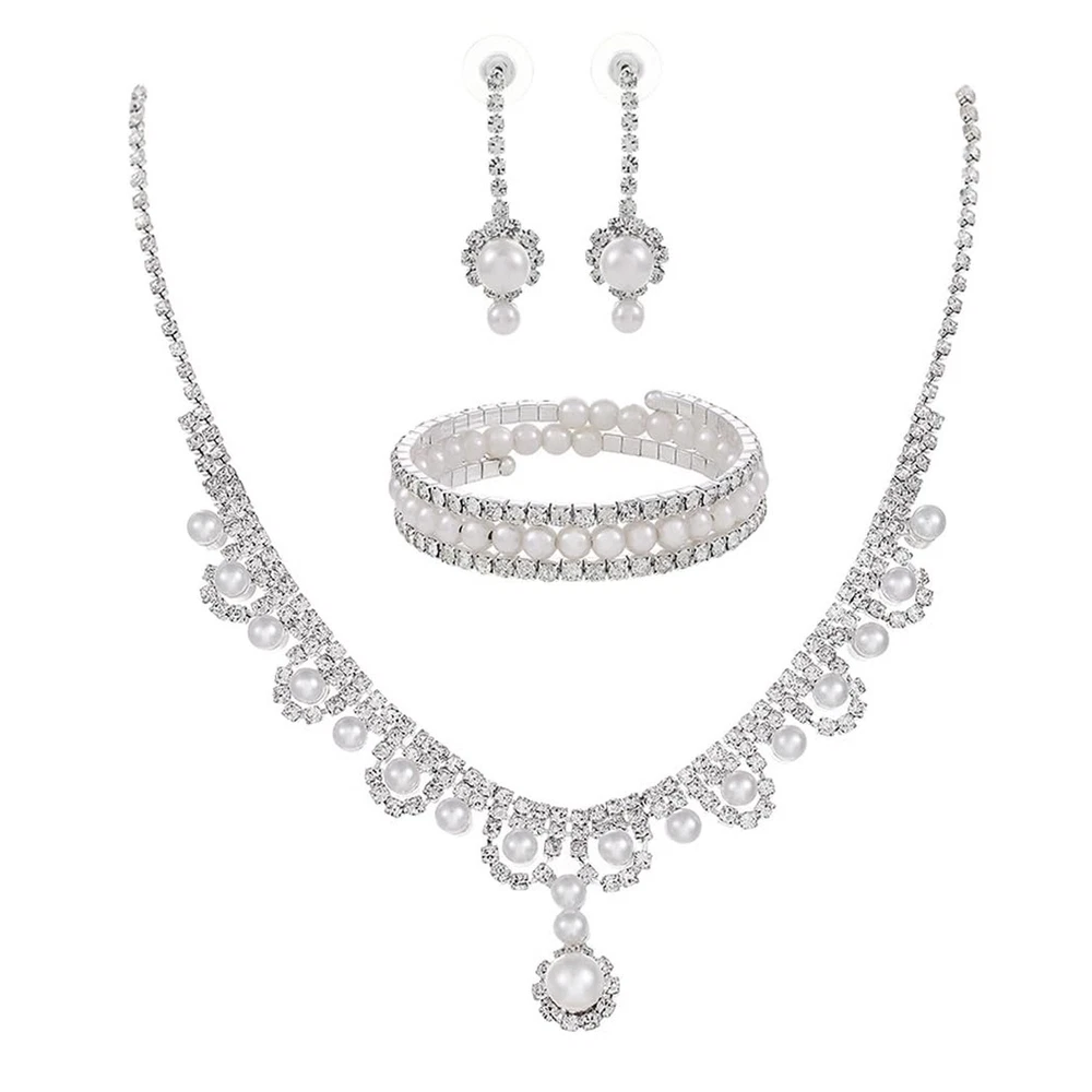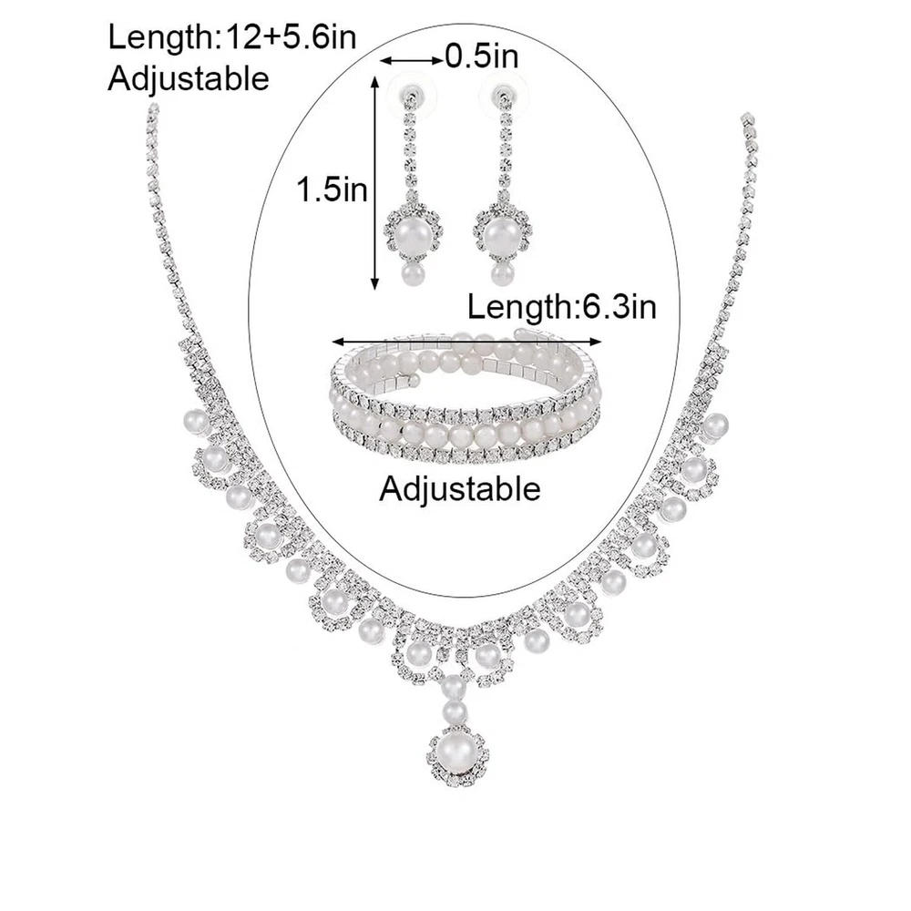 Urieo 3 PCS Pearl Bridal Jewelry Set Silver Rhinestone Necklace Drop Earrings Bangle Bracelet Elegant Costume Wedding Jewelry Accessories Prom Party for Women Bridal Product Details Package Dimensions : 0.1 x 0.1 x 0.1 inches; 0.35 ounces Department : womens Date First Available : February 23, 2024 Manufacturer : Urieo Country of Origin : China Brand, Seller, or Collection Name: Urieo Metal: alloy Material: Metal Gem Type: No Gemstone Clasp: Lobster Clasp Number of stones: 2