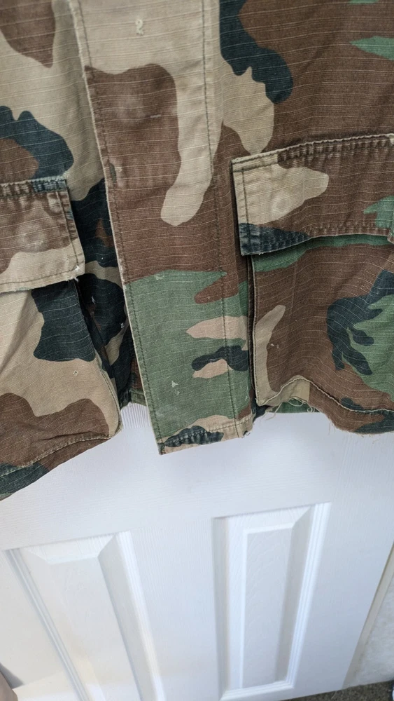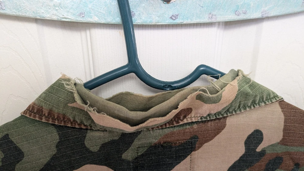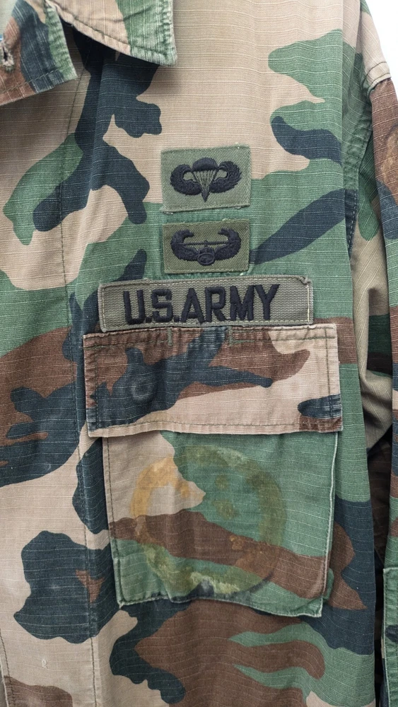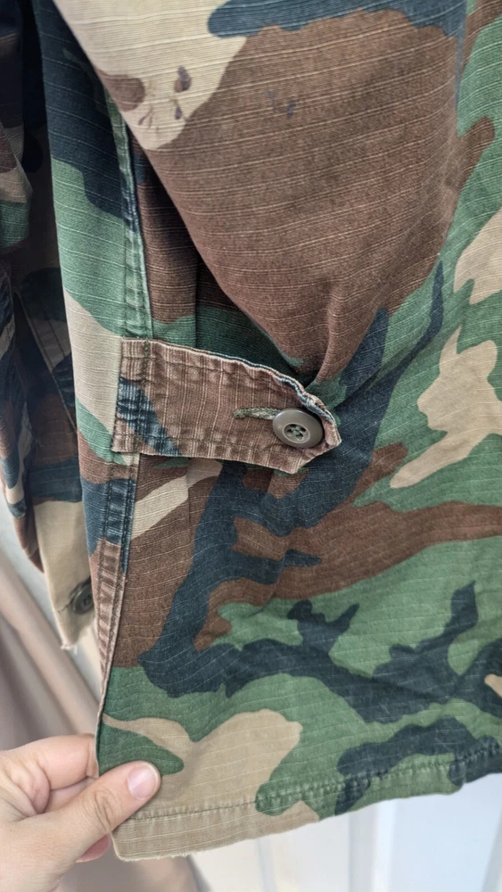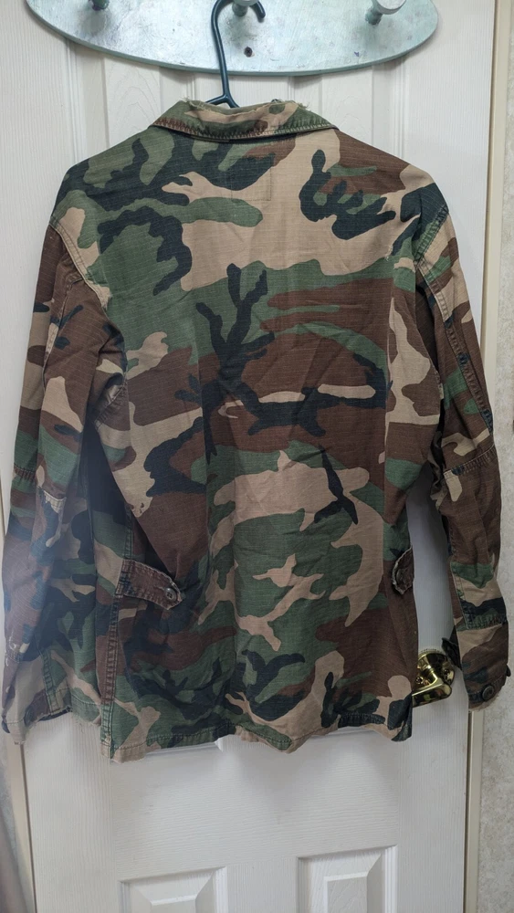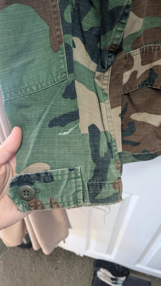 Pit to Pit measurement is 23 in. Shoulder to hem measurement is 28 in. Arm length is 24 in. This is a medium regular. It has patches and 4 pockets. It is distressed and beat up a little bit if you like that style.