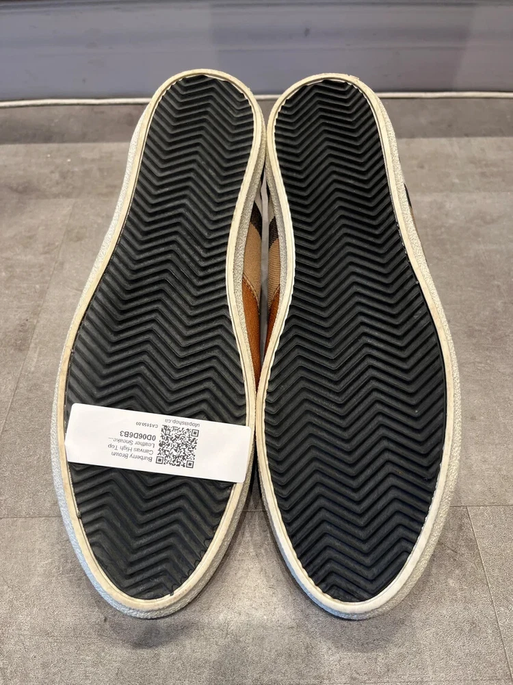 Used Burberry Brown Canvas High Top Leather Sneaker 0D06D6B3 Size 13 SHIPS FAST Condition: Used Comes with No Box Please Note: the pictures always reflect the condition of the shoe. Glue Stains & Manufacturer defects are out of our control. Authenticity Always Guaranteed We Ship Out Orders Same Day if order is placed before 4:00 PM EST Shipments placed on Saturday, Sunday or any Holiday will go out the Next Business Day. Always packaged with care.