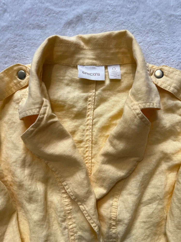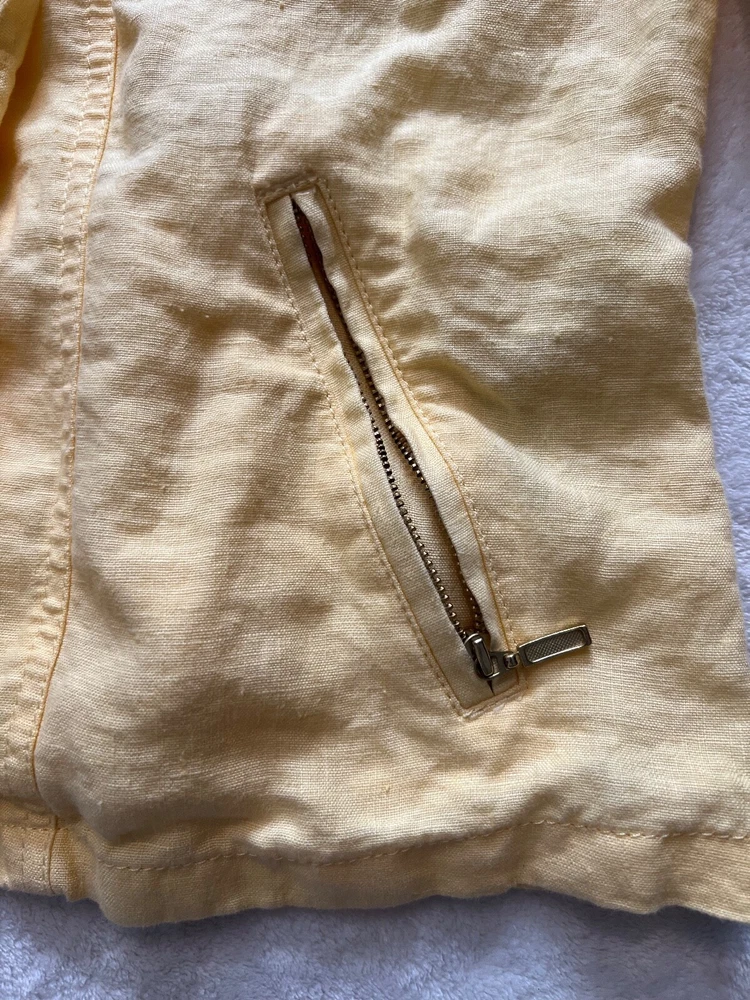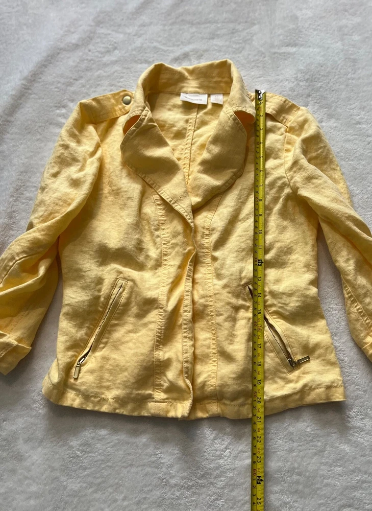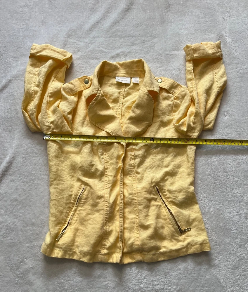 *This is not a new item and does not ship with its original tags. Good condition Size 0 Pockets with zipper closure Long Sleeve Gold accent buttons