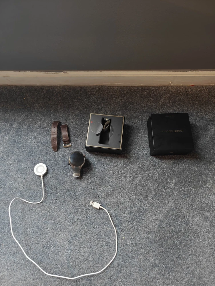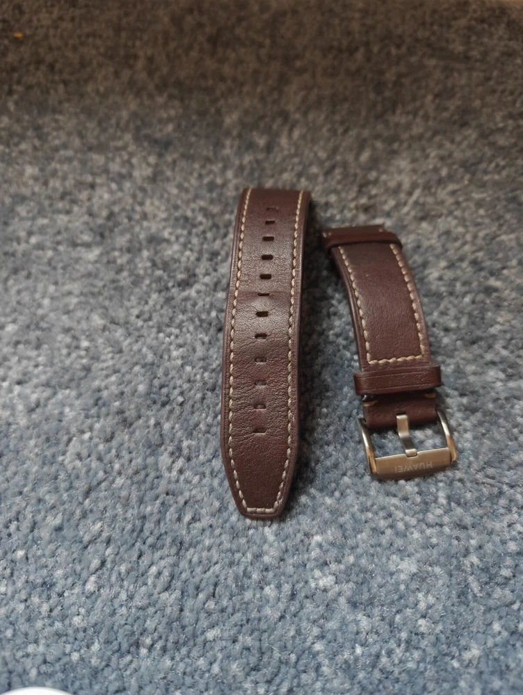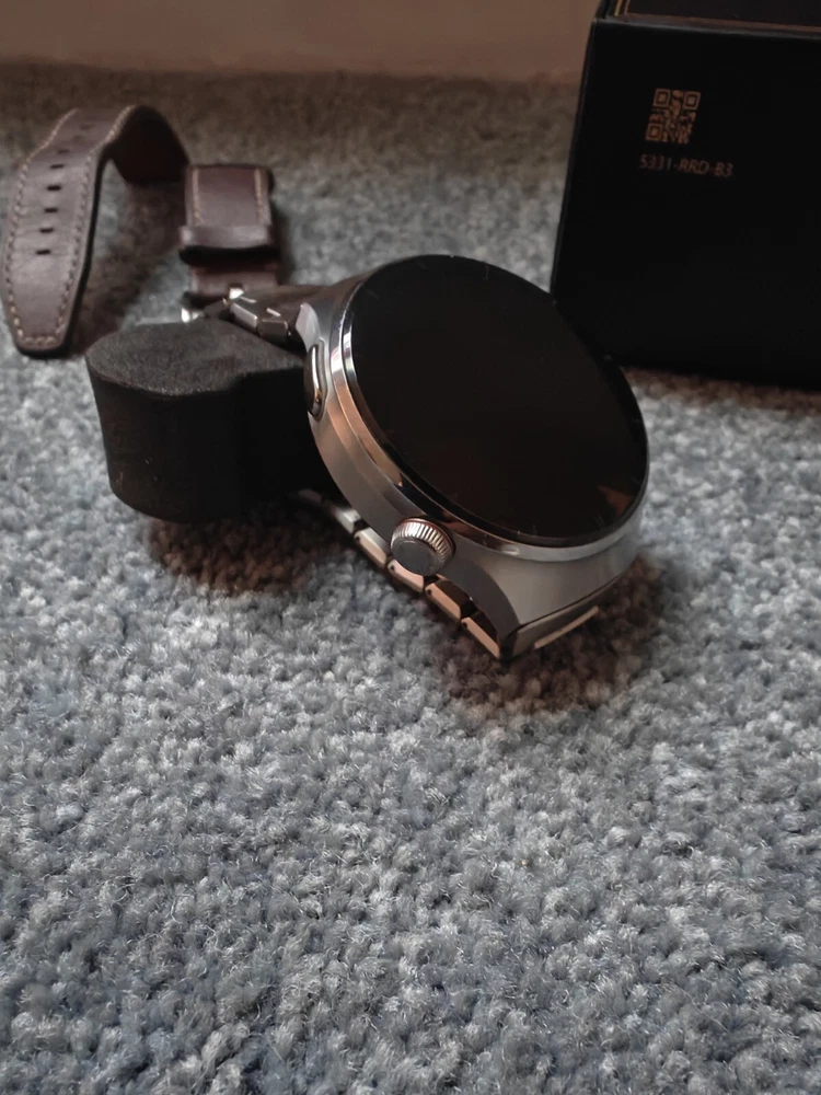 This Huawei Watch 4 Pro smartwatch is a great addition to your collection. With its stunning 49mm aerospace-grade titanium case and dark brown leather strap, this watch is perfect for any occasion. It is compatible with both iOS and Android operating systems and comes with a range of features that will keep you connected and healthy. The watch has a sleek AMOLED display, Bluetooth connectivity, NFC, GPS, and wireless charging capabilities. It also has a blood oxygen sensor, heart rate monitor, and sleep monitor to keep track of your health. With the AppGallery, you can easily access all your favorite apps. This smartwatch is a must-have for anyone who wants to stay connected and healthy. Has a small hair line on watch come with two watch bands one is for small wrist and leather band is for large wrist