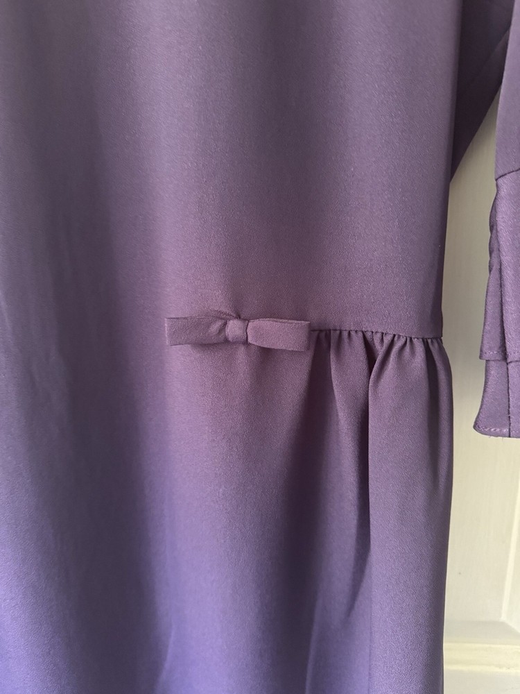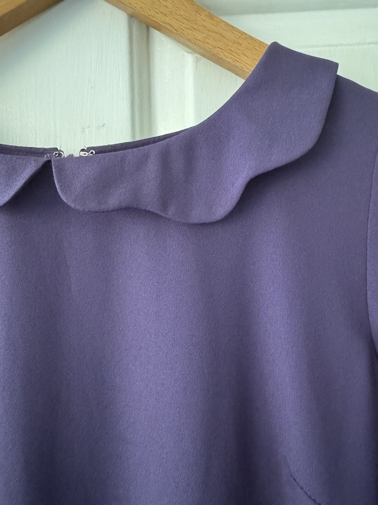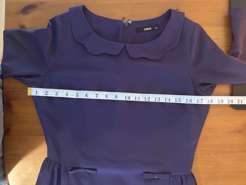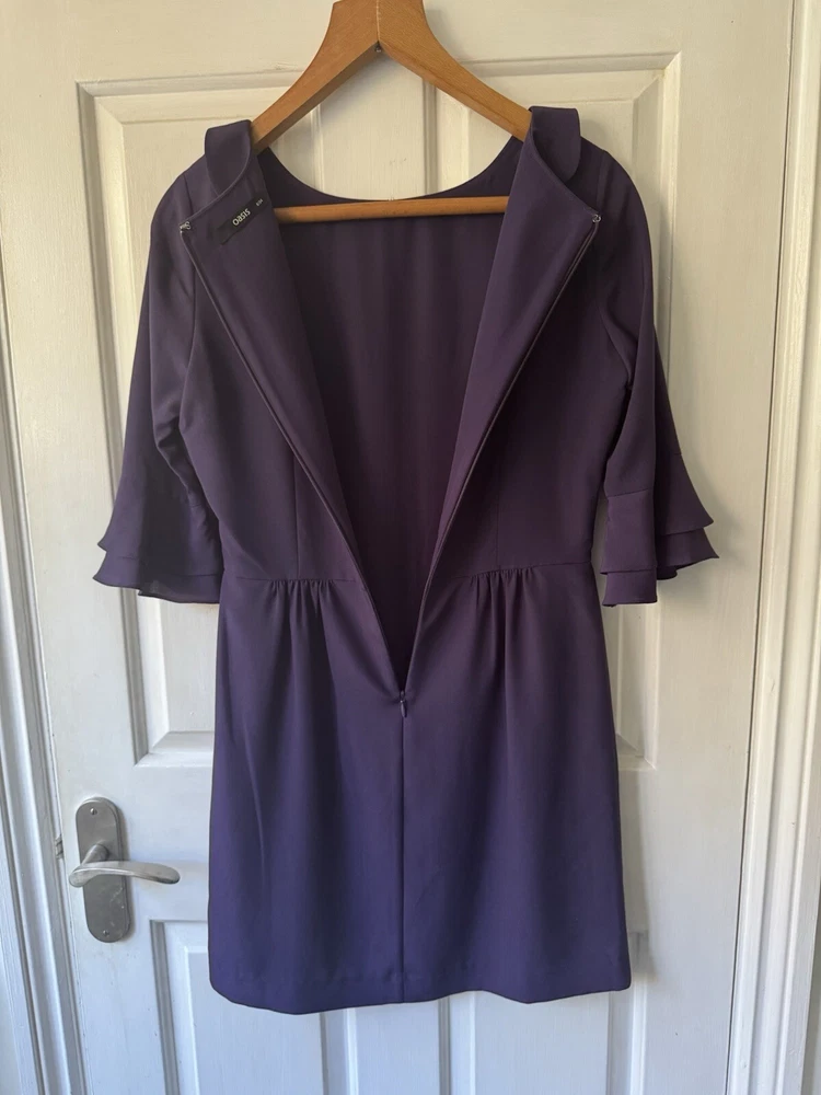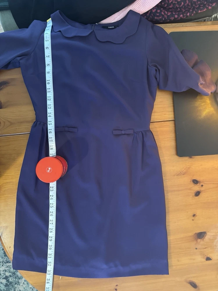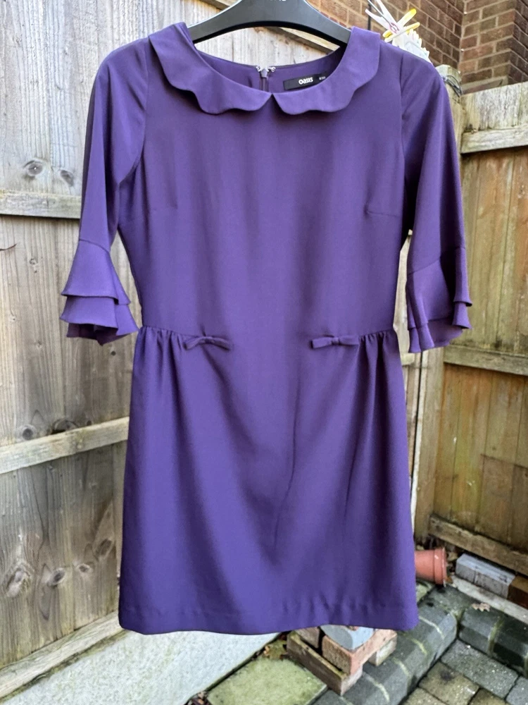 Used. Woman's. Oasis. Size UK 8 / EU 34. Short Dress. Scalloped Collar. Fluted Sleeve Cuffs. Bows at the waistline. Lined. Back Zipper Closure. I am also including a purple bead adjustable necklace. Measurements : Chest 36" / Length 33" (please see photographs). Fabric and care instructions : please see photographs. You pay what I pay for shipping