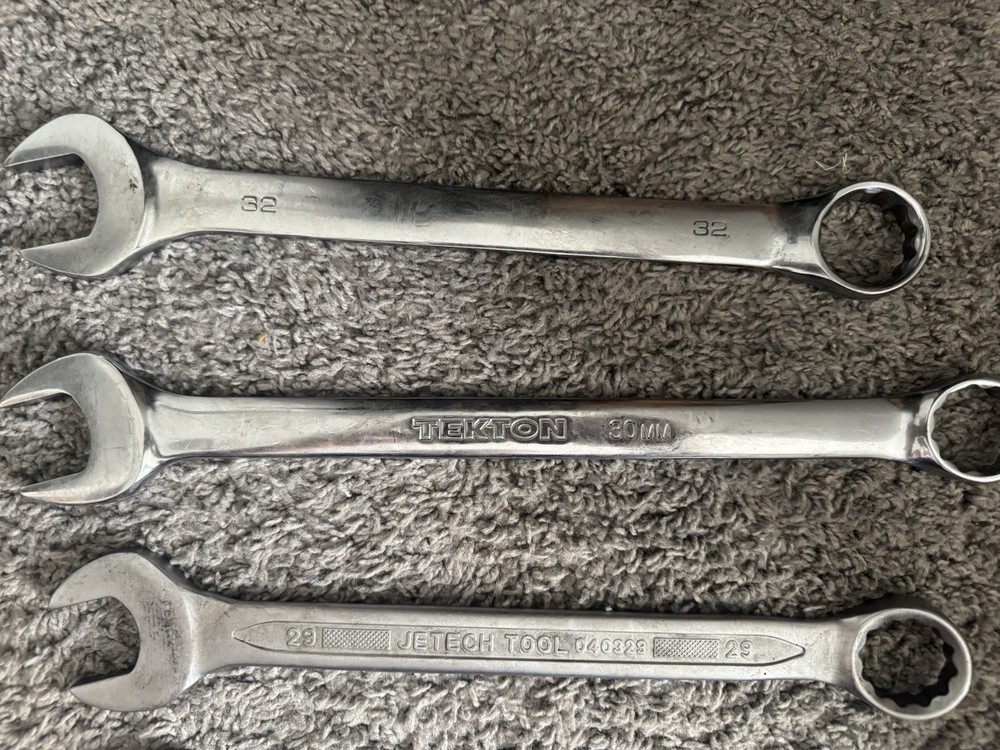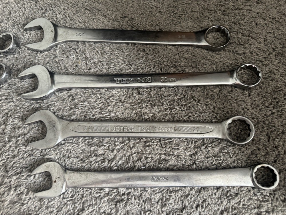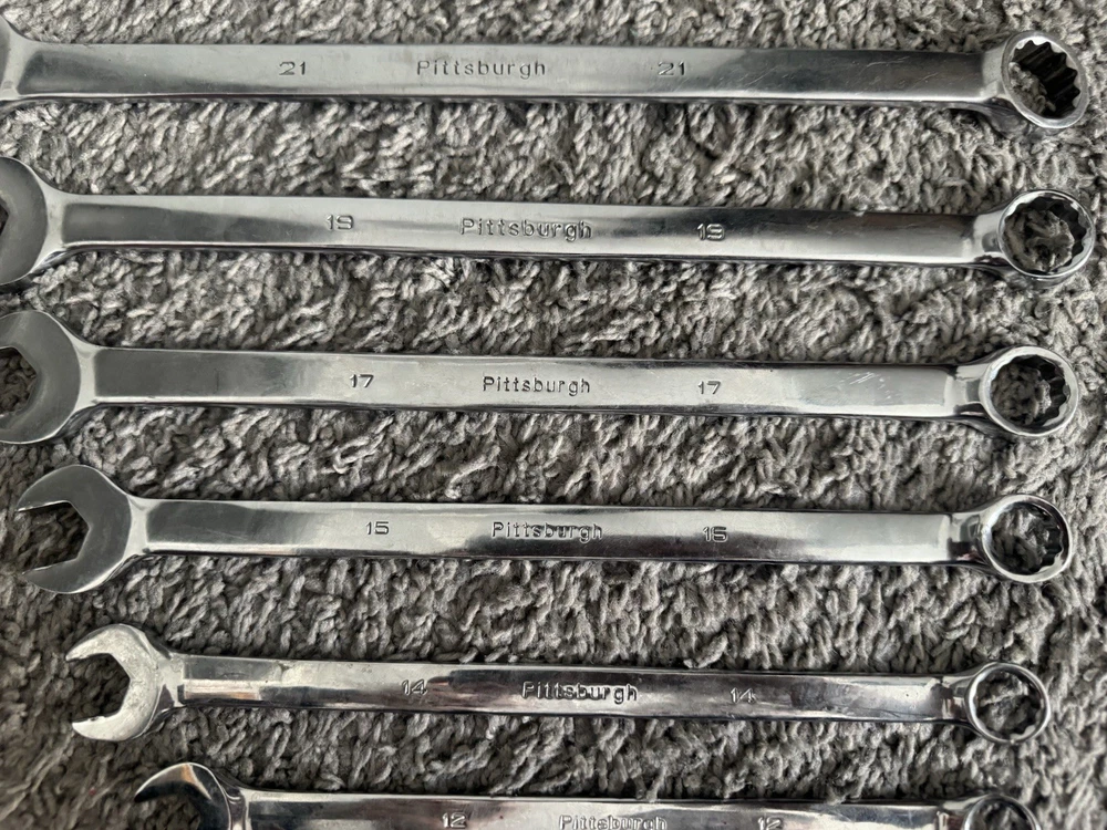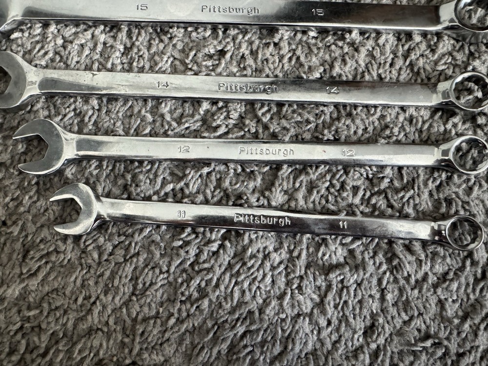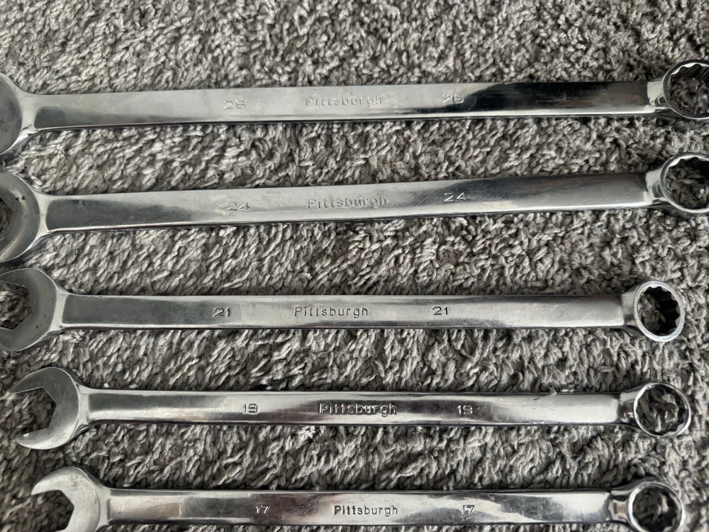 Used wrenches. Have long handles wrenches that are Pittsburgh branded. 26mm, 24mm, 21mm, 19mm, 17mm, 15mm, 14mm, 12mm, 11m. Have regular wrenches in 32mm, 30mm, 29mm, and 1”. All comes together, not separate.