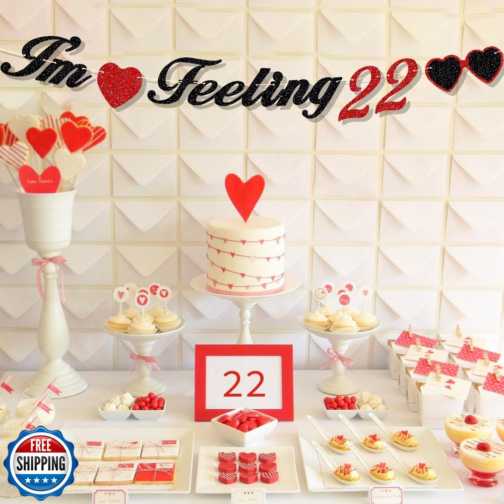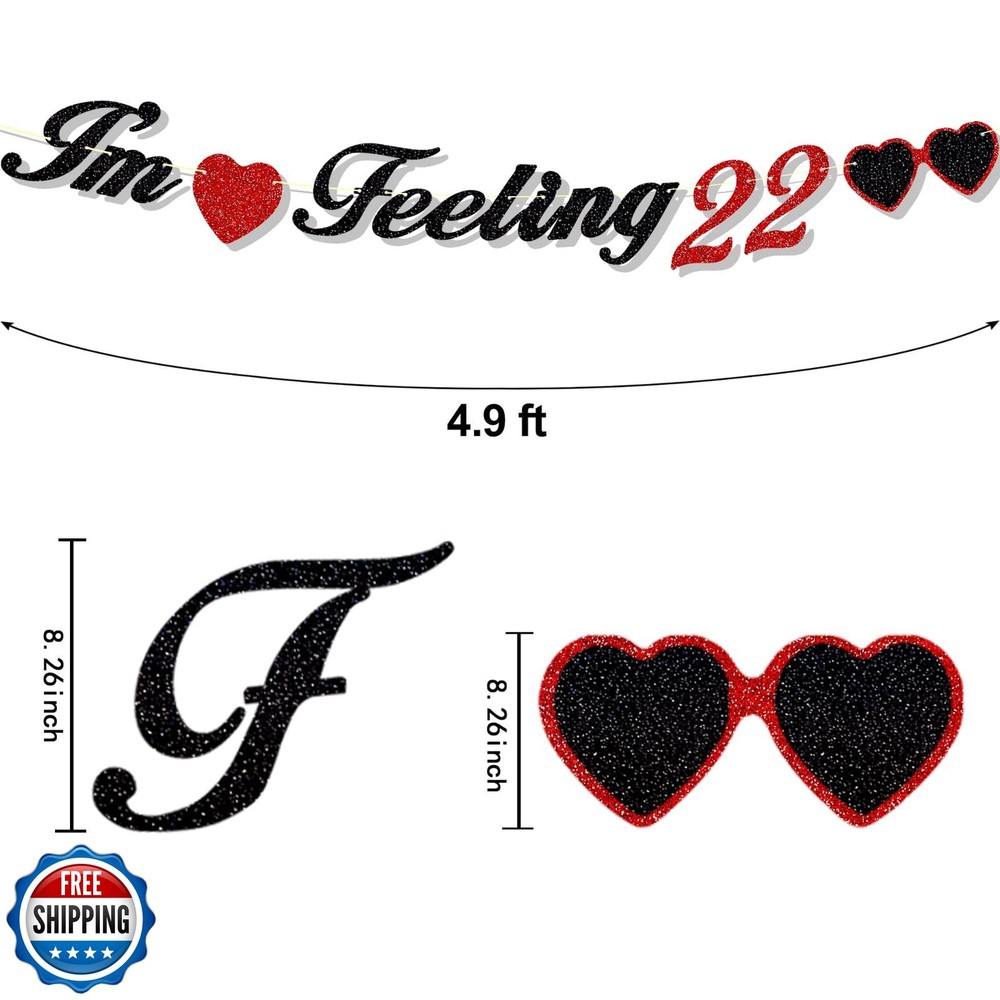 Ushinemi Glitter I'm Feeling 22 Happy Banner, 22nd Birthday Decorations Black Red, Music Theme Party Supplies for TS Fans Features 22nd Birthday Decorations : It is made of high quality glitter cardboard that becomes very shiny in the light, perfect for celebrating birthday Party. Unique Design: Cute letters and patterns with glittery material that make it look so different, which is exactly what you are looking for. It will make a deep impression on you. Perfect Size: The “F” is about 6.5 inch high, the heart is about 5.25 inch high, included 1 pieces of 9.8 feet rope. The vibrant colors are very eye-catching. Awesome 22 Year Old Party Decorations: It’s a pretty banner, a big hit for celebrating the wonderful moment. Easy to Assemble: Banner needs DIY assemble. Arrange the order of the letters or accessories and then string them with ropes. Once assembled it will be really cute. Shipping Free & Fast Shipping: We offer free shipping to most of the USA with a normal delivery time of 3-7 days. However, due to the current situation, additional delivery time (up to 3 weeks) may be required for some items. Alternative Carriers: We may use alternative carriers (e.g., USPS, FedEx, UPS) to ensure your package arrives safely and on time. Due to the use of multiple carriers, we are unable to provide a tracking number automatically. Handling Time: Orders are processed and shipped within 1-2 business days of receiving cleared payment. Shipping Restrictions: Shipping to Alaska, Hawaii, Puerto Rico, Guam, and other US territories may incur shipping charges or delivery restrictions. Please contact us before ordering, or your order can be refunded/cancelled. State Restrictions: Certain items may not be shipped to California due to state regulations. Contact for Tracking Updates: If you require tracking updates or have any concerns about the delivery of your order, please feel free to contact us, and we will be happy to assist you. Return Policy 30-Day Hassle-Free Returns: If you are not completely satisfied with your purchase, you can return the item for free within 30 days of receiving it for a full refund or exchange. Easy Return Process: Contact us, and we will provide you with a prepaid return shipping label and detailed instructions. No Restocking Fee: There are no restocking fees for returns. However, the buyer is responsible for return shipping costs if the return is not due to a seller"s error. Refund Processing: Refunds will be processed within 1 business day of receiving the returned item in its original condition. Feedback Your feedback is extremely important to us. We strive to provide the best products and customer service possible. If you are satisfied with your purchase, please take a moment to leave us a positive review. If you have any concerns or issues with your order, please contact us before leaving negative feedback. We are committed to resolving any problems and ensuring your satisfaction. Contact Us If you have any questions or concerns, please feel free to reach out to our customer support team. You can contact us through the eBay messaging system. We are available Monday to Friday, 9:00 am to 5:00 pm EST, and we will do our best to respond to your inquiry within 24 hours. Thank you for supporting our small family business!