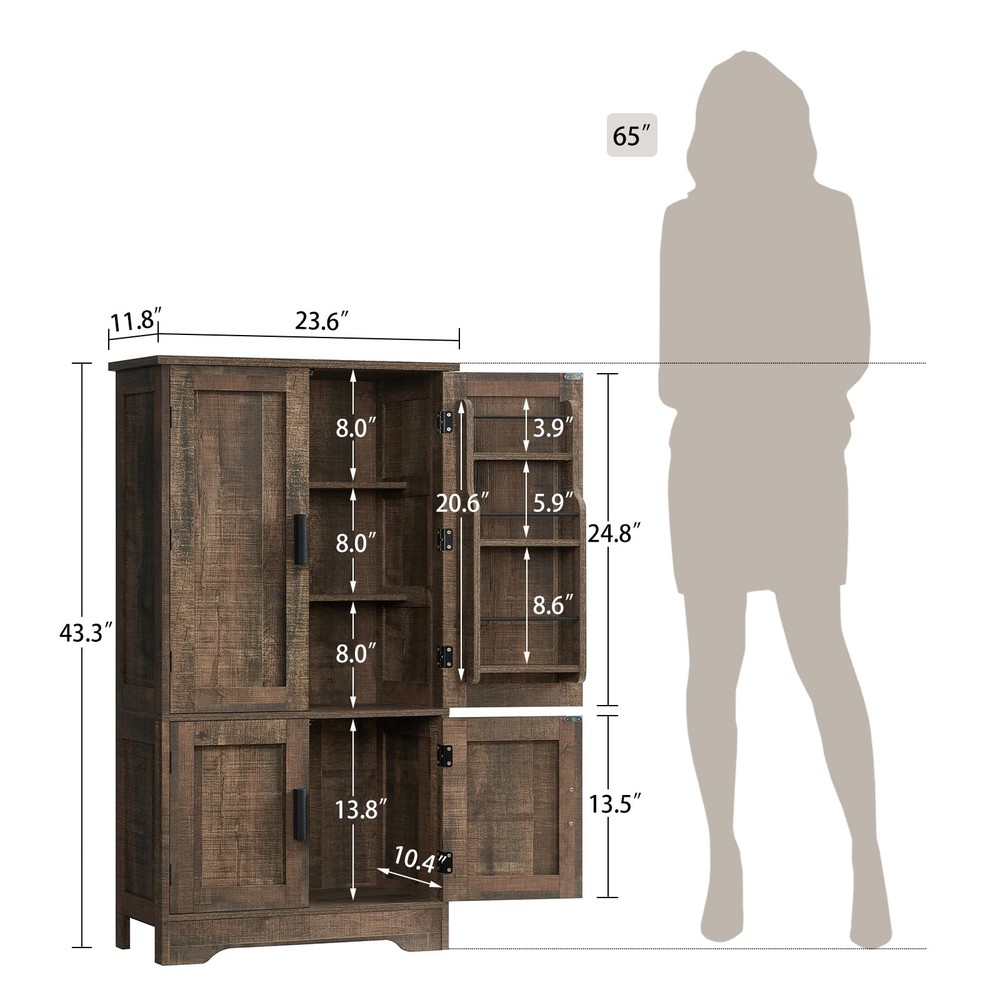 usikey Pantry Cabinet with 4 Doors, Farmhouse Kitchen Cabinet with 6 Door Shelves, Kitchen Pantry with 3 Adjustable Shelves, for Living Room, Kitchen, Antique Oak 【Pantry Cabinet Size】11.8"D x 23.6"W x 43.3"H; Weights: 37.9LB 【Master Organizer】This pantry storage cabinet comes with 2 large double-door storage cabinets, and 1 bottom storage that can meet different heights of storage needs, suitable for everything from your food and utensils to your kitchen appliances. In addition, the upper door cabinet also has 6 hanging shelves for storing your olive oil, spices and other kitchen items, which are easy to find and access 【Multi-functional Pantry Cabinet】This pantry cabinet presents a farmhouse style. With its elegant rustic finish, black pulls and smooth shape design, the storage cabinet fits perfectly into a variety of spaces such as kitchen, dining room, bathroom, living room, study or hallway. It not only provides ample storage space but also adds a touch of rustic beauty. 【Strong & Safe】This tall kitchen pantry is made of P2 grade MDF with a wider and heavier base to ensure stability. In addition, we have equipped you with a reinforced back panel and anti-tilt devices so that you can attach the tall kitchen pantry cabinets to the wall to prevent the pantry from tilting and swaying. 【Easy to Assemble & Service Guarantee】This pantry storage cabinet provides a detailed step-by-step assemble instruction chart and all accessories are labeled with numbers, so you don't have to worry about assembly. Meanwhile, if you have any problems with the installation, please let us know. We will reply to you within 24 hours.