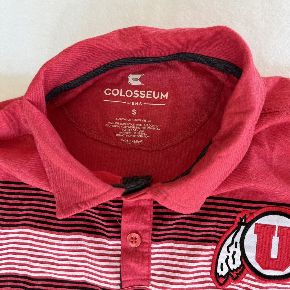 Colosseum Athletic Apparel University of Utah Utes Men's Size Small Polo/Golf Shirt Heather Sport Red short with horizontal black and white stripes across the chest Stitched patch Utah Logo on Left chest Collared shirt with 3-button placket NCAA officially licensed See photos for details, appearance and measurements Brand New With Tags Buy It Now and Save $$ Inv#0479