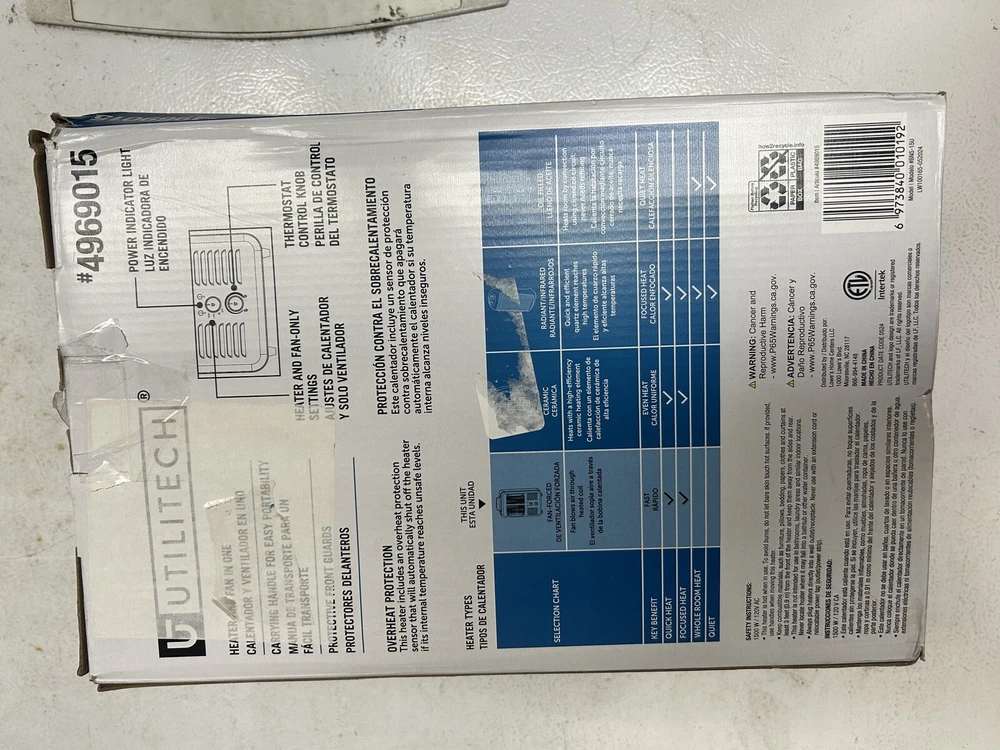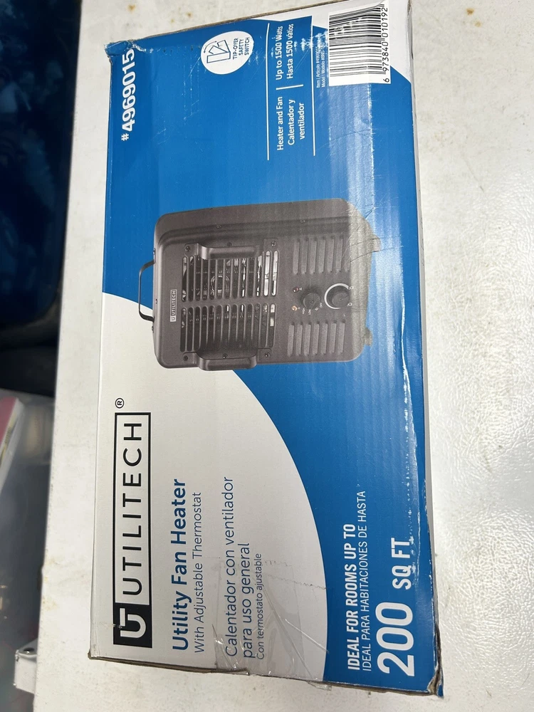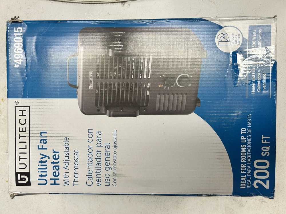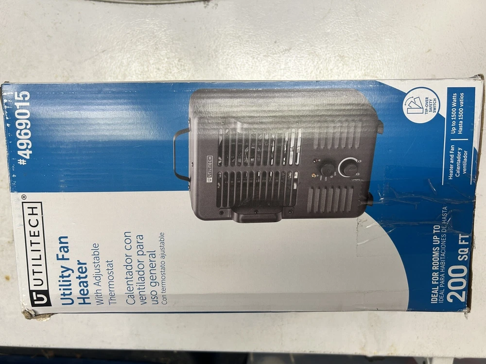 Utilitech 1500 W utility space heater open box condition Space heater has minor scratches and one dent on the foot on the bottom (shown in pictures) This does not affect the operation of the heater The heater has been tested and does work and make heat As with all open box, space heaters extra precaution with using space heaters should be taken to prevent fire damage or personal harm. Please read all instructions if provided with heater and or online about the heater to ensure proper life and safety with the heater. This heater is sold as is with no returns. You are purchasing what you see in the pictures and what’s sad about it in the description.
