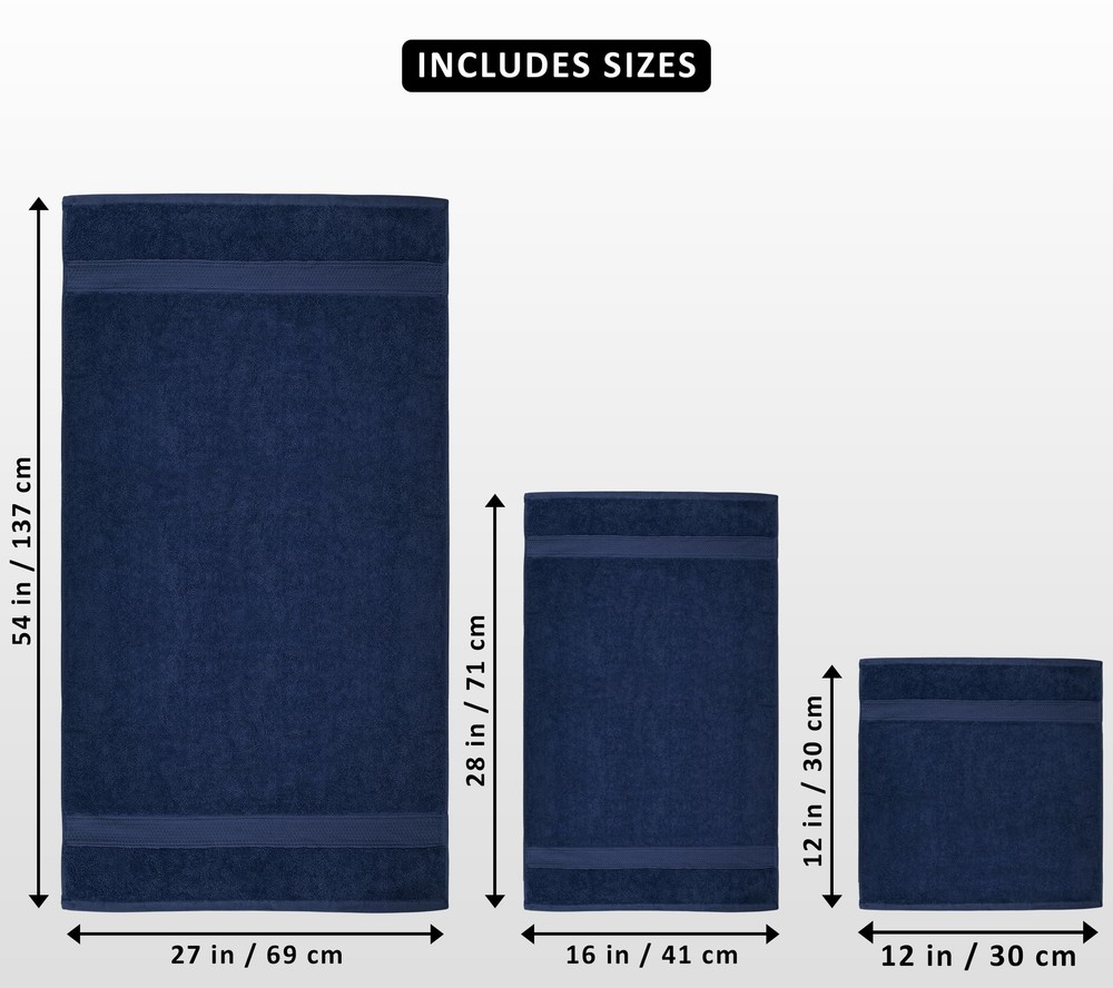 8 Piece Premium Towel Set, 2 Bath, 2 Hand, and 4 Wash Cloths, 600 GSM 100% Ring Spun Cotton, Highly Absorbent Towels for Bathroom, Gym, Hotel, and Spa, Navy Blue Set of 8- Our economic set of towels contain: 2 bath towels measuring 27 x 54 inches each; 2 hand towels of 16 by 28 inches each; and 4 washcloths of 12 inch by 12 inches each Enjoy a spa like experience with our luxuriously soft and absorbent towel set. Premium Quality Construction- Woven with 100% ring spun cotton that are supremely soft and breathable while being strong and durable to hold up to daily use. Enjoy the luxury of wrapping yourselves in bath towels after shower, drying your hands or cleaning your face with a washcloth. Multipurpose/Versatile/ Dynamic Use- Perfect combination of softness and strength, the towel set is ideal for everyday usage. Use the towels efficiently in a bathroom, at gym, beach, poolside, salon, spa or even camping trip. Double Stitched Hemmed Finish- Each towel is finished with a double stitched hems at the border to give them a clean edge while preventing it from unraveling. It also adds to the aesthetics of the towel set. Highly Absorbent- Our towels are super absorbent, yet light weighted. Gives the body a soft and delicate touch while helping you dry off your skin gently. To prevent unforeseen color discoloration, it is advised, to avoid the removal of the application of any form of cosmetics, facial creams, or scrubs directly with the towel. The economical set of 8 towels offers a luxurious, spa-like experience with its soft and absorbent fabric. The set includes two plush bath towels, two hand towels, and four washcloths, all made from 100% ring-spun cotton for exceptional softness and breathability. Ideal for various uses—whether after a shower, at the gym, beach, or salon—these towels feature double-stitched hems for added durability and a clean finish. Lightweight and super absorbent, they offer a gentle touch while effectively drying your skin. To keep the vibrant color, avoid direct contact with cosmetics, facial creams, or scrubs. Shipping We offer FREE shipping on all orders! We ship within Three business days of payment, usually sooner. We use a selection of shipping services such as UPS, FedEx, USPS etc. We only ship to the lower 48 states, no APO/FPO addresses or PO Boxes allowed. Local pickups and combined shipping options are not provided at this time. Return You can return a product for up to 30 days from the date you purchased it. Any product you return must be in the same condition you received it and in the original packaging. Please keep the receipt. Payment We accept payment by any of the following methods: PayPal Please pay as soon as possible after winning an auction, as that will allow us to post your item to you sooner! Feedback Customer satisfaction is very important to us. If you have any problem with your order, please contact us and we will do our best to make you satisfied. Contact Us If you have any queries, please contact us via ebay. We usually respond within 24 hours on weekdays. Please visit our eBay store to check out other items for sale! Thank you for shopping at our store.