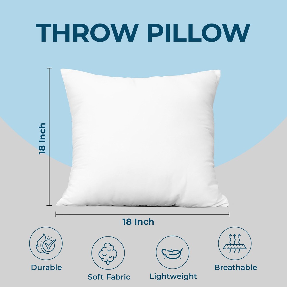 Throw Pillow Inserts - The pack of exceptional quality pillows is expertly woven and sewn to perfection. Vacuum Packaging - Our pillow inserts are compressed packed due to shipping purpose, it might appear as one large pillow. Measurements - Each expertly designed pillow measures 18 by 18 inches Polyester Fiber Filling – The pillows are fabricated with quality yarns and filled with siliconized fibers to avoid a hollow or shallow appearance. Plush And Resilient- The pillows are soft and plush, and delicate the touch of a wonderful experience while ensuring lasting durability. Care Instructions - It is recommended to spot clean the pillow or hand wash the fabric