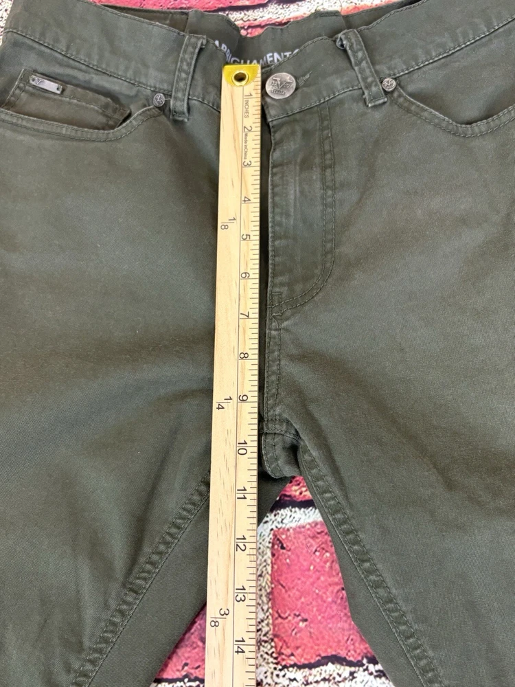 Versace V 1969 Italia jeans for men in green, size 36 x 32. These slim-fit denim jeans feature a mid-rise, bootcut style with a distressed acid wash. They have a 5-pocket design with button and zipper accents, and are made of stretchy cotton fabric. The jeans are machine washable and suitable for all seasons.