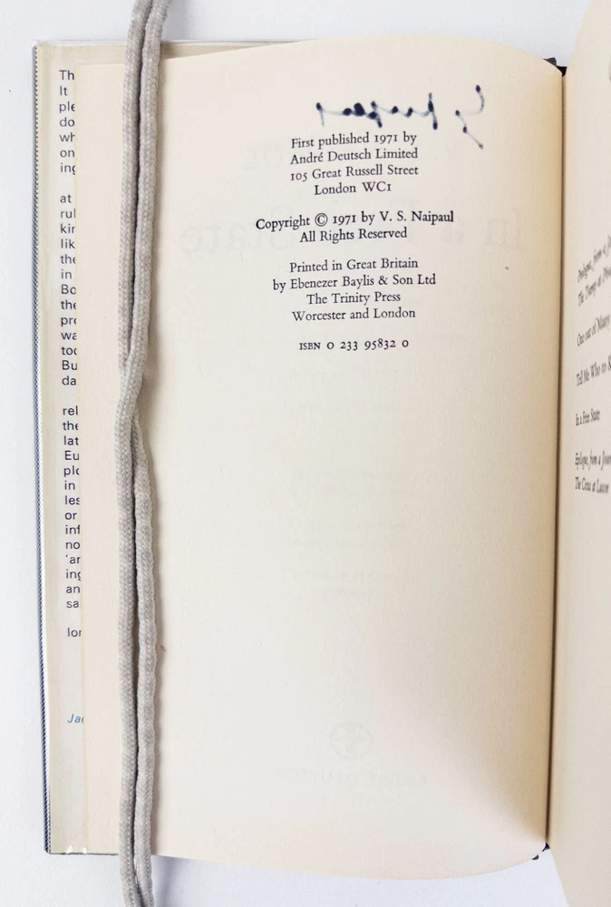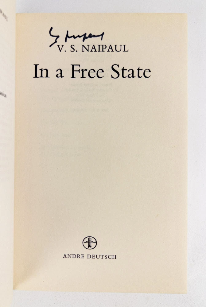 IN A FREE STATE [Signed] Author: Naipaul, V.S. Title: IN A FREE STATE [Signed] Publication: London, UK: Andre Deutsch, 1971 Edition: First U.K. Edition, First Printing Description: Octavo, 256 pages. In Very Good condition with a Very Good condition dust jacket. Gray spine with black and blue lettering. Dust jacket is wrapped in a mylar covering, price uncut "£1.75 net U.K. only", has mild shelving wear. Boards have mild bending wear along the spine head and tail edges and fore corners, and a dent along the front tail edge. Textblock has light adhesive stains along the pastedown pages and end-pages, mild creasing on pages 17 and 25, small stain on page 125, and mild shelving wear along the edges. Signed flat by V.S. Naipaul on the title page. DL consignment. Shelved in Room C. Seller ID: 1392366 Subject: Literature Welcome to the eBay store of Second Story Books! DC's Oldest Rare and Used Bookstore, Second Story Books operates two open shops in the Washington D.C. metropolitan area. We have an extensive internet presence and provide accredited appraisals member ASA. This listing was created by Bibliopolis.