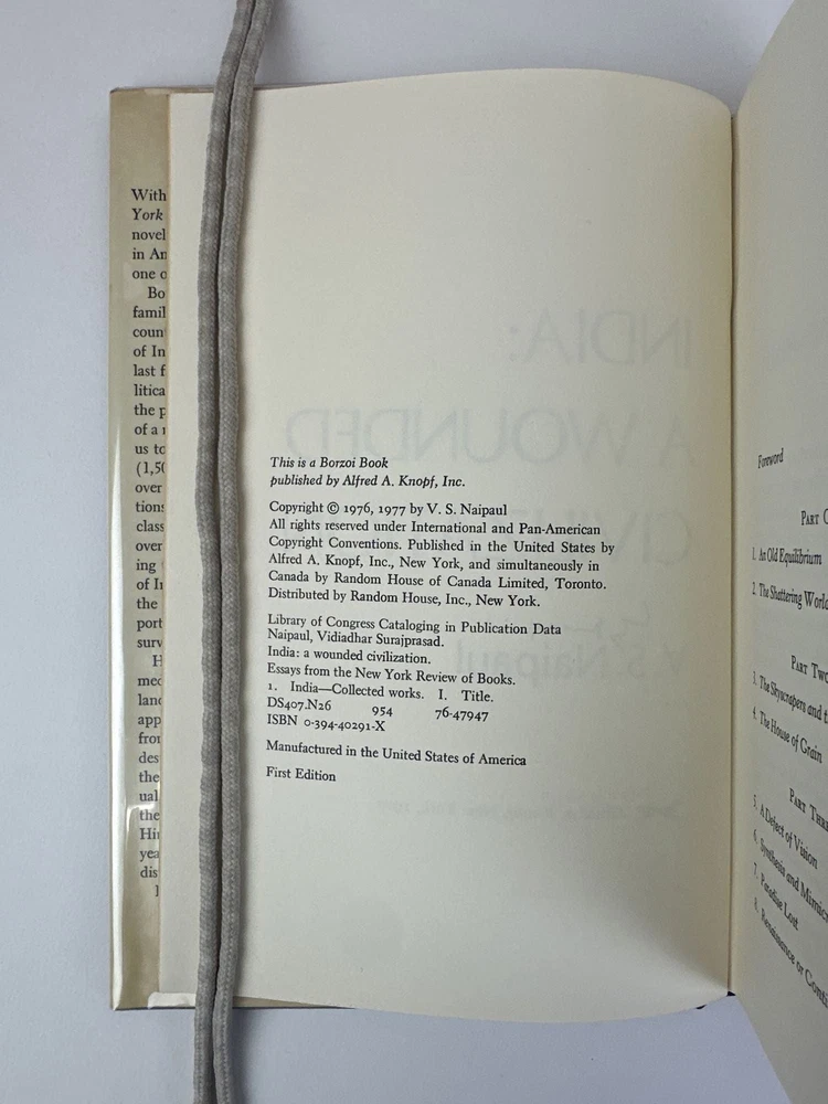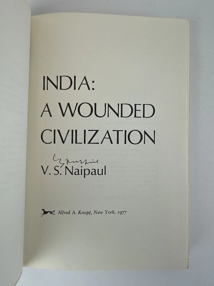 INDIA: A WOUNDED CIVILIZATION [Signed] Author: Naipaul, V.S. Title: INDIA: A WOUNDED CIVILIZATION [Signed] Publication: New York, NY: Alfred A. Knopf, 1977 Edition: First American Edition, First Printing Description: Octavo, xi, 191 pages. In Very Good minus condition with a Very Good minus condition. Blue spine with a green rectangle containing black and gold lettering. Dust jacket is wrapped in a mylar covering, price is uncut "$7.95", mild shelving wear, stains on the rear cover, mild bending wear along the spine head edge, and mild age-toning throughout. Boards have mild age-toning along the head and tail edges, a dent on the front fore edge, a stain on the rear board, and mild wear along the spine. Textblock has mild wear along the edges and light foxing along the head edge. Signed flat by V.S. Naipaul on the title page. DL consignment. Shelved Room C. Seller ID: 1392478 Subject: Asian History & Culture Welcome to the eBay store of Second Story Books! DC's Oldest Rare and Used Bookstore, Second Story Books operates two open shops in the Washington D.C. metropolitan area. We have an extensive internet presence and provide accredited appraisals member ASA. This listing was created by Bibliopolis.