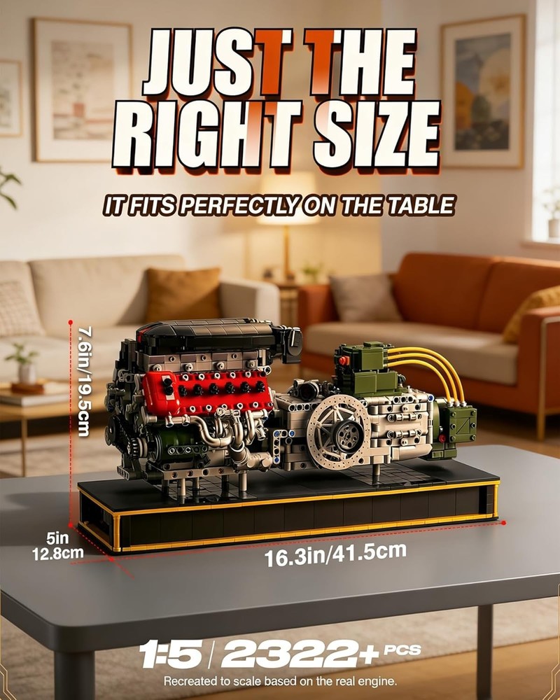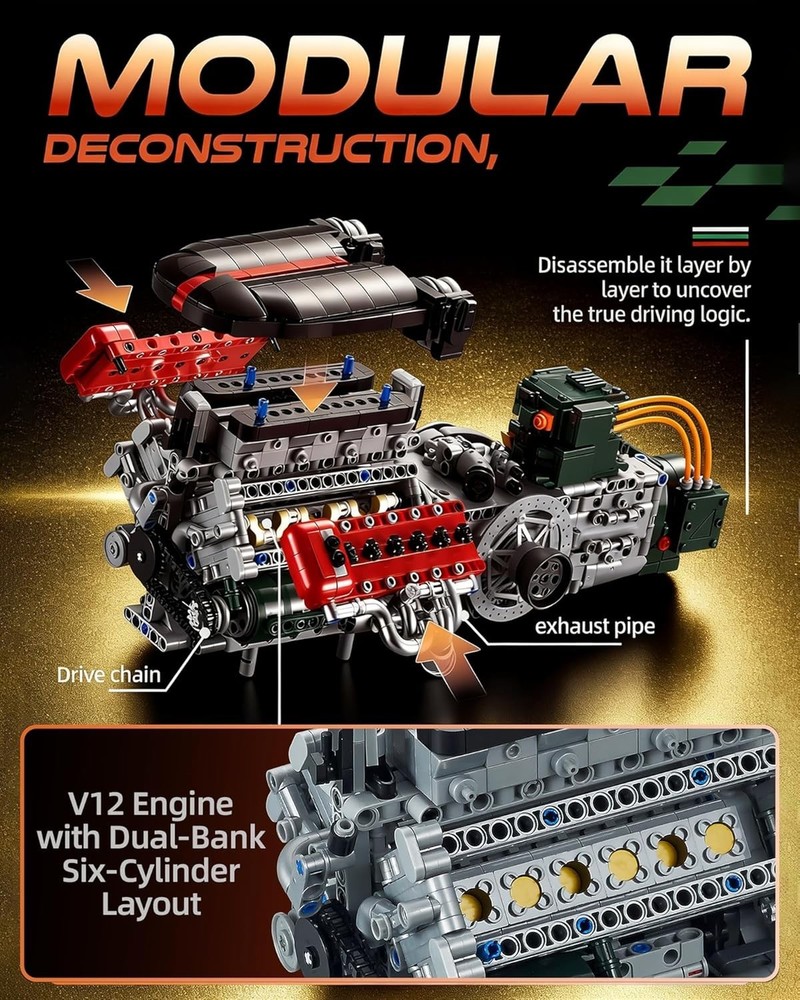 【Realistic V12 Engine Building Kit】 Measured 16.3*5*7.6 in(L*W*H) and 1:5 scale model of a high-performance V12 engine with 2322 pieces, this V12 engine building kit features moving pistons, a rotating crankshaft, and a belt-driven system that mimics the mechanical operation of a real V12 engine. 【Power It Up & Watch It Run】 Compatible with technic engine building set, included L-motor and battery box (requires 6 AAA batteries, not included), this is a fully functional V12 engine kit that runs, with a smooth, rhythmic motion that showcases the engine’s internal workings. 【Build your Own Engine Model】Designed for adults and teens 14+, this challenge engine kit offers a rewarding building experience. Perfect for technic hobbyists, engineers, and car enthusiasts to understand engine mechanics while enjoying a satisfying, screen-free project. 【Fun Building Challenge】 Once assembled, this stunning model becomes an impressive desktop showcase. With its premium design and a stable base—from the carefully crafted components to the dynamic motion—it’s a conversation-starting piece for your office, workshop, or man cave. 【Collectible Gift】 Come with clear and step-by-step instructions to guide you through the assembly. No special tools needed—just your creativity and passion for mechanical wonders. MOCBROPCS are here to provide professional service. The V12 Engine Model Kit is a detailed replica of a car engine that allows you to build your own mini engine model. With 1366 pieces made of plastic, this kit is designed for adult hobbyists and enthusiasts. It requires 1 lithium ion battery and comes with an instruction guide for assembly. The compact package dimensions of 11.8 x 8.66 x 3.94 inches make it easy to store and transport. Made in the United States, this engine model kit is a fun and challenging project for anyone interested in car-themed projects.