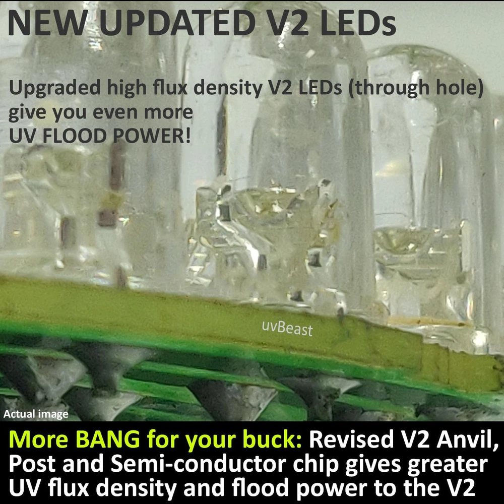 WHY UVBEAST VERSION 2? The most powerful and best regarded UV flashlight in its class just got more powerful! Everything you loved about the original version but more! More power, more range, better build and an upgraded UV beam makes this an even better investment. PRO TIP: Anyone can claim superior UV, but ask them to prove it. We can and have on this listing. IF IT DOESN’T HAVE OUR NAME IT’S NOT THE SAME EVEN MORE POWER. **UPGRADED New V2 LED chips (through-hole) for 2020/21. Unlike others we’ve pushed the envelope. Larger newer LED chips makes the uvBeast even more of a monster. The UV output is even more awesome than before, so we’ve included glasses with great optics to tame this beast a little! EVEN MORE UV SPREAD. Remember the difference between regular TV and wide screen? You’ll see a whole lot more at once. A wider angle of UV floodlight will do your job that much better. Don’t just take our word for it, everybody says so EVEN MORE RANGE. UV range makes a big difference. Do you want your UV to go a few feet ahead or tens and tens of feet ahead? Well with Version 2 we tested UV dye out at 90 feet, successfully! See the pictures on this listing. We think it can do more EVEN BETTER UV QUALITY. uvBeast Version 2 has upgraded high definition UV as compared to other market examples, making this the UV Flashlight you wished you always had. It really does leave others for dust. No brag. It is what it is. We were asked by well-known government agencies to enhance the original uvBeast. So we did. And it’s now available to you Product Description THIS IS uvBeast V2 UV FLOOD POWER. Make no mistake. The uvBeast Brand uvBeast is a unique brand. We’re scientists (PhDs) and engineers (C.Eng) by background backed with years in industry. With an awesome reputation in both domestic and commercial markets, we don’t do “me too” product imitations. Instead we like to innovate and make a genuine difference. This really isn’t just another Black Light or UV Flashlight The uvBeast Pedigree uvBeast created the King of UV flashlights. with the V1. Users got fed up with weaker UV flashlights. They asked for more UV power. So, we got to work with the V1. Then users asked for even more UV Flood power. And so came the V2! uvBeast Market Adoption uvBeast currently serve commercial applications and industry sectors in NDT (Non-destructive Testing), Aviation, Oil & Gas, Automotive, Adhesive curing, Manufacturing, Hospitality, Fishing, Mining, Agriculture, Hygiene-level monitoring, and more. Everybody likes it when commercial-grade high power UV comes onto the domestic scene! The uvBeast Formula Designed for long-range & high power applications V2 Flood beam effect UV Adjusted wavelength specifically suited for many domestic & commercial uses Capable under interior/ambient lighting Complete control & line-of-sight of our entire supply chain from raw materials to manufacturing uvBeast VERSION 2 [V2]. THE HIGHLY REGARDED AND BIG POWER UV FLASHLIGHT IN ITS CLASS JUST GOT EVEN MORE POWERFUL Since release of the Original Version (V1) a while back, uvBeast demand grew so strong and feedback so positive that people asked for more! (see our feedback). Since then many copycats, look-a-likes, and clones appeared so we got to work again. Enter the V2. We didn't imitate. We innovated WHAT’S IN VERSION 2 UPDATED 385-395nm UV LED semi-conductor BIG V2 chips (through-hole) - to keep you up-to-date with our latest tech. It’s been inspired by industry users having the original V1 uvBeast. Simply put, the V2 has more power, more intensity, more range, and a better quality UV flood beam (385-395nm with more useable UV). (See information on this page) NOW HIGHER POWER UV FLOOD With larger updated V2 LED semi-conductor chips (through-hole), and better optics, you now have an even higher definition UV flood that you won’t find in other models. You’ll get more useable UV light for your money and better results. So much so, that we’ve had to include optimized spectrum transmission UV glasses to prevent any eye fatigue that comes with this kind of UV power! It really isn’t a marketing gimmick WE NAILED IT We’ve already rolled this out to an early group of professionals and enthusiasts who are hard to please! We got a strong thumbs-up, which means that you won’t be making a blind investment CLAIM TO FAME? Producing a high intensity UV beam isn’t easy. Especially a UV flood beam with a long throw range, and a quality beam in the UV spectrum to match, into one flashlight! It’s big league and commercial class. Ever since our focus began on a higher level and brand of UV flashlight with the original V1 uvBeast, many now claim the same. Fair enough. As long as those claims are true. Anyone can draw up a nice chart and write down impressive specifications. We get that. So instead, we show-and-tell what the uvBeast Version 2 is capable of (see information on this page) Take a look and you decide if it’s time to upgrade into a higher class of ultraviolet light Everybody loves it when commercial-setting professional grade UV comes your way. WE DON'T IMITATE. WE INNOVATE We’ve worked in the industry. We know it well. Unlike others, our business model isn't a copycat model that shifts mass market relabeled generic LEDs The problem with flashlights is the common practice of copying and cloning with sub-par components (LEDs) that just don't hit the mark The market is full of fly-by-night or non-expert sellers who often procure from dubious and non-verified sources. Cloned or copied LEDs just aren't the same We take great pride in our manufacturing & quality. We control our supply chain from sourcing raw materials, manufacturing, assembly, and distribution. We have total-line-of-sight. The problem with middle men or vendors who only buy from others to sell to you, is that quality along with high performance isn't really within their gift WE CONTROL OUR ENTIRE SUPPLY CHAIN FROM RAW MATERIALS TO MANUFACTURE