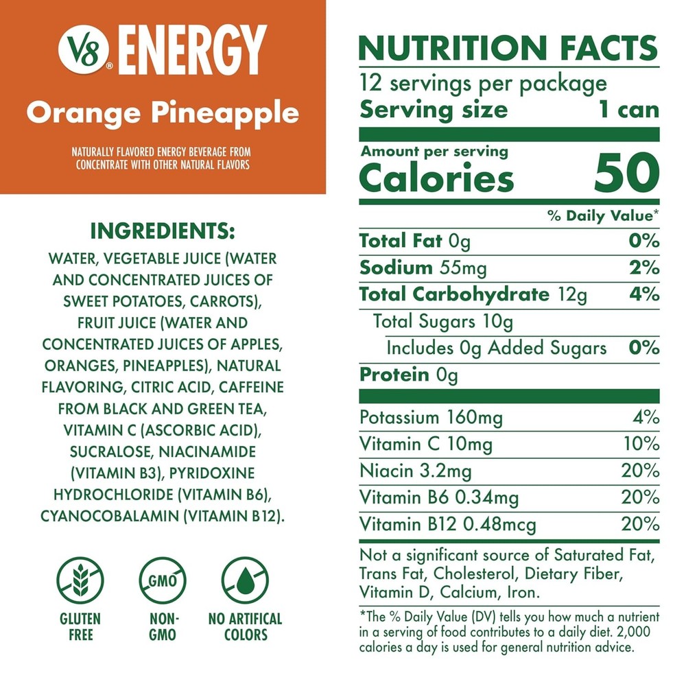 Free eBay listing template designed by dewiso.com V8 Energy Orange Pineapple Energy Drink, 8 fl oz Can (12 Pack) FREE AND FAST SHIPPING! About this item Twelve (12) 8 fl oz cans of V8 Energy Orange Pineapple Energy Drink A orange pineapple flavored energy drink with no added sugar* (*Not a low calorie food; see nutrition panel for sugar and calorie content) Supports focus and Steady Energy; contains 80 milligrams of caffeine – comparable to a cup of coffee A refreshing beverage with 50 calories and 12 grams of carbs per can; an excellent source of B Vitamins Contains 1 combined serving of veggies and fruits. Non-GMO, and gluten free. Product We offer a 30-Day Return Policy on items which you are not completely satisfied with. You have the option for a full-refund or an exchange of the item. No returns are available on items shipped outside of the US . Shipping We offer Free Shipping to the US and ship within 2 business days of payment, usually sooner. We use UPS express shipping. That's why your products are usually delivered within 3 days . Contact We try our very best to make sure every customer is completely satisfied. If there's a problem , message us! We're happy to help. 24/7 live chat available.